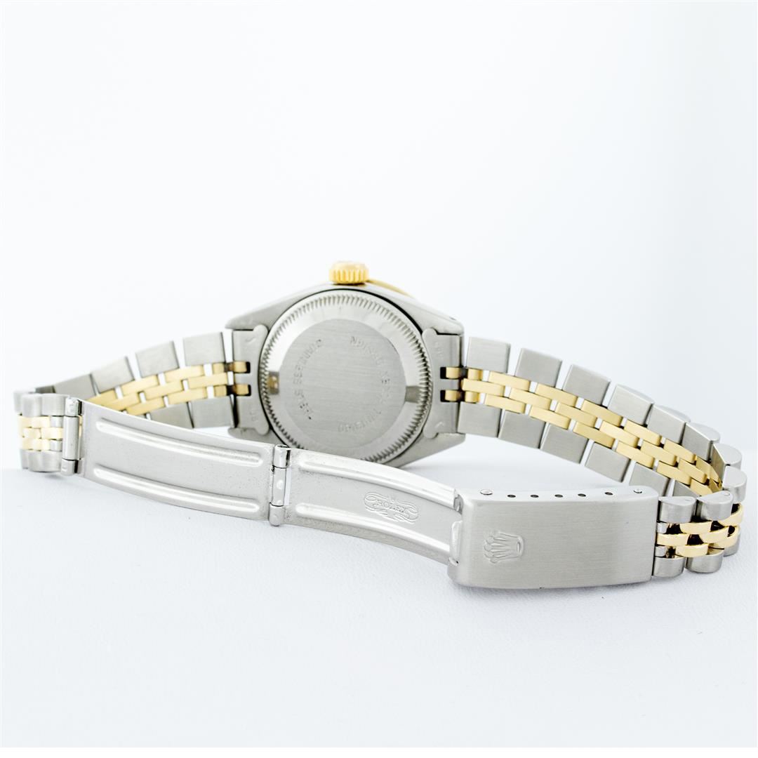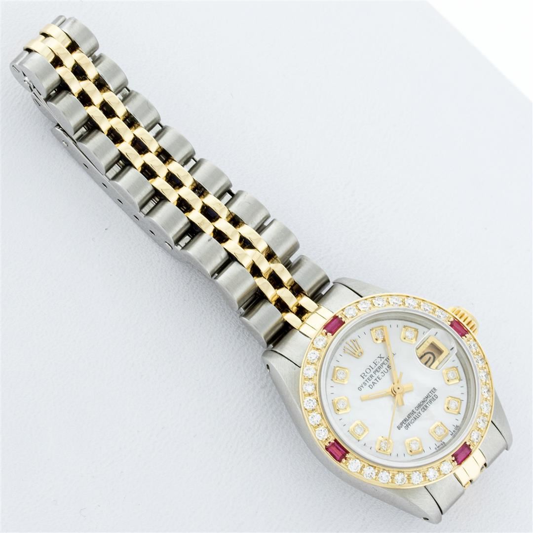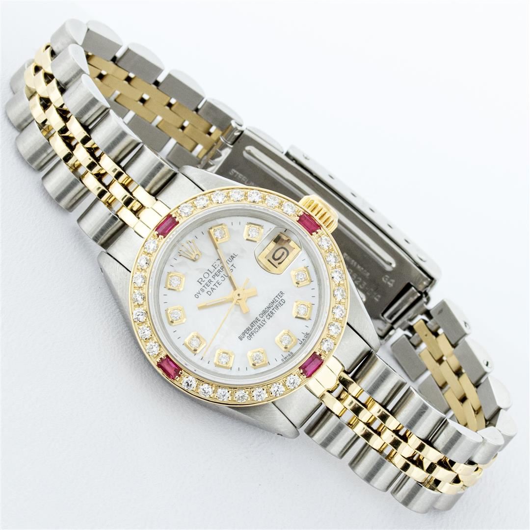One Ladies Pre Owned Two Tone Rolex Datejust Polished, Serviced & Electronically Tested, Yellow Gold & Stainless Steel Case: 26mm, Yellow Gold Crown, Custom Bezel: New 18K Yellow Gold Ruby Beadset Diamond Bezel, Diamond + Gem Count: 28 Diamonds + 4 Rubies