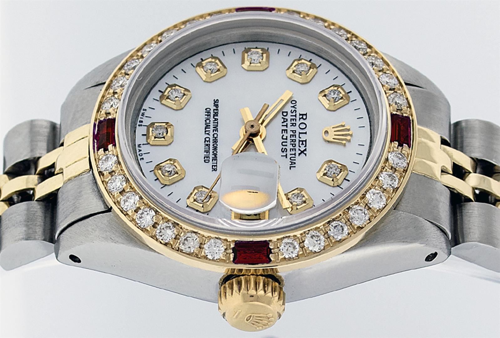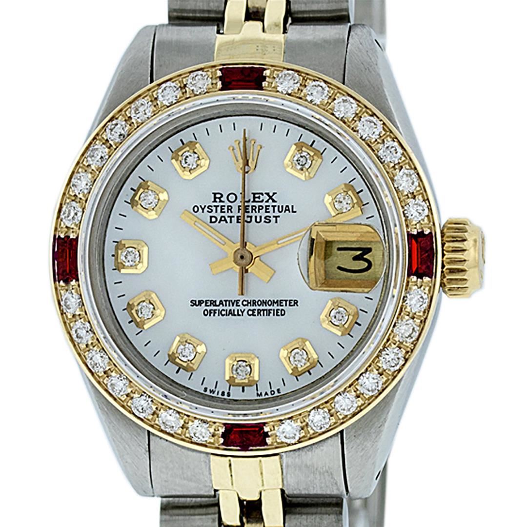 One Ladies 14K Two Tone Rolex Datejust Polished, Serviced & Electronically Tested, 14K Yellow Gold & Stainless Steel Case: 26mm, 14K Yellow Gold Crown, Custom Bezel: New 18K Yellow Gold Ruby Beadset Diamond Bezel, Diamond + Gem Count: 28 Diamonds + 4 Rubies Total Weight .70 Carat, Clarity: Si-VS, Color: G to H. Custom Crystal: New Scratch Resistant Synthetic Sapphire Cyclops Lens. Custom Hands: New Luminescent Hands. Movement: Automatic Winding Movement Caliber 2030. Custom Dial: Mother Of Pearl Set With Diamond Hour Markers & Dash Track, Diamond Count: 10 Diamond in Dial, G To H In Color, SI-VS Clarity. Date Window: 3 O'Clock Position Date Display, Model: Datejust, Condition: G-6 Extra Fine. Bracelet: Two Tone 14K Yellow Gold & Stainless Steel Jubilee Band. Bright Polish. 6.0 Inch Length, Adjustable. Standard Clasp, With Rolex Logo. This Watch Has Been Serviced Time Tested And Is In Excellent Condition It Is Free Of All Scratches And Dents.