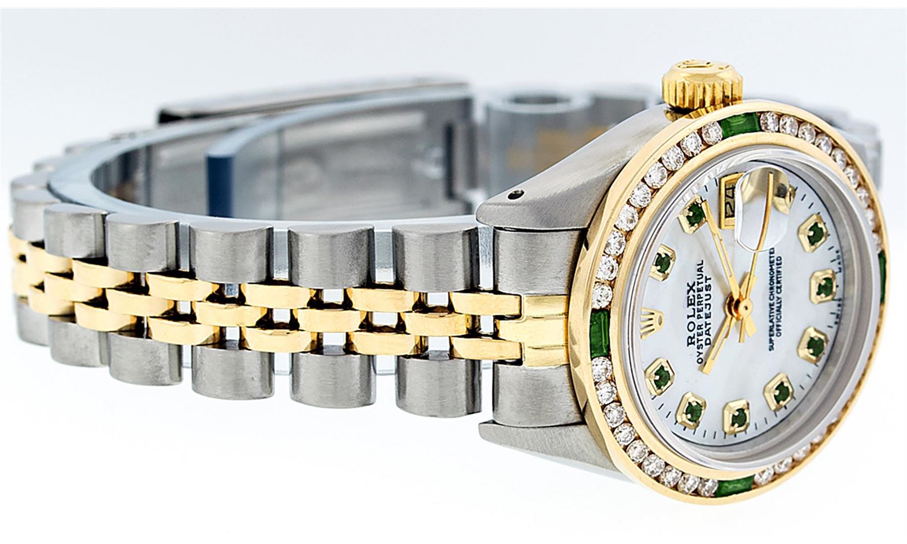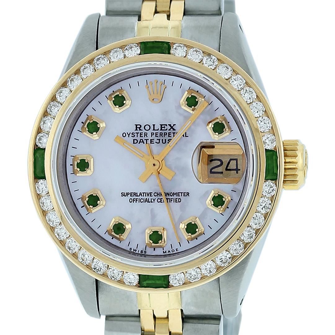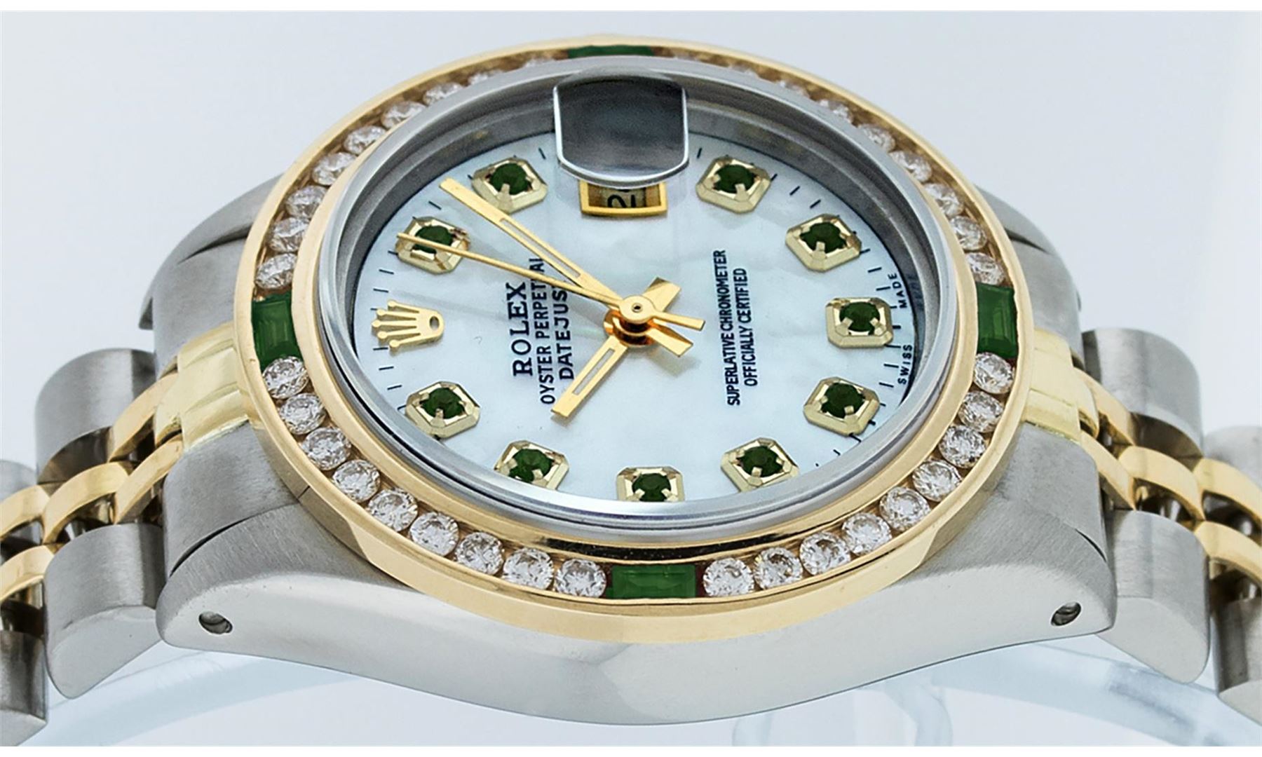 One Ladies Two Tone Rolex Datejust Polished, Serviced & Electronically Tested, Yellow Gold & Stainless Steel Case: 26mm, Yellow Gold Crown, Custom Bezel: New 18K Yellow Gold Emerald Channel Set Diamond Bezel, Diamond + Gem Count: 36 Diamonds + 4 Emeralds, Total Weight 1.00 Carat, Clarity: SI-VS, Color: G to H. Custom Crystal: New Scratch Resistant Synthetic Sapphire Cyclops Lens. Custom Hands: New Luminescent Hands. Movement: Automatic Winding Movement. Custom Dial: Mother Of Pearl with Emerald Hour Markers And Dash Tracks, Stone Count: 10 Emeralds In Dial. Date Window: 3 O'Clock Position Date Display, Model: Datejust, Condition: G-6 Extra Fine. Bracelet: Two Tone Yellow Gold & Stainless Steel Jubilee Band. Bright Polish. 6.0 Inch Length, Adjustable. Standard Clasp, With Rolex Logo. This Watch Has Been Serviced Time Tested And Is In Excellent Condition It Is Free Of All Scratches And Dents.
