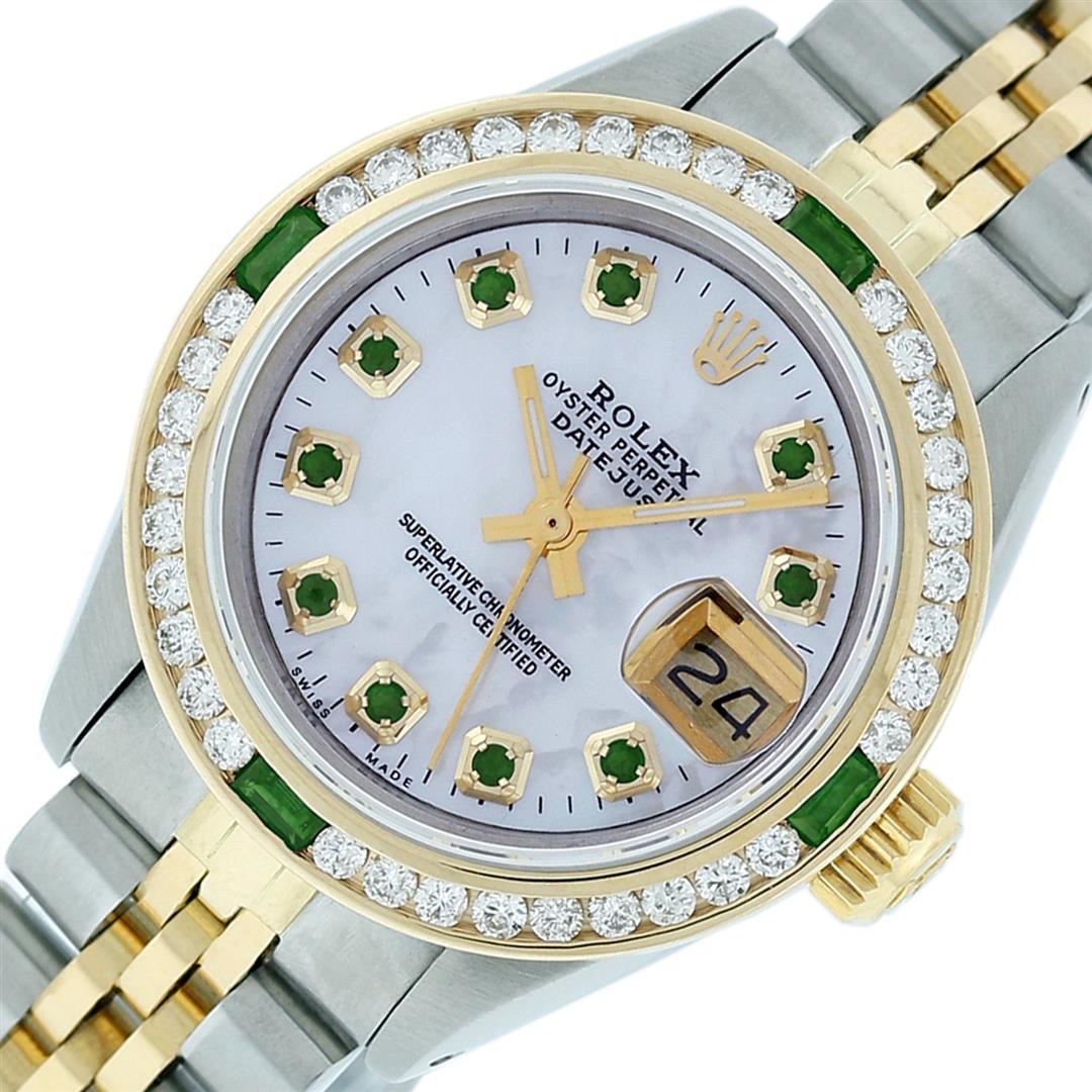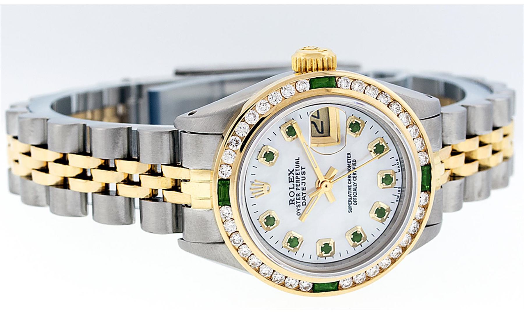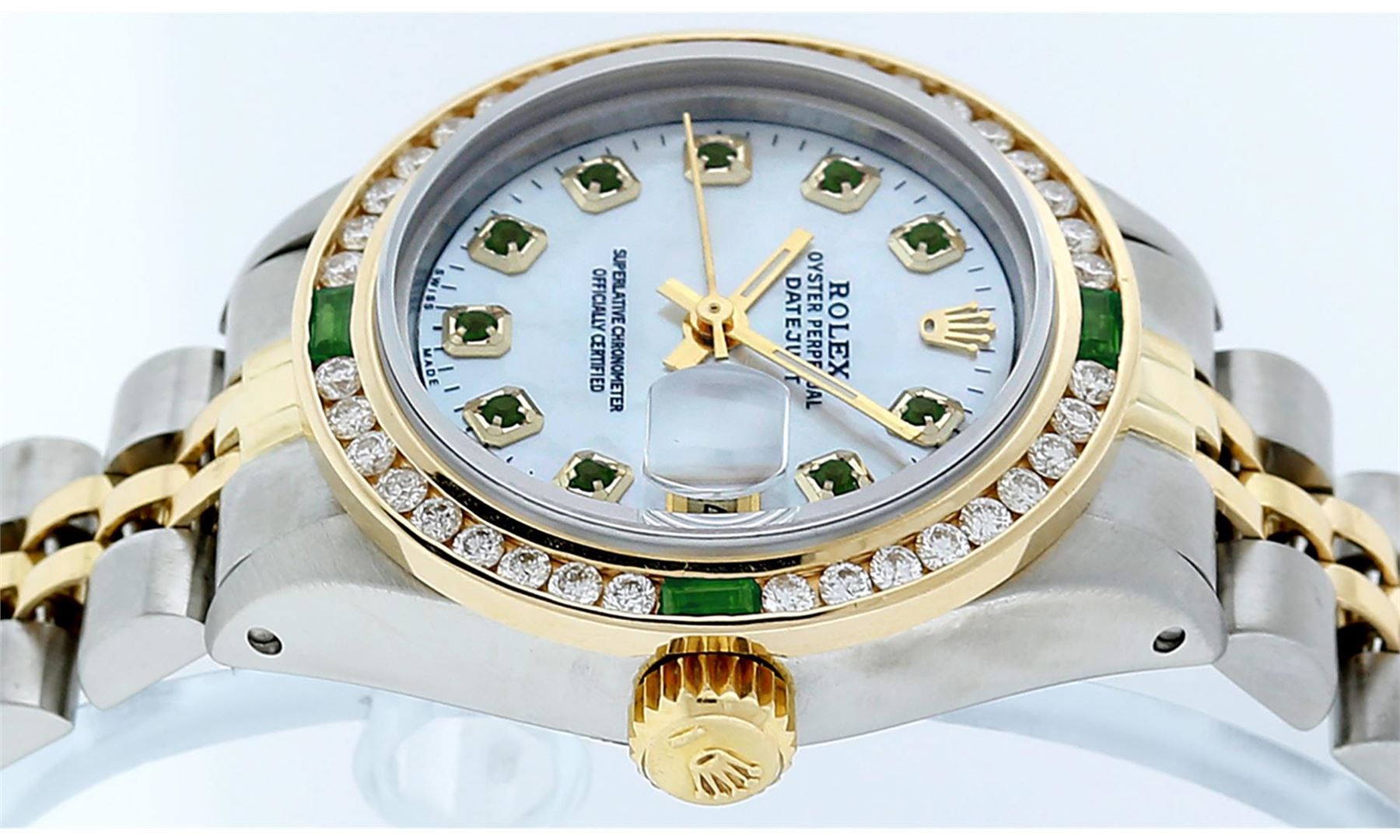 One Ladies Two Tone Rolex Datejust Polished, Serviced & Electronically Tested, Yellow Gold & Stainless Steel Case: 26mm, Yellow Gold Crown, Custom Bezel: New 18K Yellow Gold Emerald Channel Set Diamond Bezel, Diamond + Gem Count: 36 Diamonds + 4 Emeralds, Total Weight 1.00 Carat, Clarity: SI-VS, Color: G to H. Custom Crystal: New Scratch Resistant Synthetic Sapphire Cyclops Lens. Custom Hands: New Luminescent Hands. Movement: Automatic Winding Movement. Custom Dial: Mother Of Pearl with Emerald Hour Markers And Dash Tracks, Stone Count: 10 Emeralds In Dial. Date Window: 3 O'Clock Position Date Display, Model: Datejust, Condition: G-6 Extra Fine. Bracelet: Two Tone Yellow Gold & Stainless Steel Jubilee Band. Bright Polish. 6.0 Inch Length, Adjustable. Standard Clasp, With Rolex Logo. This Watch Has Been Serviced Time Tested And Is In Excellent Condition It Is Free Of All Scratches And Dents.