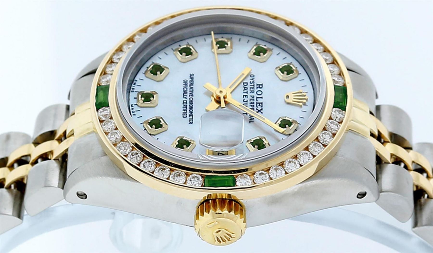 One Ladies Two Tone Rolex Datejust Polished, Serviced & Electronically Tested, Yellow Gold & Stainless Steel Case: 26mm, Yellow Gold Crown, Custom Bezel: New 18K Yellow Gold Emerald Channel Set Diamond Bezel, Diamond + Gem Count: 36 Diamonds + 4 Emeralds, Total Weight 1.00 Carat, Clarity: SI-VS, Color: G to H. Custom Crystal: New Scratch Resistant Synthetic Sapphire Cyclops Lens. Custom Hands: New Luminescent Hands. Movement: Automatic Winding Movement. Custom Dial: Mother Of Pearl with Emerald Hour Markers And Dash Tracks, Stone Count: 10 Emeralds In Dial. Date Window: 3 O'Clock Position Date Display, Model: Datejust, Condition: G-6 Extra Fine. Bracelet: Two Tone Yellow Gold & Stainless Steel Jubilee Band. Bright Polish. 6.0 Inch Length, Adjustable. Standard Clasp, With Rolex Logo. This Watch Has Been Serviced Time Tested And Is In Excellent Condition It Is Free Of All Scratches And Dents.