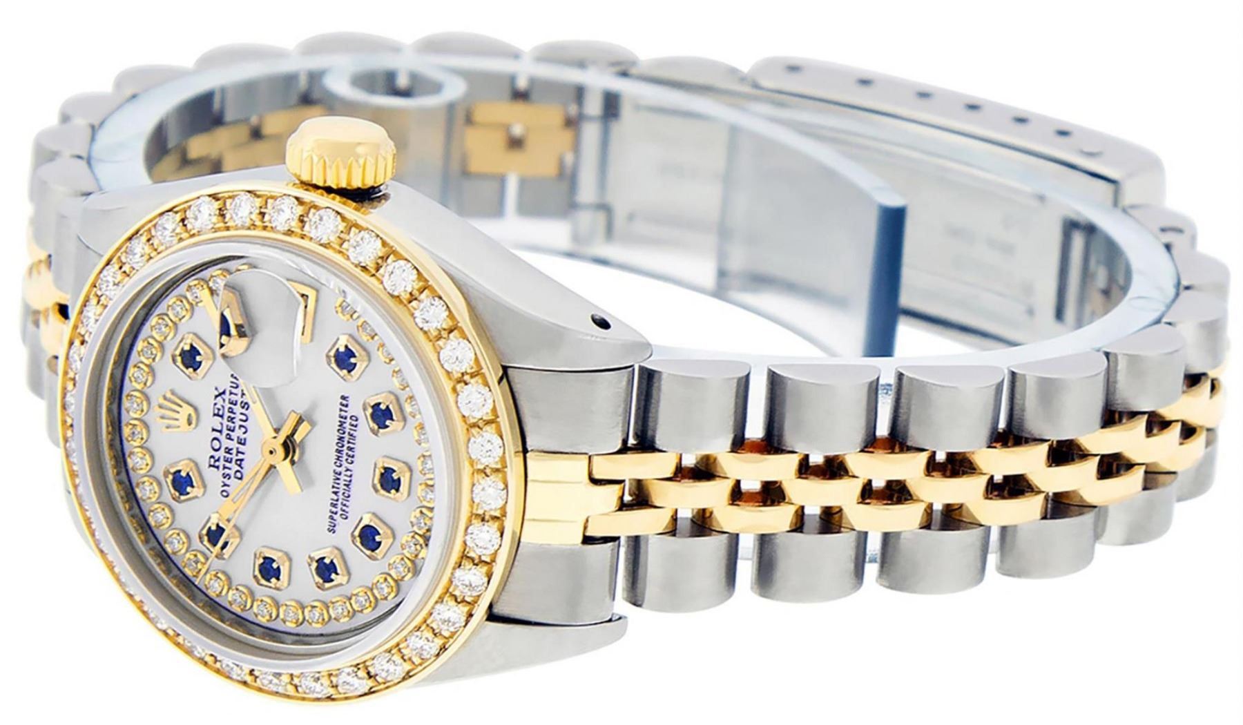 One Ladies Two Tone Rolex Datejust Polished, Serviced & Electronically Tested, Yellow Gold & Stainless Steel Case: 26mm, Yellow Gold Crown, Custom Bezel: New 18K Yellow Gold Beadset Diamond Bezel, Diamond Count: 32 Diamonds In Bezel, Total Weight .70 Carat, Clarity: SI-VS, Color: G to H. Custom Crystal: New Synthetic Sapphire Cyclops Lens. Custom Hands: New Luminescent Hands. Movement: Automatic Winding Movement. Custom Dial: Mother Of Pearl Emerald String Diamond Dial, Stone Count: 10 Emeralds + 33 Diamonds In Dial. Clarity: SI-VS, Color: G to H. Date Window: 3 O'Clock Position Date Display, Model: Datejust. Condition: G-6 Extra Fine. Bracelet: Two Tone Yellow Gold & Stainless Steel Jubilee. Bright Polish. 6.0 Inch Length, Adjustable. Standard Clasp, With Rolex Logo. This Watch Has Been Serviced Time Tested And Is In Excellent Condition It Is Free Of All Scratches And Dents.