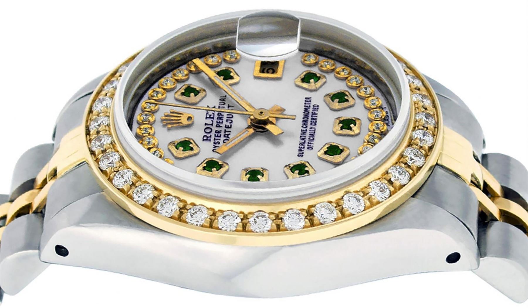 One Ladies Two Tone Rolex Datejust Polished, Serviced & Electronically Tested, Yellow Gold & Stainless Steel Case: 26mm, Yellow Gold Crown, Custom Bezel: New 18K Yellow Gold Beadset Diamond Bezel, Diamond Count: 32 Diamonds In Bezel, Total Weight .70 Carat, Clarity: SI-VS, Color: G to H. Custom Crystal: New Synthetic Sapphire Cyclops Lens. Custom Hands: New Luminescent Hands. Movement: Automatic Winding Movement. Custom Dial: Mother Of Pearl Emerald String Diamond Dial, Stone Count: 10 Emeralds + 33 Diamonds In Dial. Clarity: SI-VS, Color: G to H. Date Window: 3 O'Clock Position Date Display, Model: Datejust. Condition: G-6 Extra Fine. Bracelet: Two Tone Yellow Gold & Stainless Steel Jubilee. Bright Polish. 6.0 Inch Length, Adjustable. Standard Clasp, With Rolex Logo. This Watch Has Been Serviced Time Tested And Is In Excellent Condition It Is Free Of All Scratches And Dents.