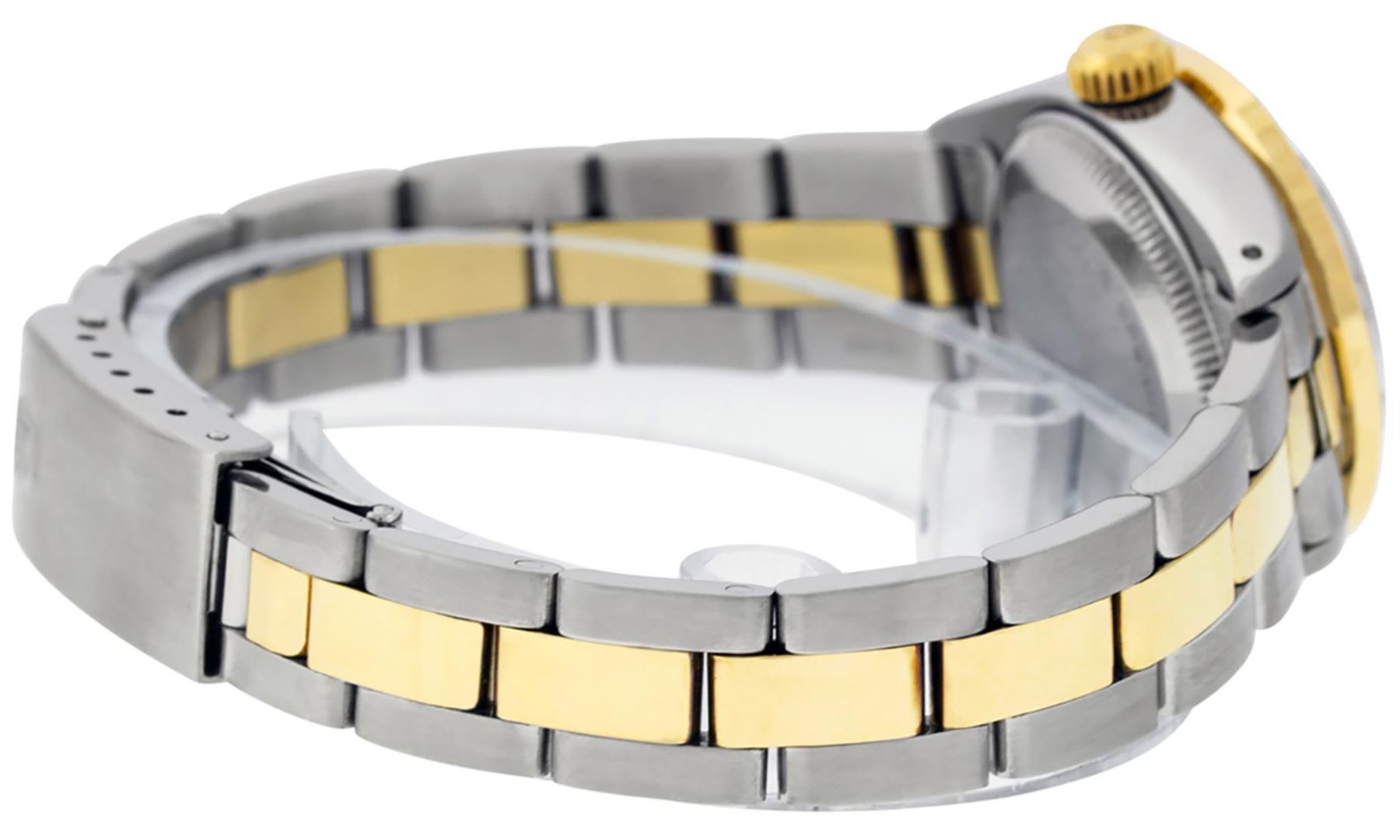 One Ladies Two Tone Rolex Datejust Polished, Serviced & Electronically Tested, Yellow Gold & Stainless Steel Case: 26mm, Yellow Gold Crown, Custom Bezel: New 18K Yellow Gold Pyramid Diamond Bezel, Diamond Count: 24 Diamonds In Bezel. Total Weight .50 Carat, Clarity: SI-VS, Color: G to H. Custom Crystal: New Synthetic Sapphire Cyclops Lens. Custom Hands: New Luminescent Hands. Movement: Automatic Winding Movement. Custom Dial: Mother Of Pearl With Synthetic Emeralds, Stone Count: 2 Synthetic Emeralds. Date Window: 3 O'Clock Position Date Display, Model: Datejust. Condition: G-6 Extra Fine. Bracelet: Two Tone Yellow Gold & Stainless Steel Jubilee Band. Bright Polish. 6.0 Inch Length, Adjustable. Standard Clasp, With Rolex Logo. This Watch Has Been Serviced Time Tested And Is In Excellent Condition It Is Free Of All Scratches And Dents.