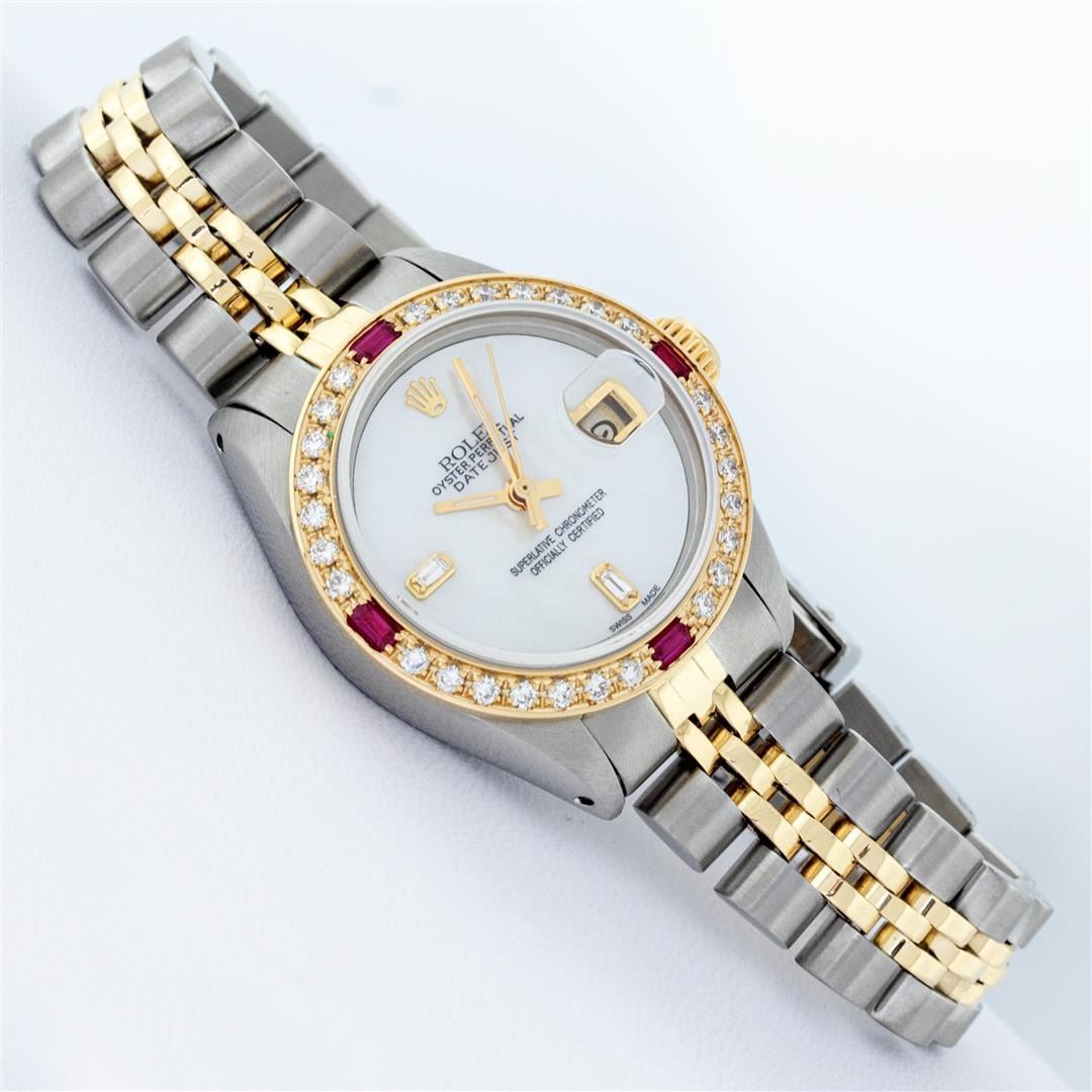 One Ladies Pre Owned Two Tone Rolex Datejust Polished, Serviced & Electronically Tested, Yellow Gold & Stainless Steel Case: 26mm, Yellow Gold Crown, Custom Bezel: New 18K Yellow Gold Sapphire Beadset Diamond Bezel, Diamond Count: 28 Diamonds + 4 Sapphire