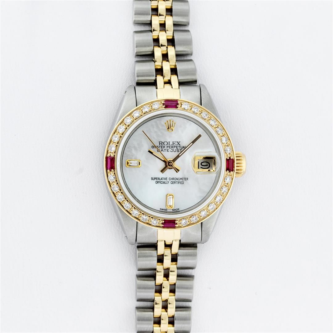 One Ladies Pre Owned Two Tone Rolex Datejust Polished, Serviced & Electronically Tested, Yellow Gold & Stainless Steel Case: 26mm, Yellow Gold Crown, Custom Bezel: New 18K Yellow Gold Sapphire Beadset Diamond Bezel, Diamond Count: 28 Diamonds + 4 Sapphire