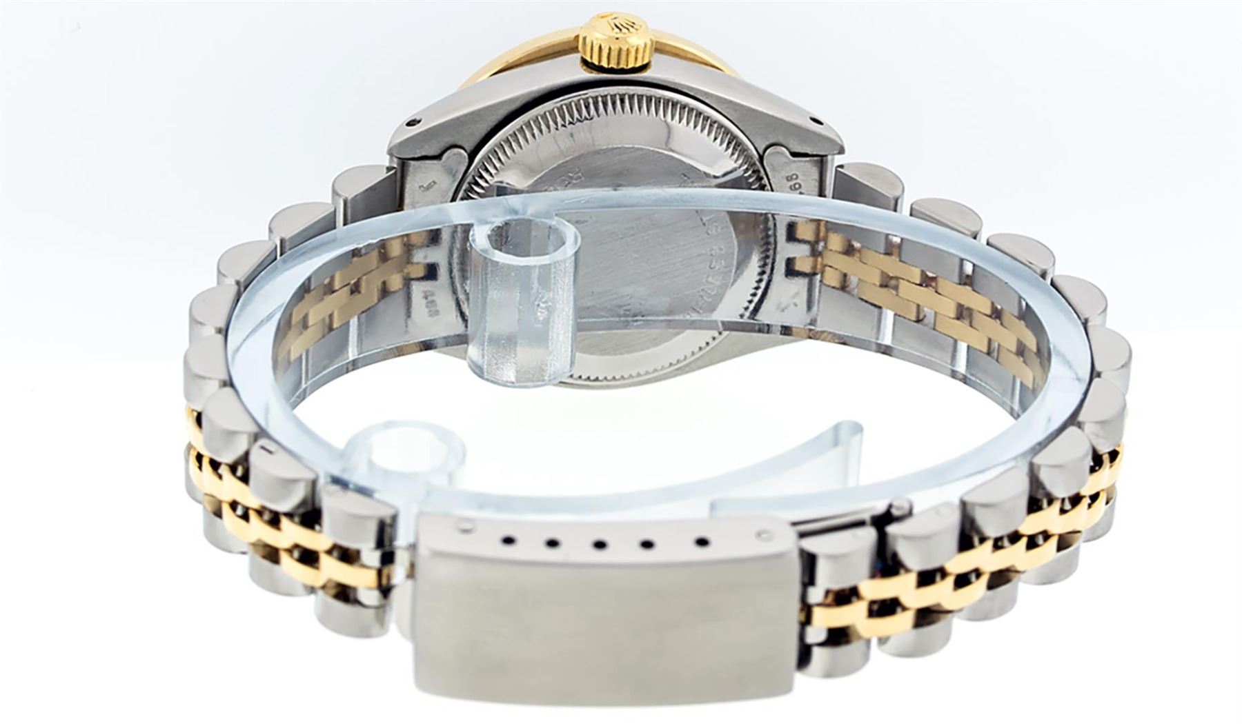 One Ladies Two Tone Rolex Datejust Polished, Serviced & Electronically Tested, Yellow Gold & Stainless Steel Case: 26mm, Yellow Gold Crown, Custom Bezel: New 18K Yellow Gold Ruby Channel Set Diamond Bezel, Diamond + Gem Count: 36 Diamonds + 4 Rubies Total Weight 1.00 Carat, Clarity: SI-VS, Color: G to H. Custom Crystal: New Synthetic Sapphire Cyclops Lens. Custom Hands: New Luminescent Hands. Movement: Automatic Winding Movement. Custom Dial: Mother Of Pearl with Ruby Hour Markers, Stone Count: 10 Rubies In Dial. Date Window: 3 O'Clock Position Date Display, Model: Datejust, Condition: G-6 Extra Fine. Bracelet: Two Tone Yellow Gold & Stainless Steel Jubilee. Bright Polish. 6.0 Inch Length, Adjustable. Standard Clasp, With Rolex Logo. This Watch Has Been Serviced Time Tested And Is In Excellent Condition It Is Free Of All Scratches And Dents.