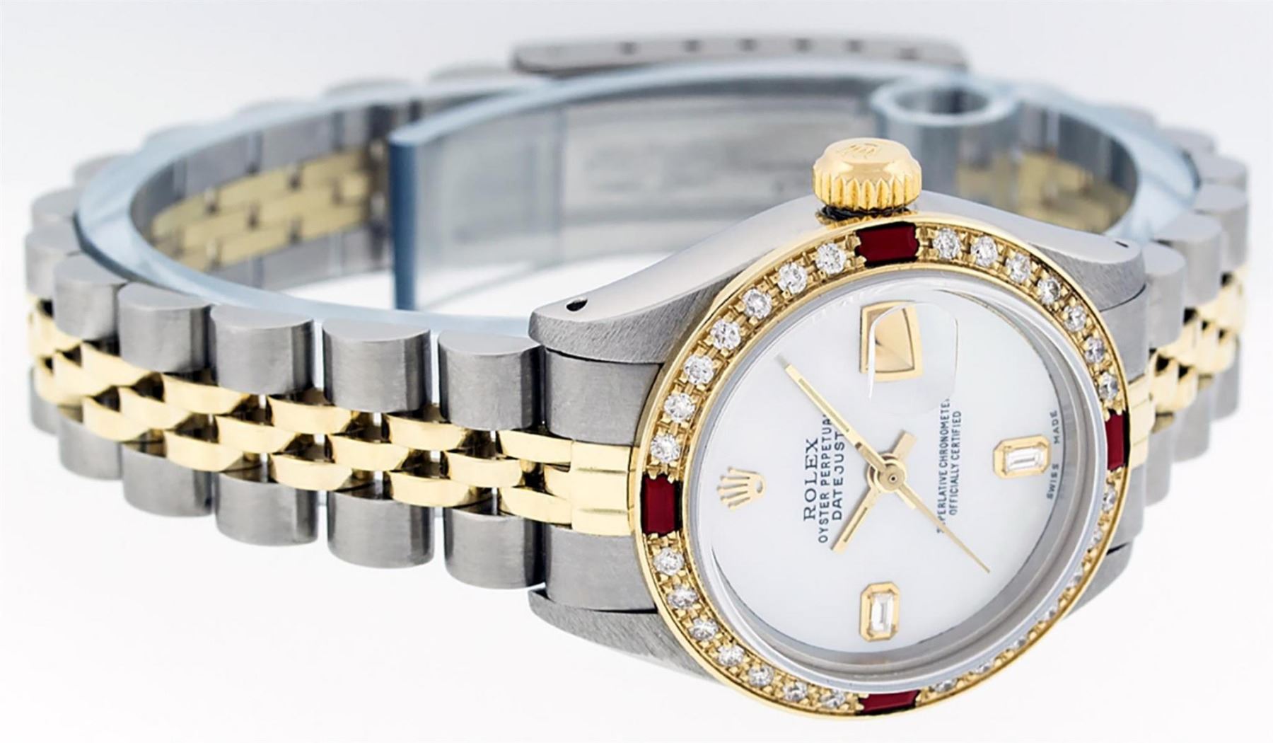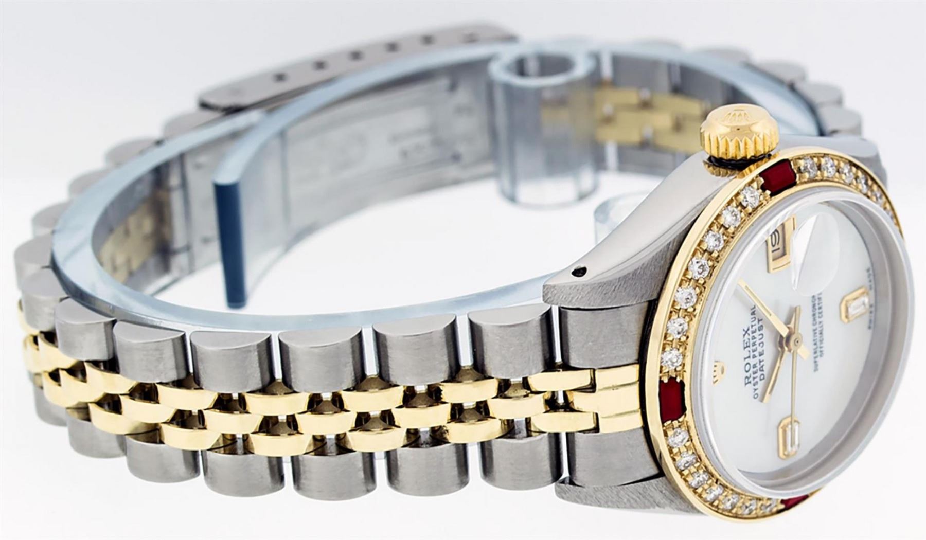 One Ladies Pre Owned Two Tone Rolex Datejust Polished, Serviced & Electronically Tested, Yellow Gold & Stainless Steel Case: 26mm, Yellow Gold Crown, Custom Bezel: New 18K Yellow Gold Sapphire Beadset Diamond Bezel, Diamond Count: 28 Diamonds + 4 Sapphire