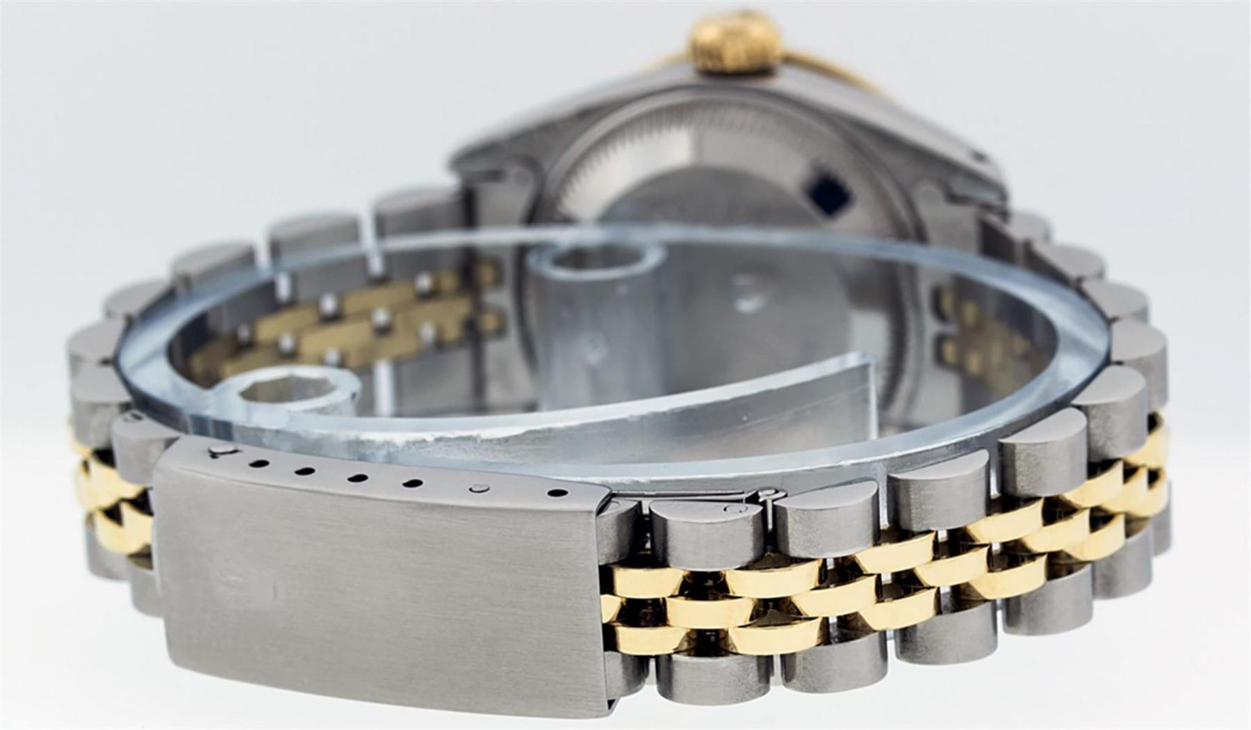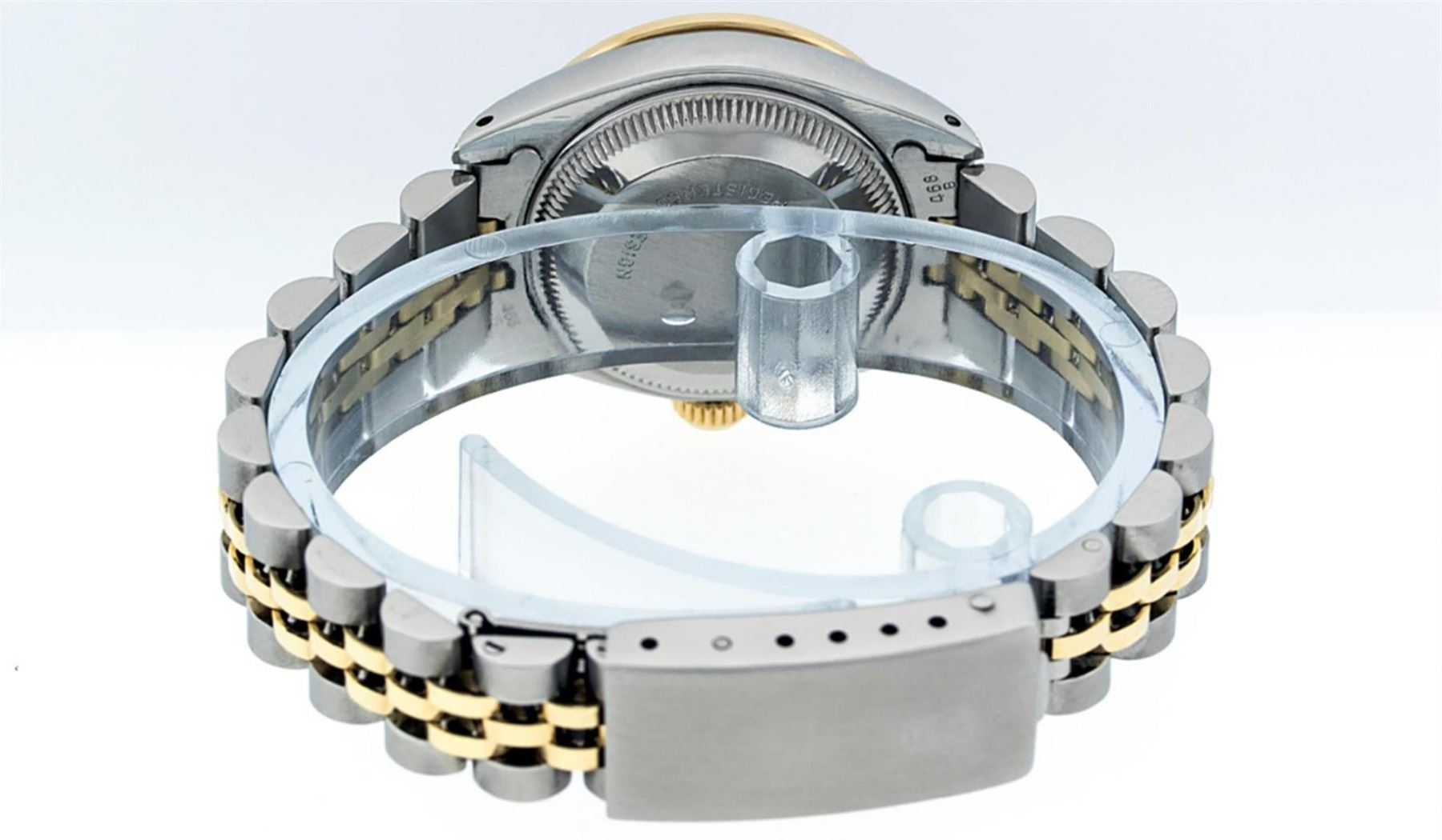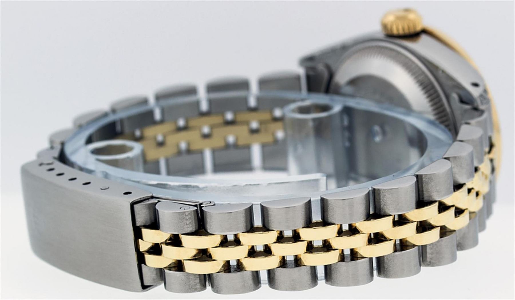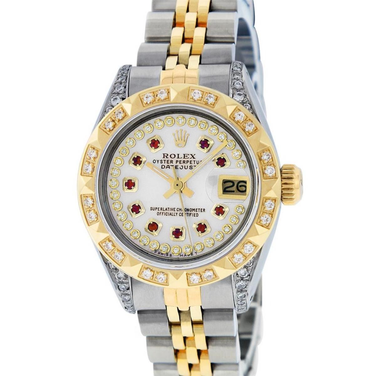 One Ladies Two Tone Rolex Datejust Polished, Serviced & Electronically Tested, Yellow Gold & Stainless Steel Case: 26mm, Yellow Gold Crown, Diamond Lugs: 24 Diamonds On Lugs, Clarity: SI-VS, Color: G to H, Clarity SI-VS. Custom Bezel: New 18K Yellow Gold Pyramid Diamond Bezel, Diamond Count: 24 Diamonds, Total Weight .50 Carat, Clarity: SI-VS, Color: G to H. Custom Crystal: New Synthetic Scratch Resistant Sapphire Cyclops Lens. Custom Hands: New Luminescent Hands. Movement: Automatic Winding Movement. Custom Dial: Mother Of Pearl With Ruby Hour Markers, Stone Count: 10 Rubies + 33 Diamonds In Dial, Clarity: SI-VS, Color: G to H. Date Window: 3 O'Clock Position Date Display, Model: Datejust. Condition: G-6 Extra Fine. Bracelet: Two Tone Yellow Gold & Stainless Steel Jubilee. Bright Polish. 6.0 Inch Length, Adjustable. Standard Clasp, With Rolex Logo. This Watch Has Been Serviced Time Tested And Is In Excellent Condition It Is Free Of All Scratches And Dents.