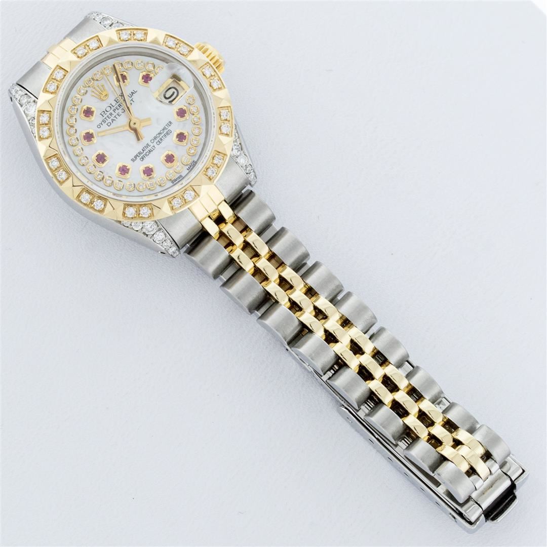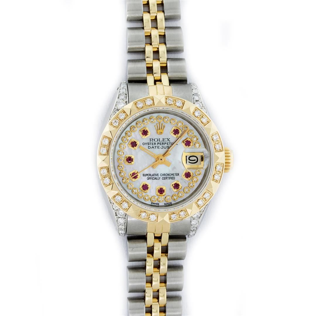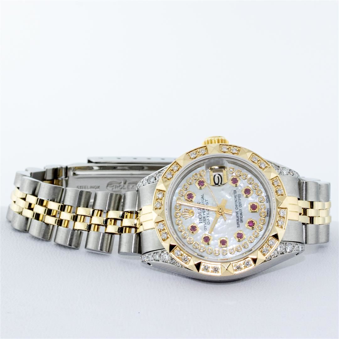 One Ladies Two Tone Rolex Datejust Polished, Serviced & Electronically Tested, Yellow Gold & Stainless Steel Case: 26mm, Yellow Gold Crown, Diamond Lugs: 24 Diamonds On Lugs, Clarity: SI-VS, Color: G to H, Clarity SI-VS. Custom Bezel: New 18K Yellow Gold Pyramid Diamond Bezel, Diamond Count: 24 Diamonds, Total Weight .50 Carat, Clarity: SI-VS, Color: G to H. Custom Crystal: New Synthetic Scratch Resistant Sapphire Cyclops Lens. Custom Hands: New Luminescent Hands. Movement: Automatic Winding Movement. Custom Dial: Mother Of Pearl With Ruby Hour Markers, Stone Count: 10 Rubies + 33 Diamonds In Dial, Clarity: SI-VS, Color: G to H. Date Window: 3 O'Clock Position Date Display, Model: Datejust. Condition: G-6 Extra Fine. Bracelet: Two Tone Yellow Gold & Stainless Steel Jubilee. Bright Polish. 6.0 Inch Length, Adjustable. Standard Clasp, With Rolex Logo. This Watch Has Been Serviced Time Tested And Is In Excellent Condition It Is Free Of All Scratches And Dents.