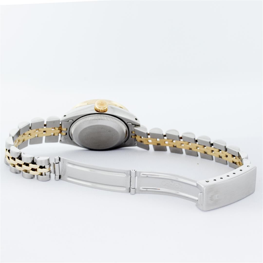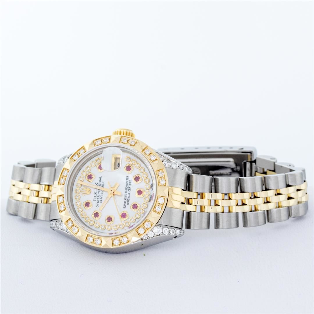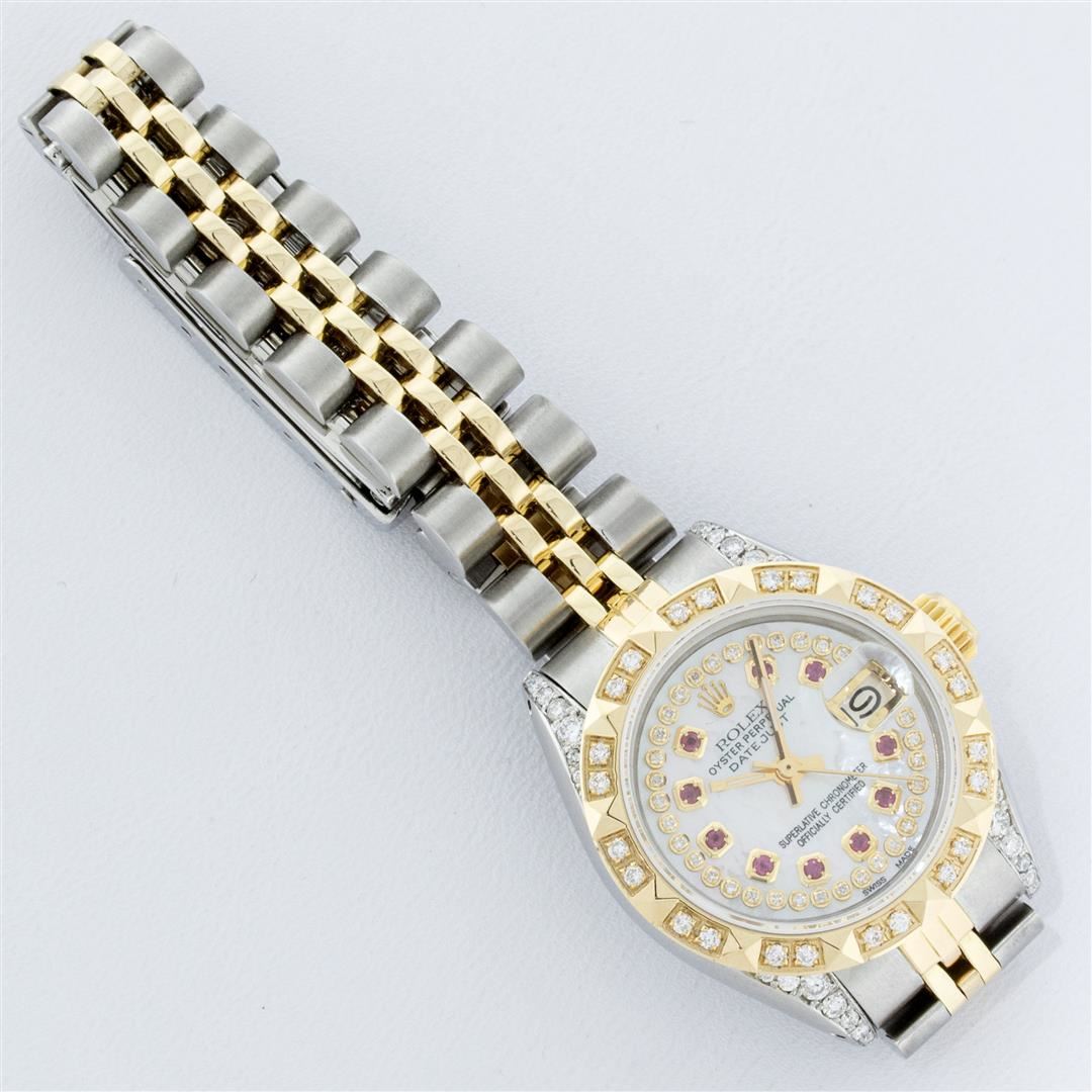 One Ladies Two Tone Rolex Datejust Polished, Serviced & Electronically Tested, Yellow Gold & Stainless Steel Case: 26mm, Yellow Gold Crown, Diamond Lugs: 24 Diamonds On Lugs, Clarity: SI-VS, Color: G to H, Clarity SI-VS. Custom Bezel: New 18K Yellow Gold Pyramid Diamond Bezel, Diamond Count: 24 Diamonds, Total Weight .50 Carat, Clarity: SI-VS, Color: G to H. Custom Crystal: New Synthetic Scratch Resistant Sapphire Cyclops Lens. Custom Hands: New Luminescent Hands. Movement: Automatic Winding Movement. Custom Dial: Mother Of Pearl With Ruby Hour Markers, Stone Count: 10 Rubies + 33 Diamonds In Dial, Clarity: SI-VS, Color: G to H. Date Window: 3 O'Clock Position Date Display, Model: Datejust. Condition: G-6 Extra Fine. Bracelet: Two Tone Yellow Gold & Stainless Steel Jubilee. Bright Polish. 6.0 Inch Length, Adjustable. Standard Clasp, With Rolex Logo. This Watch Has Been Serviced Time Tested And Is In Excellent Condition It Is Free Of All Scratches And Dents.