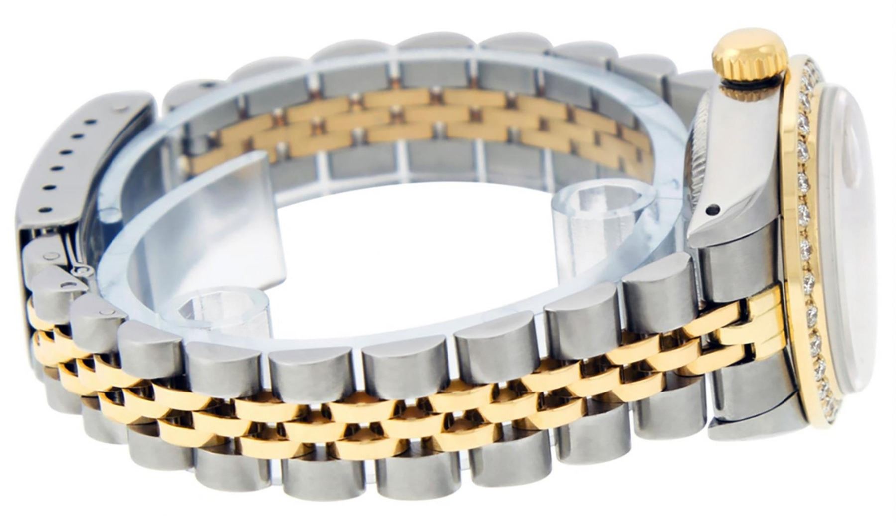 One Ladies Two Tone Rolex Datejust Polished, Serviced & Electronically Tested, Yellow Gold & Stainless Steel Case: 26mm, Yellow Gold Crown, Custom Bezel: New 18K Yellow Gold Beadset Diamond Bezel, Diamond Count: 32 Diamonds In Bezel, Total Weight .70 Carat, Clarity: SI-VS, Color: G to H. Custom Crystal: New Synthetic Sapphire Cyclops Lens. Custom Hands: New Luminescent Hands. Movement: Automatic Winding Movement. Custom Dial: Mother Of Pearl Ruby String Diamond Dial, Stone Count: 10 Rubies + 33 Diamonds In Dial. Clarity: SI-VS, Color: G to H. Date Window: 3 O'Clock Position Date Display, Model: Datejust. Condition: G-6 Extra Fine. Bracelet: Two Tone Yellow Gold & Stainless Steel Jubilee. Bright Polish. 6.0 Inch Length, Adjustable. Standard Clasp, With Rolex Logo. This Watch Has Been Serviced Time Tested And Is In Excellent Condition It Is Free Of All Scratches And Dents.