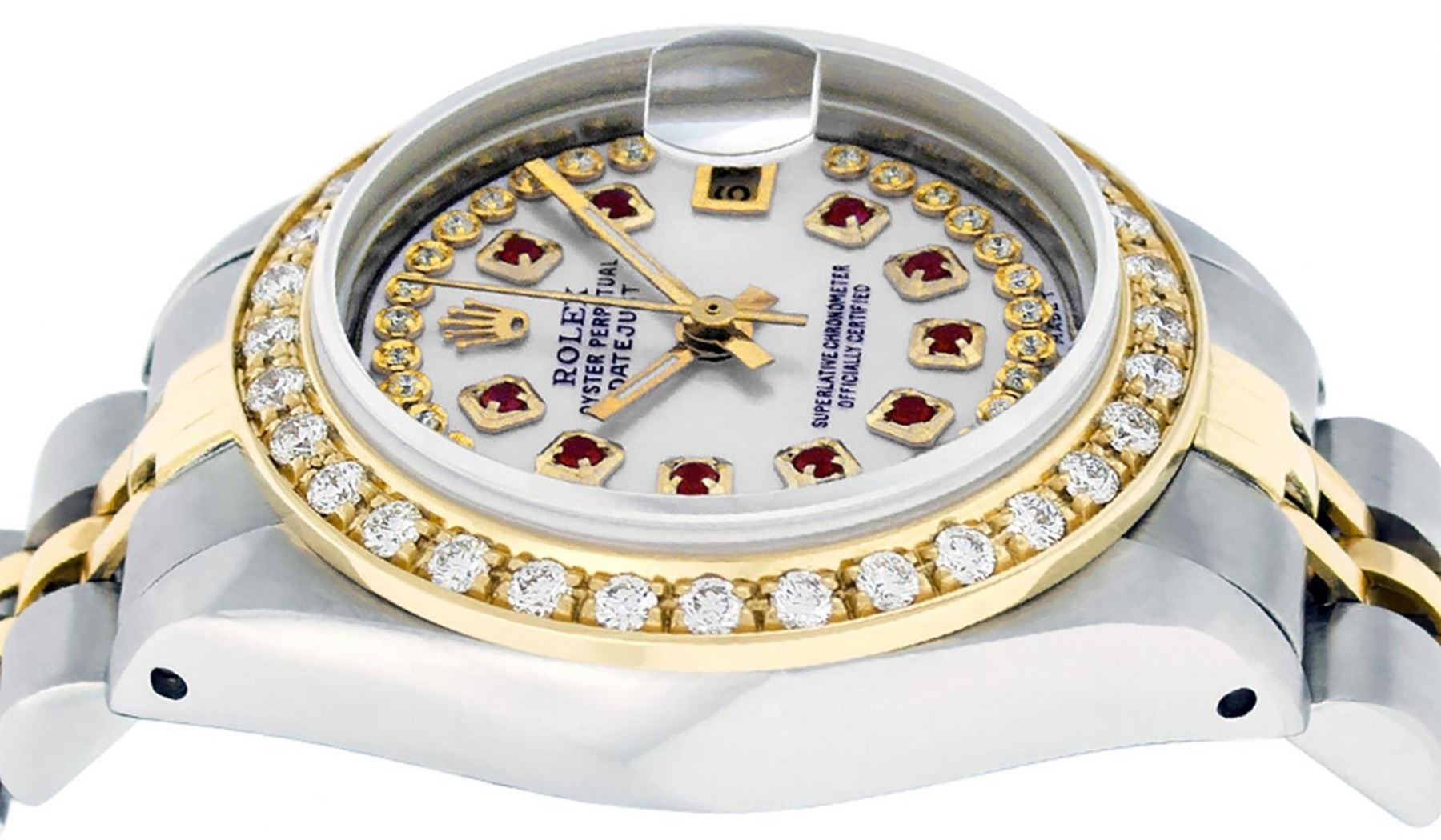 One Ladies Two Tone Rolex Datejust Polished, Serviced & Electronically Tested, Yellow Gold & Stainless Steel Case: 26mm, Yellow Gold Crown, Custom Bezel: New 18K Yellow Gold Beadset Diamond Bezel, Diamond Count: 32 Diamonds In Bezel, Total Weight .70 Carat, Clarity: SI-VS, Color: G to H. Custom Crystal: New Synthetic Sapphire Cyclops Lens. Custom Hands: New Luminescent Hands. Movement: Automatic Winding Movement. Custom Dial: Mother Of Pearl Ruby String Diamond Dial, Stone Count: 10 Rubies + 33 Diamonds In Dial. Clarity: SI-VS, Color: G to H. Date Window: 3 O'Clock Position Date Display, Model: Datejust. Condition: G-6 Extra Fine. Bracelet: Two Tone Yellow Gold & Stainless Steel Jubilee. Bright Polish. 6.0 Inch Length, Adjustable. Standard Clasp, With Rolex Logo. This Watch Has Been Serviced Time Tested And Is In Excellent Condition It Is Free Of All Scratches And Dents.