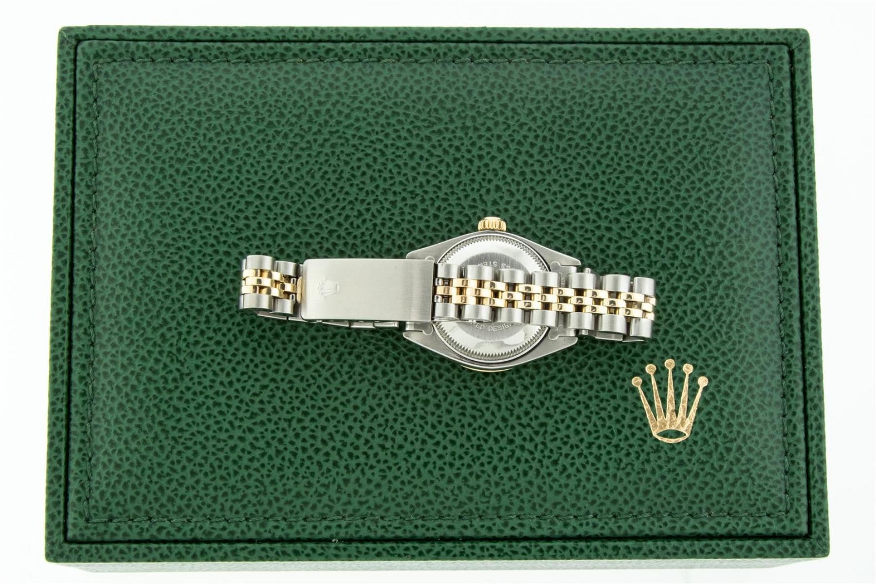 One Ladies Two Tone Rolex Oyster Perpetual Datejust Polished, Serviced & Electronically Tested, Yellow Gold & Stainless Steel Case: 26mm, Yellow Gold Crown, Custom Bezel: New 18K Yellow Gold Sapphire Beadset Diamond Bezel, Diamond Count: 28 Diamonds + 4 Sapphires In Bezel. Total Weight .70 Carat, Clarity: SI-VS, Color: G to H. Custom Crystal: New Scratch Resistant Synthetic Sapphire Cyclops Lens. Custom Hands: New Luminescent Hands. Movement: Automatic Winding Movement. Custom Dial: Mother Of Pearl With Baguette Diamonds, Stone Count: 2 Baguettes. Date Window: 3 O'Clock Position Date Display, Model: Datejust. Condition: G-6 Extra Fine. Bracelet: Two Tone Yellow Gold & Stainless Steel Jubilee Band. Bright Polish. 6.0 Inch Length, Adjustable. Standard Clasp, With Rolex Logo. This Watch Has Been Serviced Time Tested And Is In Excellent Condition It Is Free Of All Scratches And Dents. This Watch Comes With A Rolex Box.