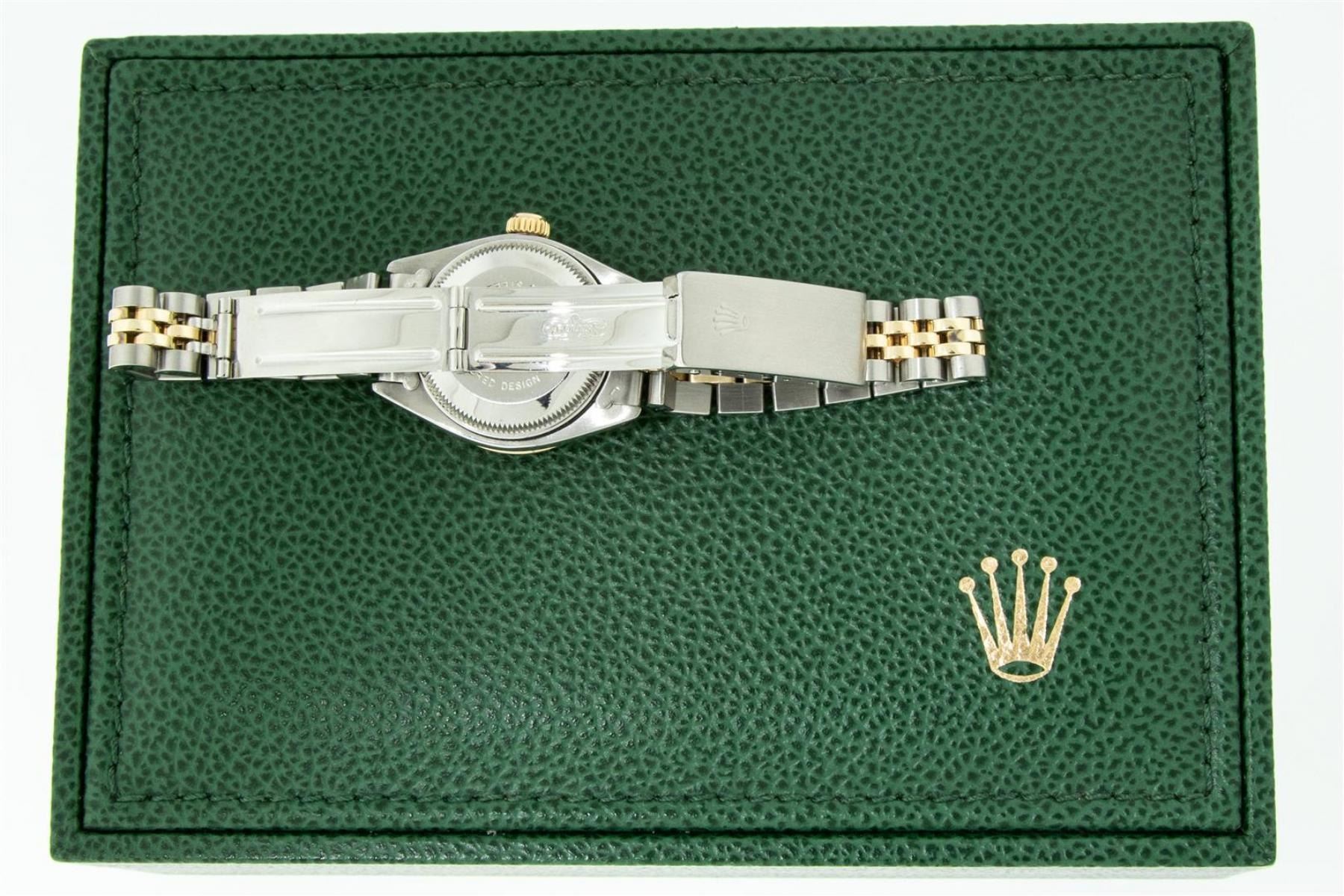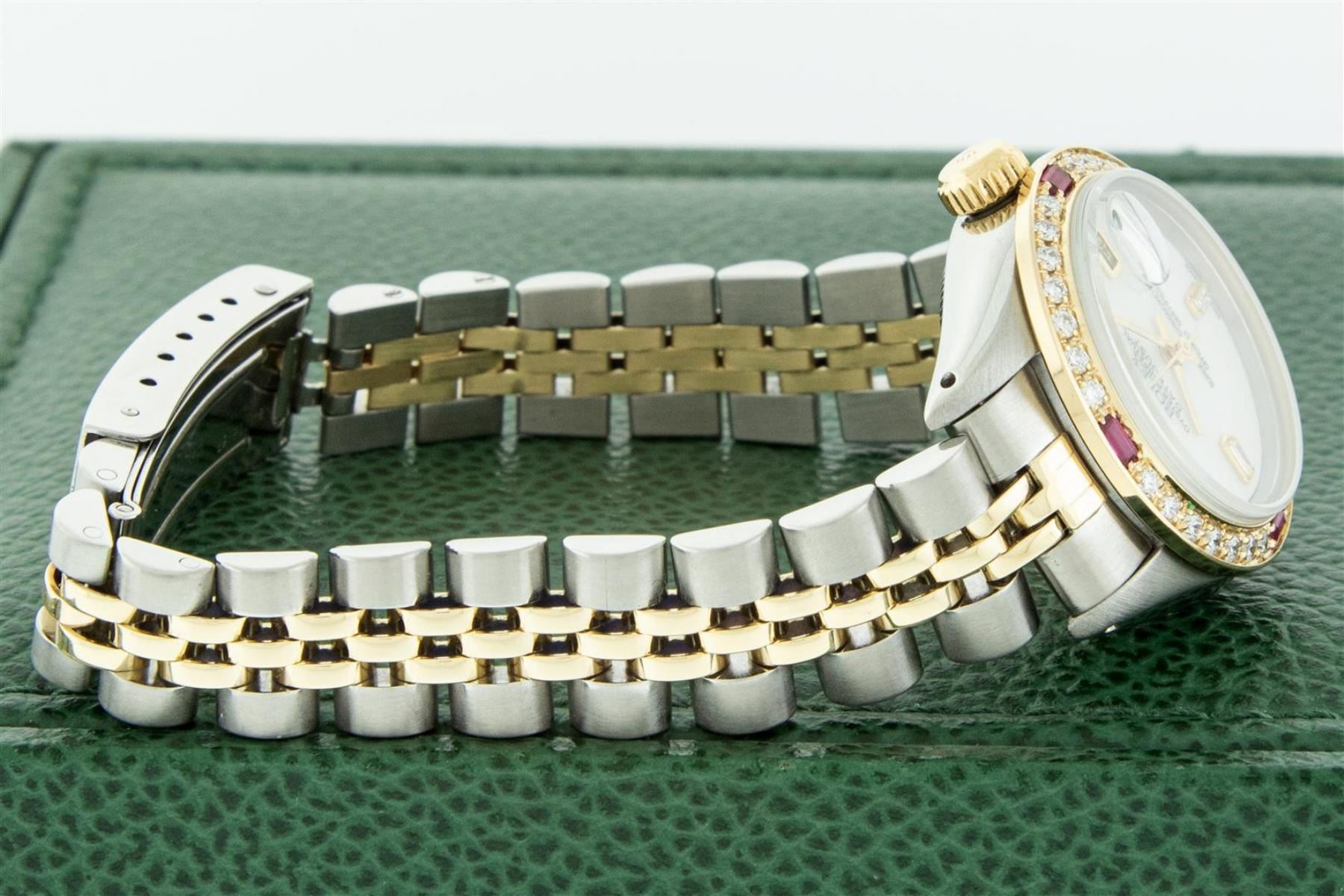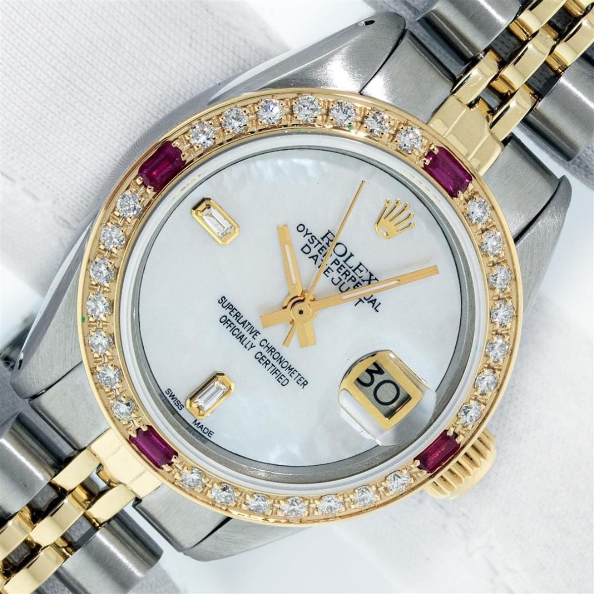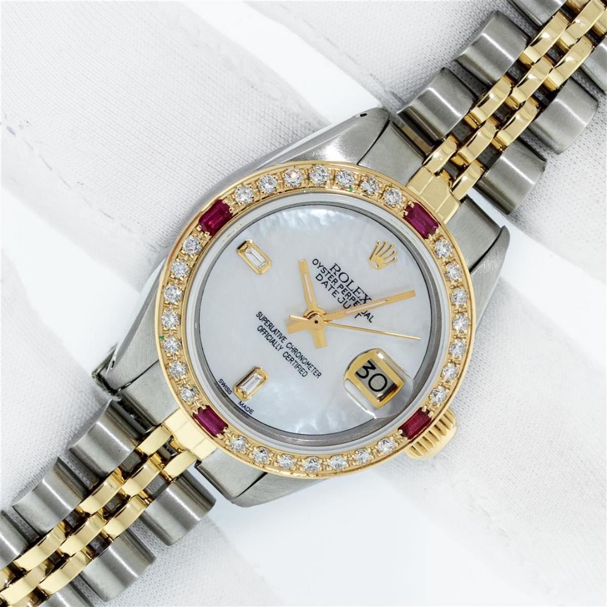 One Ladies Two Tone Rolex Oyster Perpetual Datejust Polished, Serviced & Electronically Tested, Yellow Gold & Stainless Steel Case: 26mm, Yellow Gold Crown, Custom Bezel: New 18K Yellow Gold Sapphire Beadset Diamond Bezel, Diamond Count: 28 Diamonds + 4 Sapphires In Bezel. Total Weight .70 Carat, Clarity: SI-VS, Color: G to H. Custom Crystal: New Scratch Resistant Synthetic Sapphire Cyclops Lens. Custom Hands: New Luminescent Hands. Movement: Automatic Winding Movement. Custom Dial: Mother Of Pearl With Baguette Diamonds, Stone Count: 2 Baguettes. Date Window: 3 O'Clock Position Date Display, Model: Datejust. Condition: G-6 Extra Fine. Bracelet: Two Tone Yellow Gold & Stainless Steel Jubilee Band. Bright Polish. 6.0 Inch Length, Adjustable. Standard Clasp, With Rolex Logo. This Watch Has Been Serviced Time Tested And Is In Excellent Condition It Is Free Of All Scratches And Dents. This Watch Comes With A Rolex Box.
