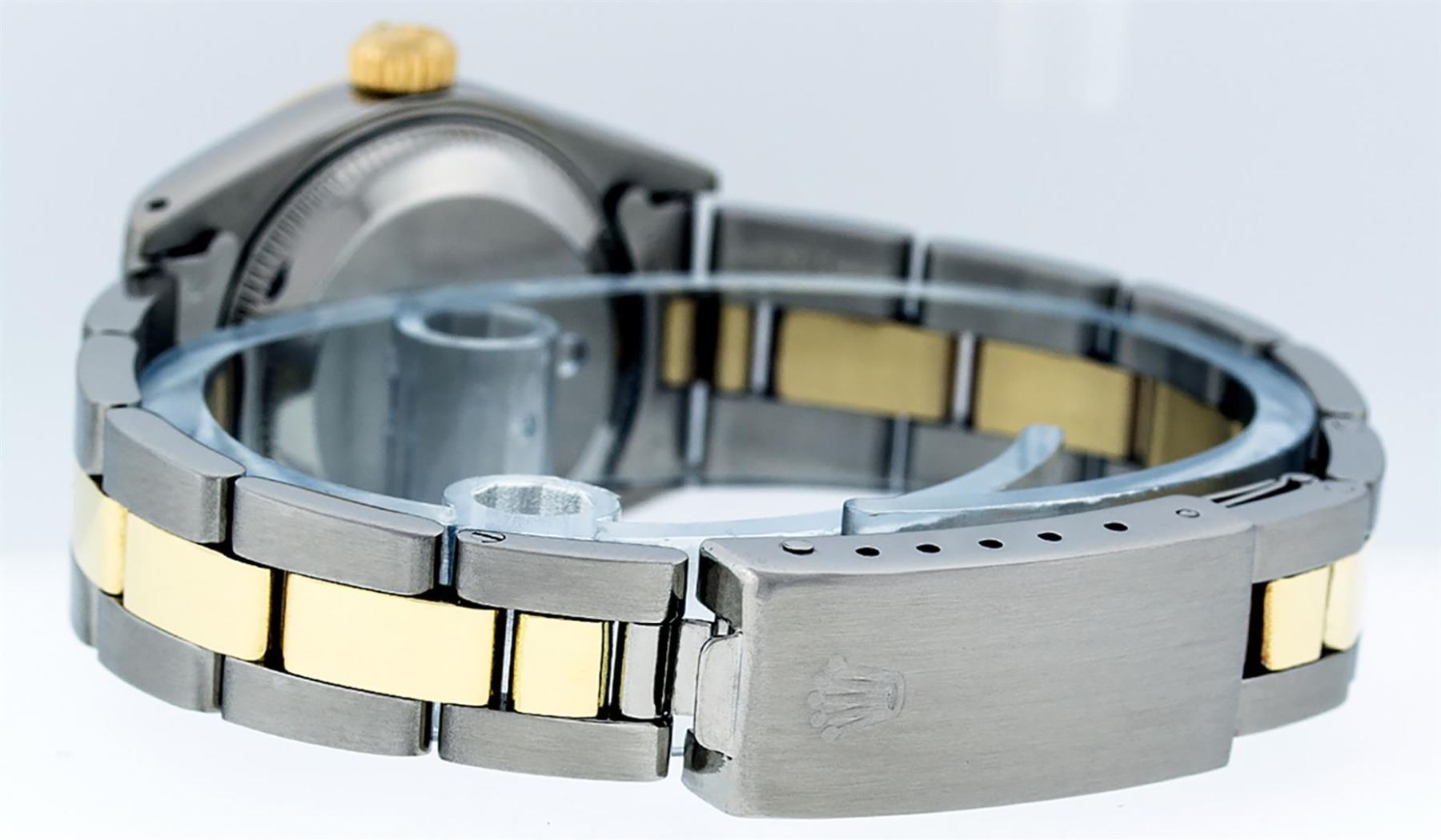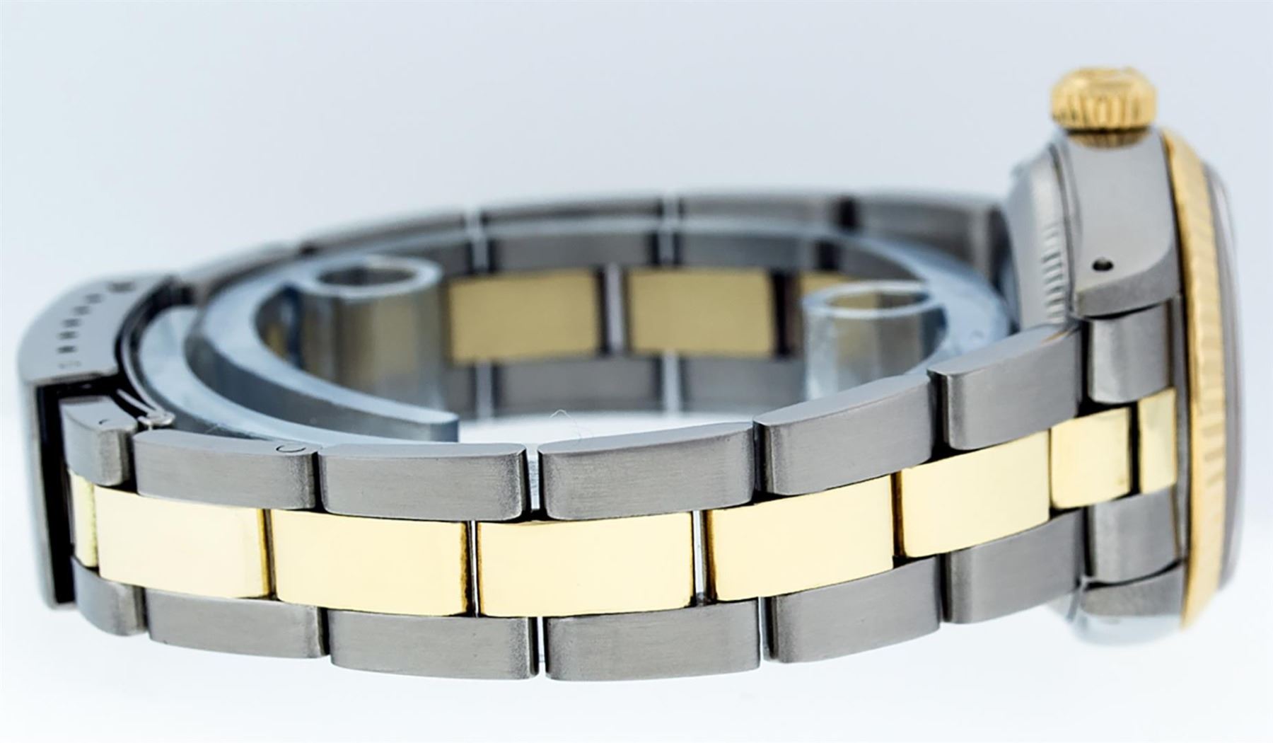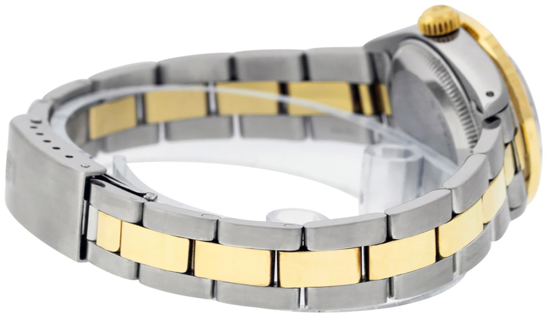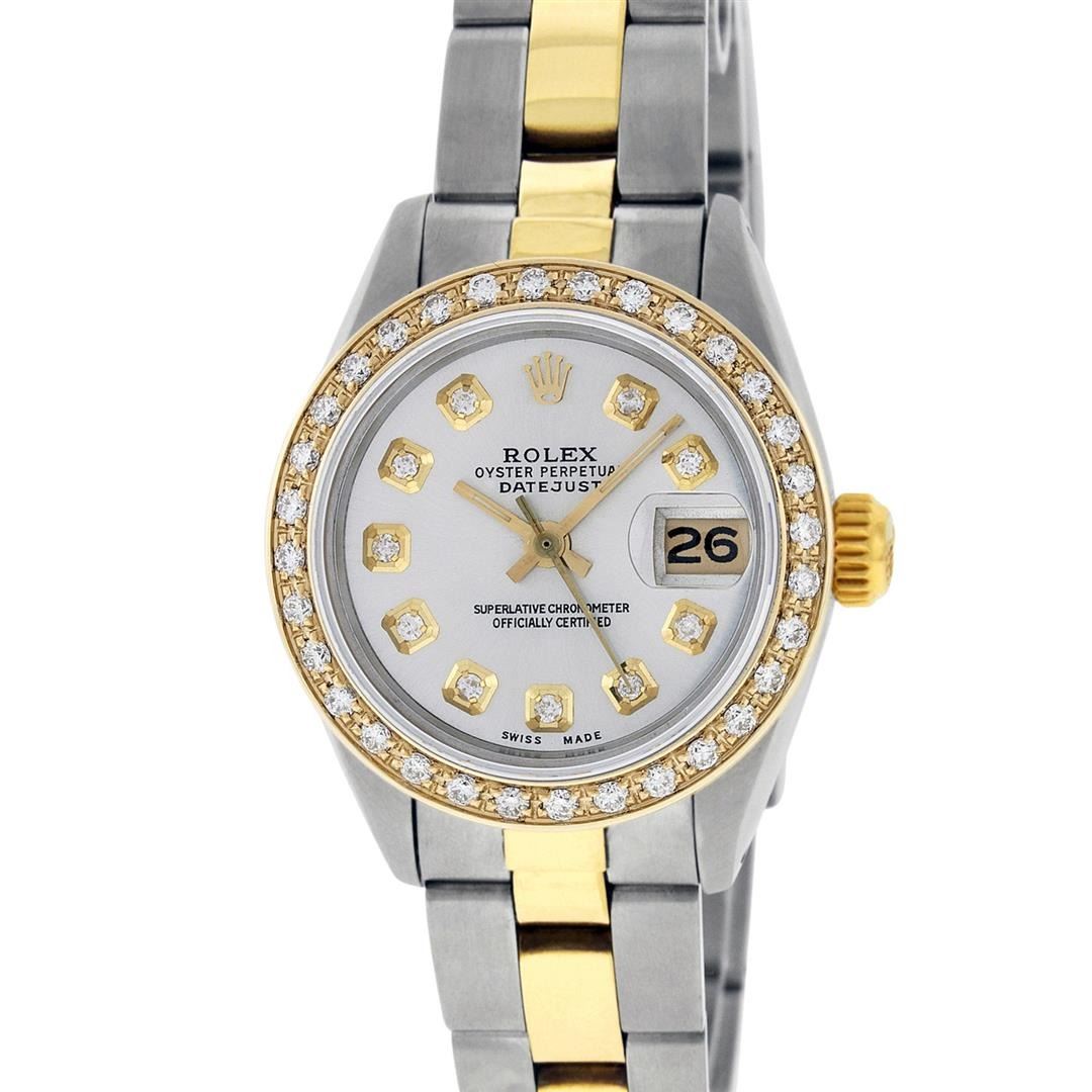 One Ladies Two Tone Yellow Gold And Stainless Steel Rolex Datejust Polished, Serviced & Electronically Tested, Yellow Gold & Stainless Steel Case: 26mm, Yellow Gold Crown, Custom Bezel: New 18K Yellow Gold Beadset Diamond Bezel, Diamond Count: 43 Diamonds On Dial, Total Weight .70 Carat, Clarity: SI-VS, Color: G to H. Custom Crystal: New Scratch Resistant Synthetic Sapphire Cyclops Lens. Custom Hands: New Luminescent Hands. Movement: Automatic Winding Movement. Custom Dial: Mother Of Pearl String Diamond and Sapphire Dial, Stone Count: 33 Diamonds + 10 Sapphires, Clarity: SI-VS, Color: G to H. Date Window: 3 O'Clock Position Date Display, Model: Datejust. Condition: G-6 Extra Fine. Bracelet: Two Tone Yellow Gold & Stainless Steel Jubilee Band. Bright Polish. 6.0 Inch Length, Adjustable. Standard Clasp, With Rolex Logo. This Watch Has Been Serviced Time Tested And Is In Excellent Condition It Is Free Of All Scratches And Dents.