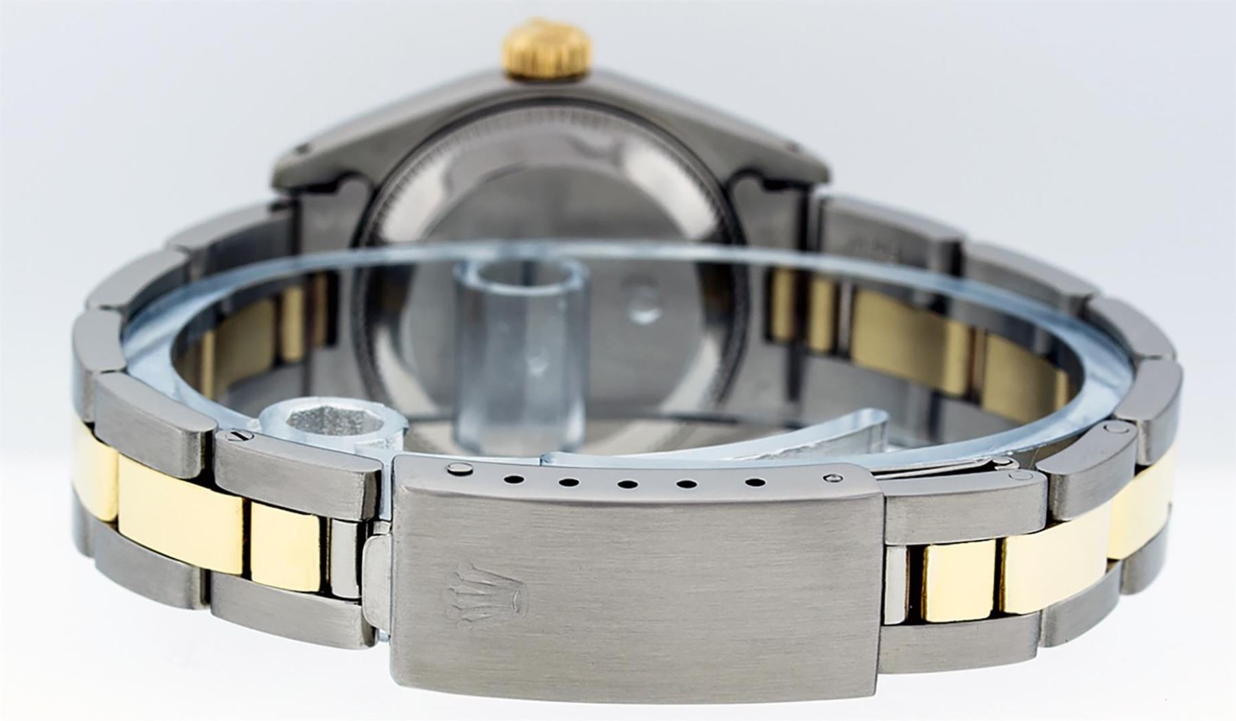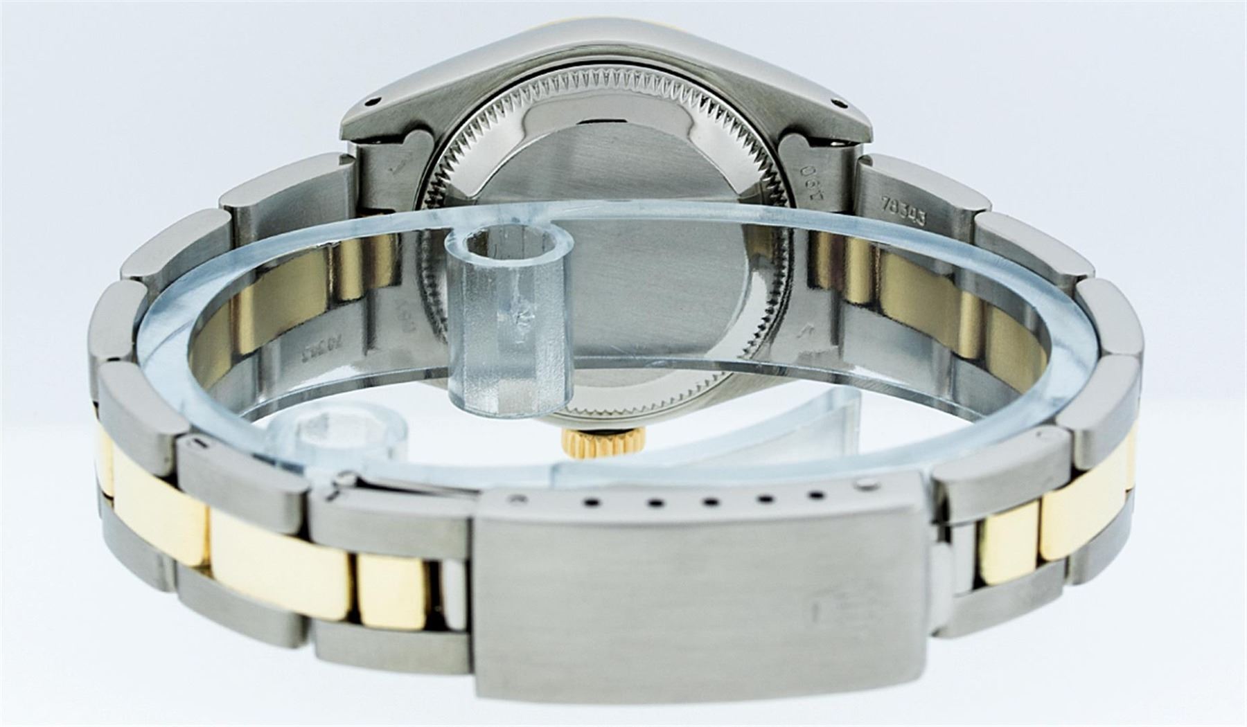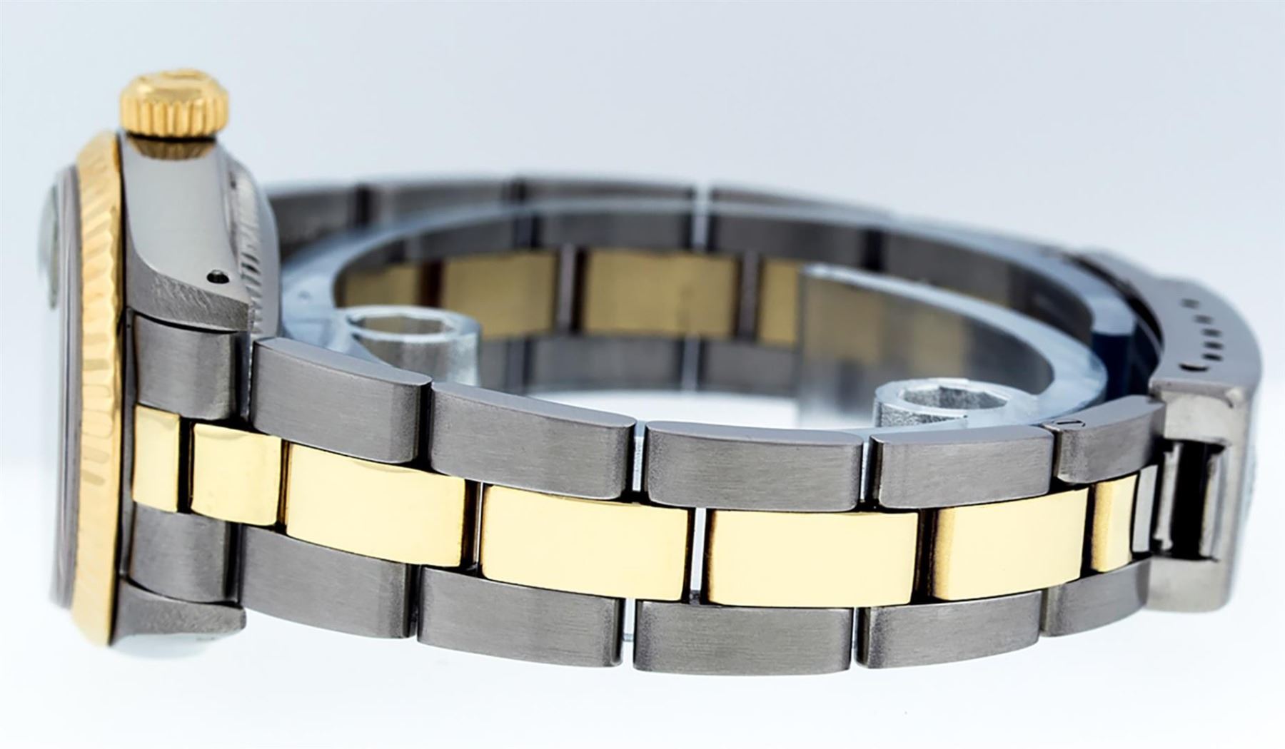 One Ladies Two Tone Yellow Gold And Stainless Steel Rolex Datejust Polished, Serviced & Electronically Tested, Yellow Gold & Stainless Steel Case: 26mm, Yellow Gold Crown, Custom Bezel: New 18K Yellow Gold Beadset Diamond Bezel, Diamond Count: 43 Diamonds On Dial, Total Weight .70 Carat, Clarity: SI-VS, Color: G to H. Custom Crystal: New Scratch Resistant Synthetic Sapphire Cyclops Lens. Custom Hands: New Luminescent Hands. Movement: Automatic Winding Movement. Custom Dial: Mother Of Pearl String Diamond and Sapphire Dial, Stone Count: 33 Diamonds + 10 Sapphires, Clarity: SI-VS, Color: G to H. Date Window: 3 O'Clock Position Date Display, Model: Datejust. Condition: G-6 Extra Fine. Bracelet: Two Tone Yellow Gold & Stainless Steel Jubilee Band. Bright Polish. 6.0 Inch Length, Adjustable. Standard Clasp, With Rolex Logo. This Watch Has Been Serviced Time Tested And Is In Excellent Condition It Is Free Of All Scratches And Dents.