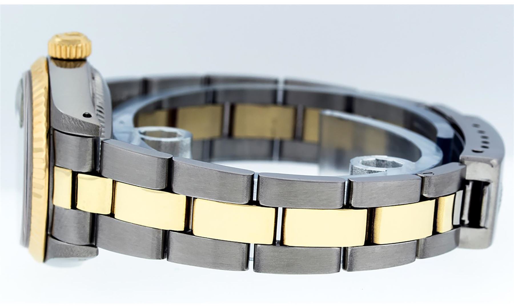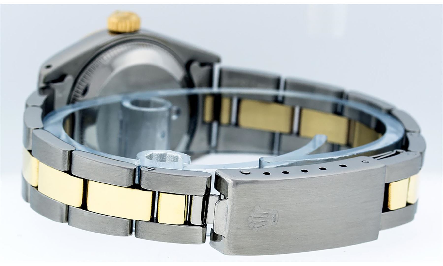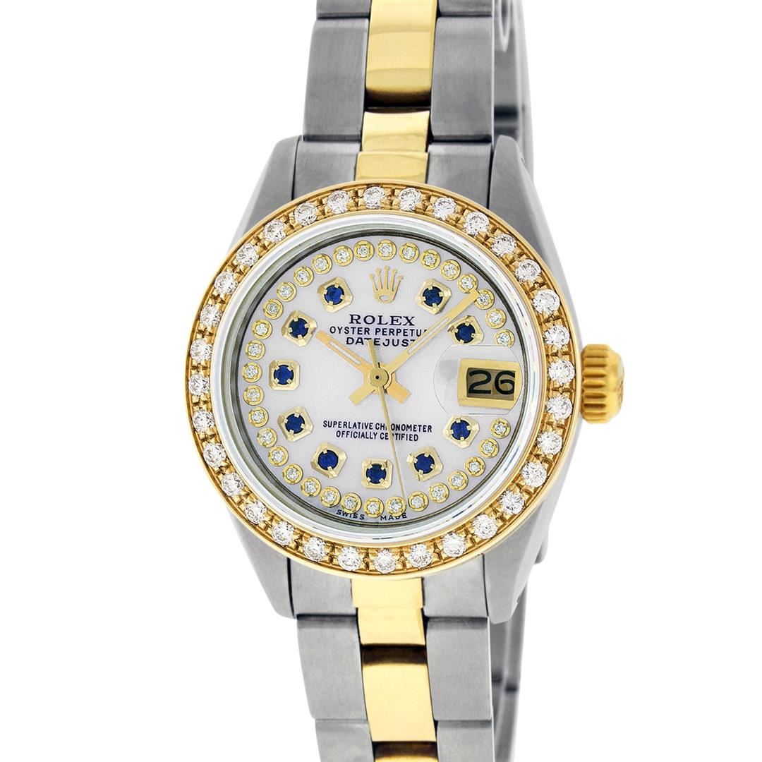One Ladies Two Tone Yellow Gold And Stainless Steel Rolex Datejust Polished, Serviced & Electronically Tested, Yellow Gold & Stainless Steel Case: 26mm, Yellow Gold Crown, Custom Bezel: New 18K Yellow Gold Beadset Diamond Bezel, Diamond Count: 43 Diamonds On Dial, Total Weight .70 Carat, Clarity: SI-VS, Color: G to H. Custom Crystal: New Scratch Resistant Synthetic Sapphire Cyclops Lens. Custom Hands: New Luminescent Hands. Movement: Automatic Winding Movement. Custom Dial: Mother Of Pearl String Diamond and Sapphire Dial, Stone Count: 33 Diamonds + 10 Sapphires, Clarity: SI-VS, Color: G to H. Date Window: 3 O'Clock Position Date Display, Model: Datejust. Condition: G-6 Extra Fine. Bracelet: Two Tone Yellow Gold & Stainless Steel Jubilee Band. Bright Polish. 6.0 Inch Length, Adjustable. Standard Clasp, With Rolex Logo. This Watch Has Been Serviced Time Tested And Is In Excellent Condition It Is Free Of All Scratches And Dents.