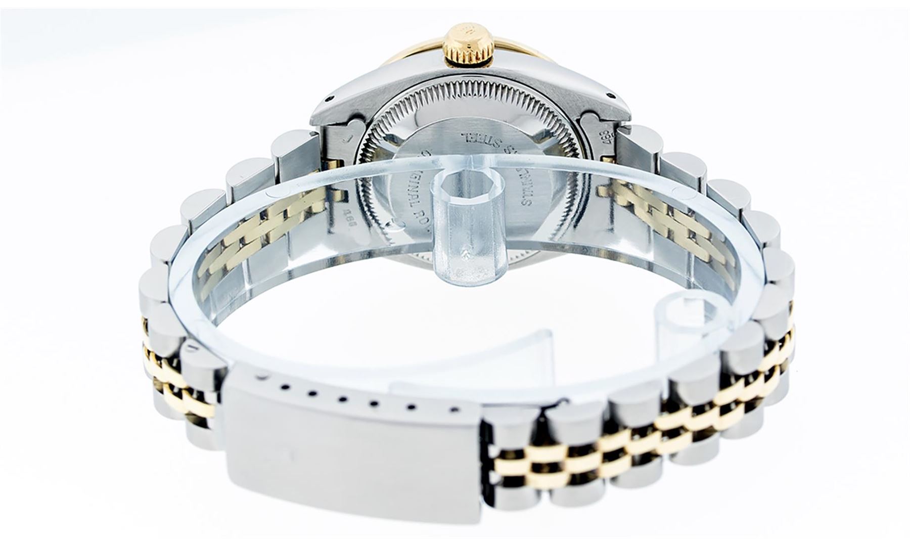 One Ladies Two Tone Rolex Datejust Polished, Serviced & Electronically Tested, Yellow Gold & Stainless Steel Case: 26mm, Yellow Gold Crown, Diamond Lugs: 24 Diamonds On Lugs, Clarity: SI-VS, Color: G to H. Custom Bezel: New 1ctw 18K Yellow Gold Beadset Diamond Bezel, Diamond Count: 42 Diamonds In Bezel, Total Weight 1.00 Carat, Clarity: SI-VS, Color: G to H. Custom Crystal: New Scratch Resistant Synthetic Sapphire Cyclops Lens. Custom Hands: New Luminescent Hands. Movement: Automatic Winding Movement. Custom Dial: Mother Of Pearl String Diamond Dial, Diamond Count: 43 Diamonds In Dial, Clarity: SI-VS, Color: G to H. Date Window: 3 O'Clock Position Date Display, Model: Datejust. Condition: G-6 Extra Fine. Bracelet: Two Tone Yellow Gold & Stainless Steel Jubilee Band. Bright Polish. 6.0 Inch Length, Adjustable. Standard Clasp, With Rolex Logo. This Watch Has Been Serviced Time Tested And Is In Excellent Condition It Is Free Of All Scratches And Dents.
