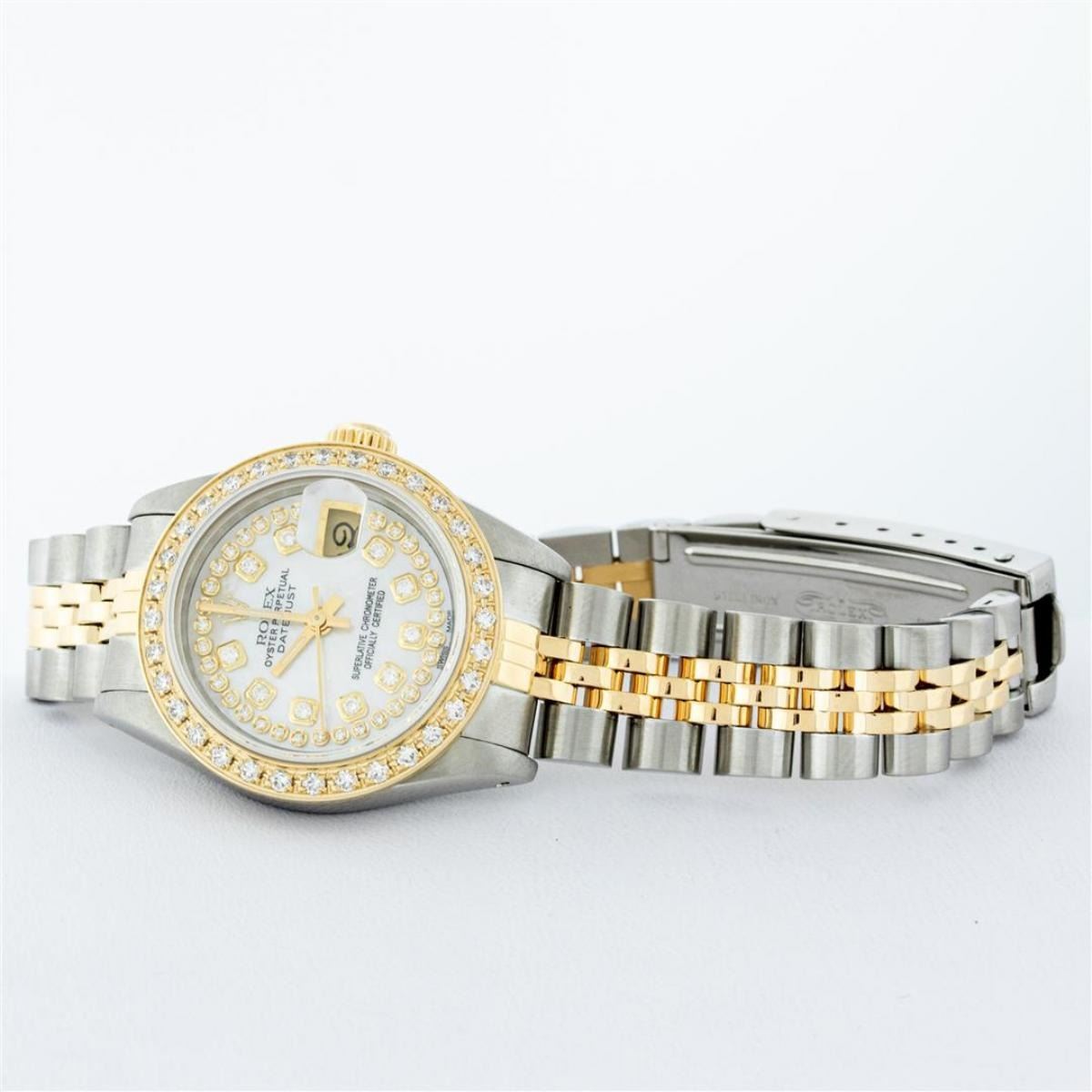 One Ladies Two Tone Rolex Datejust Polished, Serviced & Electronically Tested, Yellow Gold & Stainless Steel Case: 26mm, Yellow Gold Crown, Custom Bezel: New 18K Yellow Gold Beadset Diamond Bezel, Diamond Count: 43 Diamonds in dial, Total Weight .70 Carat, Clarity: SI-VS, Color: G to H. Custom Crystal: New Synthetic Sapphire Cyclops Lens. Custom Hands: New Luminescent Hands. Movement: Automatic Winding Movement. Custom Dial: Mother Of Pearl String Diamond Dial, Diamond Count: 43 Diamonds, Clarity: SI-VS, Color: G to H. Date Window: 3 O'Clock Position Date Display, Model: Datejust. Condition: G-6 Extra Fine. Bracelet: Two Tone Yellow Gold & Stainless Steel Jubilee Band. Bright Polish. 6.0 Inch Length, Adjustable. Standard Clasp, With Rolex Logo. This Watch Has Been Serviced Time Tested And Is In Excellent Condition It Is Free Of All Scratches And Dents. This Watch Comes With A Rolex Box.