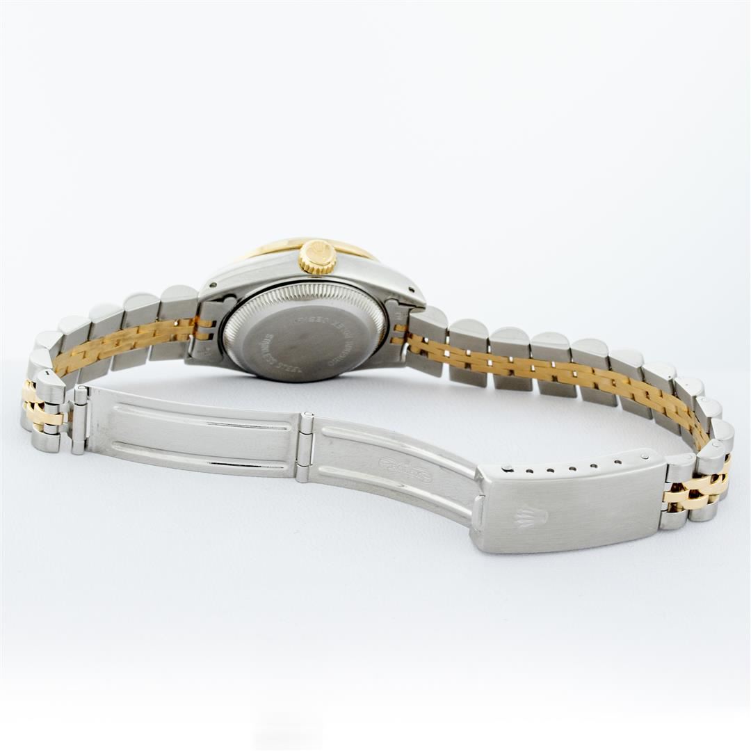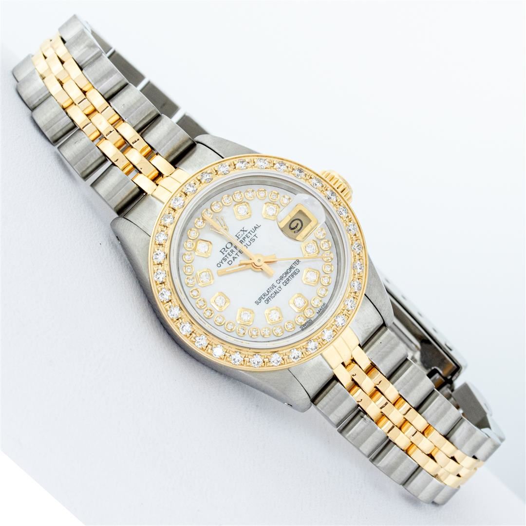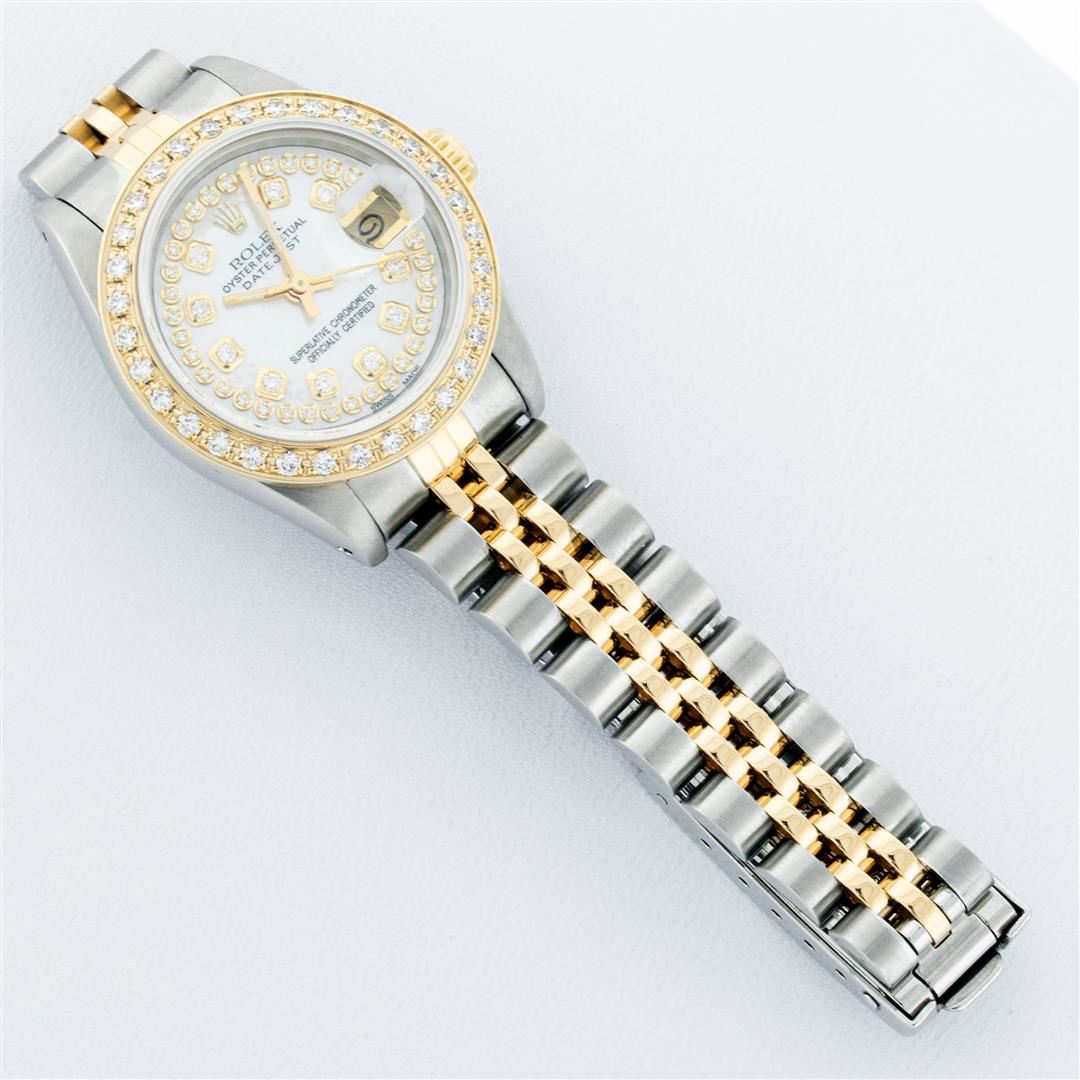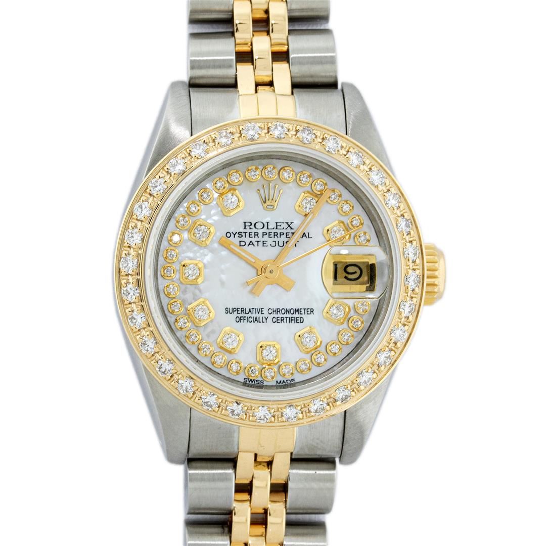 One Ladies Two Tone Rolex Datejust Polished, Serviced & Electronically Tested, Yellow Gold & Stainless Steel Case: 26mm, Yellow Gold Crown, Custom Bezel: New 18K Yellow Gold Beadset Diamond Bezel, Diamond Count: 43 Diamonds in dial, Total Weight .70 Carat, Clarity: SI-VS, Color: G to H. Custom Crystal: New Synthetic Sapphire Cyclops Lens. Custom Hands: New Luminescent Hands. Movement: Automatic Winding Movement. Custom Dial: Mother Of Pearl String Diamond Dial, Diamond Count: 43 Diamonds, Clarity: SI-VS, Color: G to H. Date Window: 3 O'Clock Position Date Display, Model: Datejust. Condition: G-6 Extra Fine. Bracelet: Two Tone Yellow Gold & Stainless Steel Jubilee Band. Bright Polish. 6.0 Inch Length, Adjustable. Standard Clasp, With Rolex Logo. This Watch Has Been Serviced Time Tested And Is In Excellent Condition It Is Free Of All Scratches And Dents. This Watch Comes With A Rolex Box.