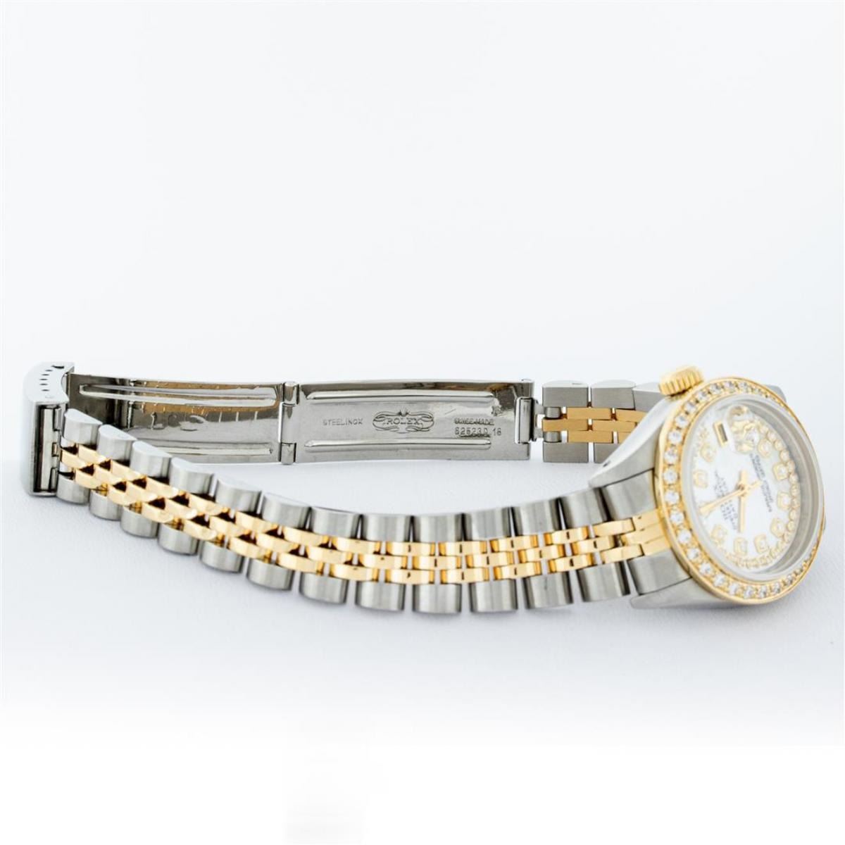 One Ladies Two Tone Rolex Datejust Polished, Serviced & Electronically Tested, Yellow Gold & Stainless Steel Case: 26mm, Yellow Gold Crown, Custom Bezel: New 18K Yellow Gold Beadset Diamond Bezel, Diamond Count: 43 Diamonds in dial, Total Weight .70 Carat, Clarity: SI-VS, Color: G to H. Custom Crystal: New Synthetic Sapphire Cyclops Lens. Custom Hands: New Luminescent Hands. Movement: Automatic Winding Movement. Custom Dial: Mother Of Pearl String Diamond Dial, Diamond Count: 43 Diamonds, Clarity: SI-VS, Color: G to H. Date Window: 3 O'Clock Position Date Display, Model: Datejust. Condition: G-6 Extra Fine. Bracelet: Two Tone Yellow Gold & Stainless Steel Jubilee Band. Bright Polish. 6.0 Inch Length, Adjustable. Standard Clasp, With Rolex Logo. This Watch Has Been Serviced Time Tested And Is In Excellent Condition It Is Free Of All Scratches And Dents. This Watch Comes With A Rolex Box.