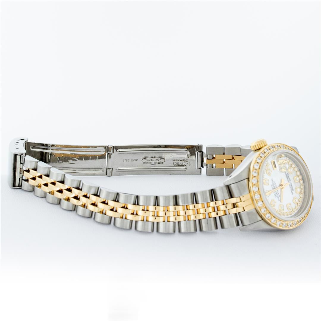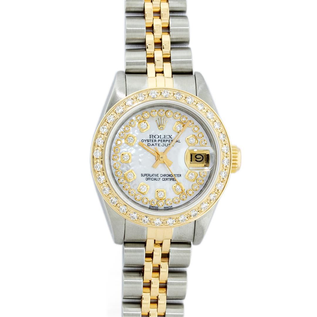 One Ladies Two Tone Rolex Datejust Polished, Serviced & Electronically Tested, Yellow Gold & Stainless Steel Case: 26mm, Yellow Gold Crown, Custom Bezel: New 18K Yellow Gold Beadset Diamond Bezel, Diamond Count: 43 Diamonds in dial, Total Weight .70 Carat, Clarity: SI-VS, Color: G to H. Custom Crystal: New Synthetic Sapphire Cyclops Lens. Custom Hands: New Luminescent Hands. Movement: Automatic Winding Movement. Custom Dial: Mother Of Pearl String Diamond Dial, Diamond Count: 43 Diamonds, Clarity: SI-VS, Color: G to H. Date Window: 3 O'Clock Position Date Display, Model: Datejust. Condition: G-6 Extra Fine. Bracelet: Two Tone Yellow Gold & Stainless Steel Jubilee Band. Bright Polish. 6.0 Inch Length, Adjustable. Standard Clasp, With Rolex Logo. This Watch Has Been Serviced Time Tested And Is In Excellent Condition It Is Free Of All Scratches And Dents. This Watch Comes With A Rolex Box.