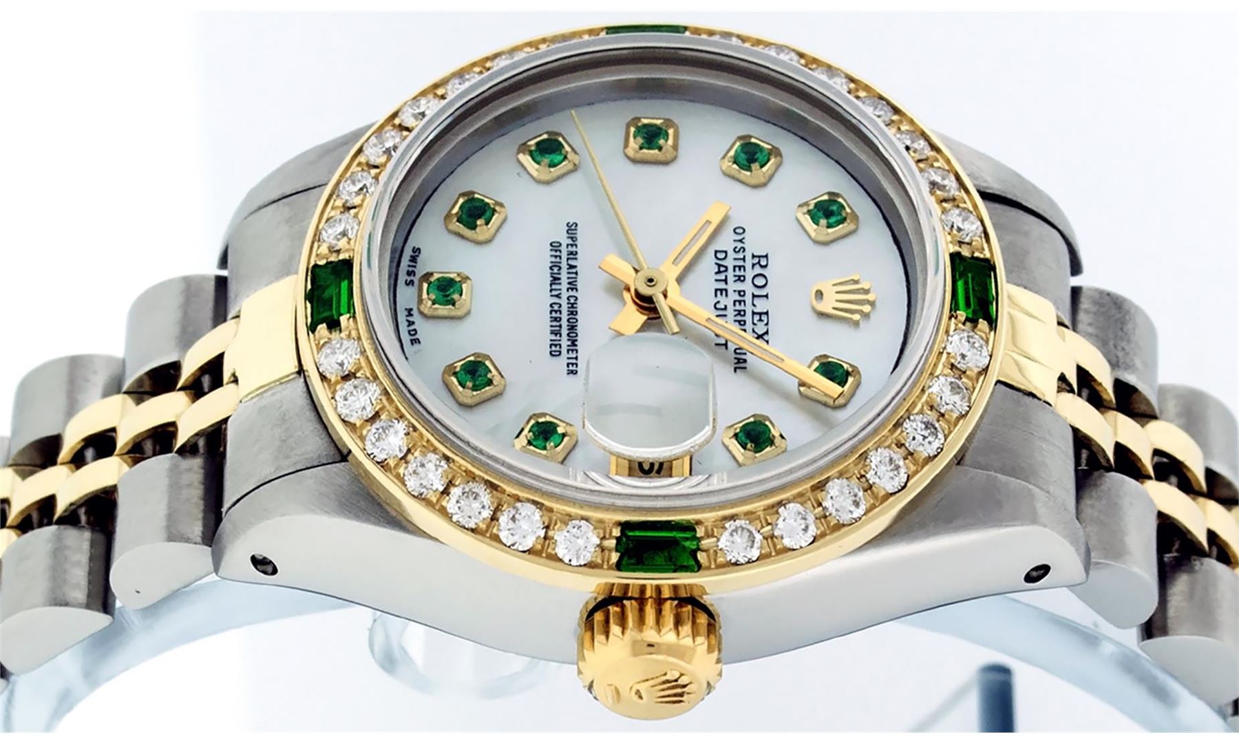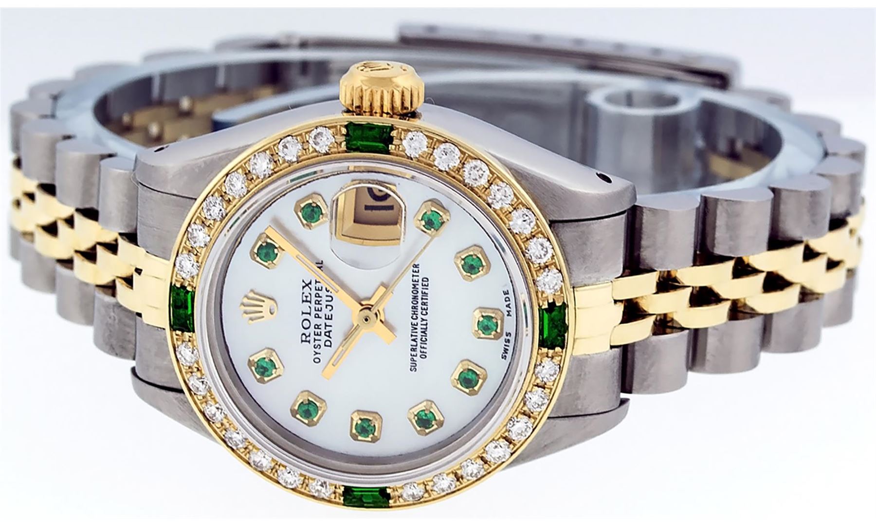 One Ladies 14K Two Tone Rolex Datejust Polished, Serviced & Electronically Tested, 14K Yellow Gold & Stainless Steel Case: 26mm, 14K Yellow Gold Crown, Custom Bezel: New 18K Yellow Gold Emerald Beadset Diamond Bezel, Diamond + Gem Count: 28 Diamonds + 4 Emeralds Total Weight .70 Carat, Clarity: SI-VS, Color: G to H. Custom Crystal: New Scratch Resistant Synthetic Sapphire Cyclops Lens. Custom Hands: New Luminescent Hands. Movement: Automatic Winding Movement Caliber 2030. Custom Dial: Mother Of Pearl With Emerald Hour Markers, Diamond Count: 10 Emeralds in Dial, G To H In Color, SI-VS Clarity. Date Window: 3 O'Clock Position Date Display, Model: Datejust, Condition: G-6 Extra Fine. Bracelet: Two Tone 14K Yellow Gold & Stainless Steel Jubilee Band. Bright Polish. 6.0 Inch Length, Adjustable. Standard Clasp, With Rolex Logo. This Watch Has Been Serviced Time Tested And Is In Excellent Condition It Is Free Of All Scratches And Dents.