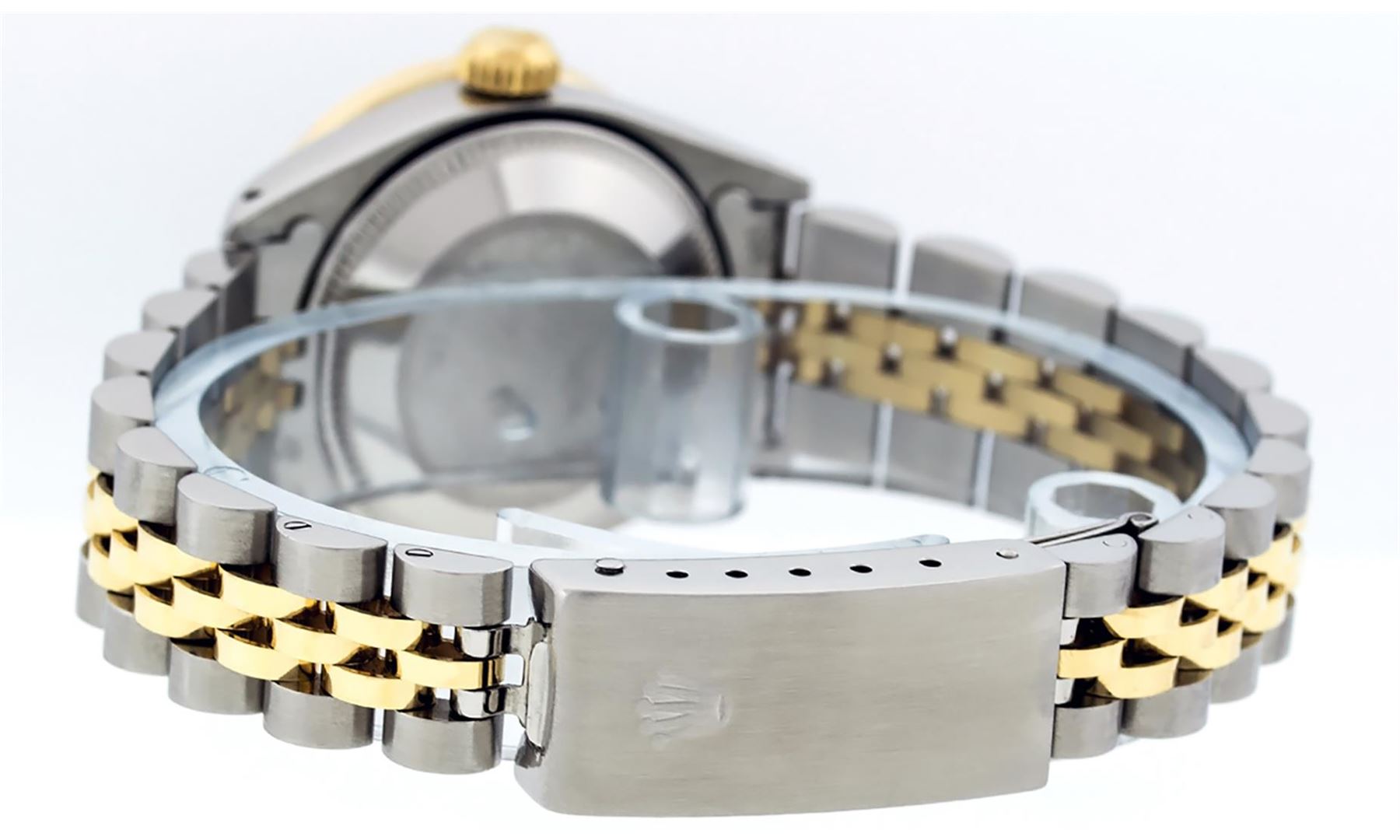 One Ladies Two Tone Rolex Datejust Polished, Serviced & Electronically Tested, Yellow Gold & Stainless Steel Case: 26mm, Yellow Gold Crown, Custom Bezel: New 18K Yellow Gold Pyramid Diamond Bezel, Diamond Count: 24 Diamonds On Bezel, Total Weight .50 Carat, Clarity: Si-VS, Color: G to H. Custom Crystal: New Scratch Resistant Synthetic Sapphire Cyclops Lens. Custom Hands: New Luminescent Hands. Movement: Automatic Winding Movement. Custom Dial: Mother Of Pearl String Diamond Dial. Diamond Count: 43 Diamonds On Dial, Clarity: SI-VS, Color: G to H. Date Window: 3 O'Clock Position Date Display, Model: Datejust. Condition: G-6 Extra Fine. Bracelet: Two Tone Yellow Gold & Stainless Steel Jubilee. Bright Polish. 6.0 Inch Length, Adjustable. Standard Clasp, With Rolex Logo. This Watch Has Been Serviced Time Tested And Is In Excellent Condition It Is Free Of All Scratches And Dents.
