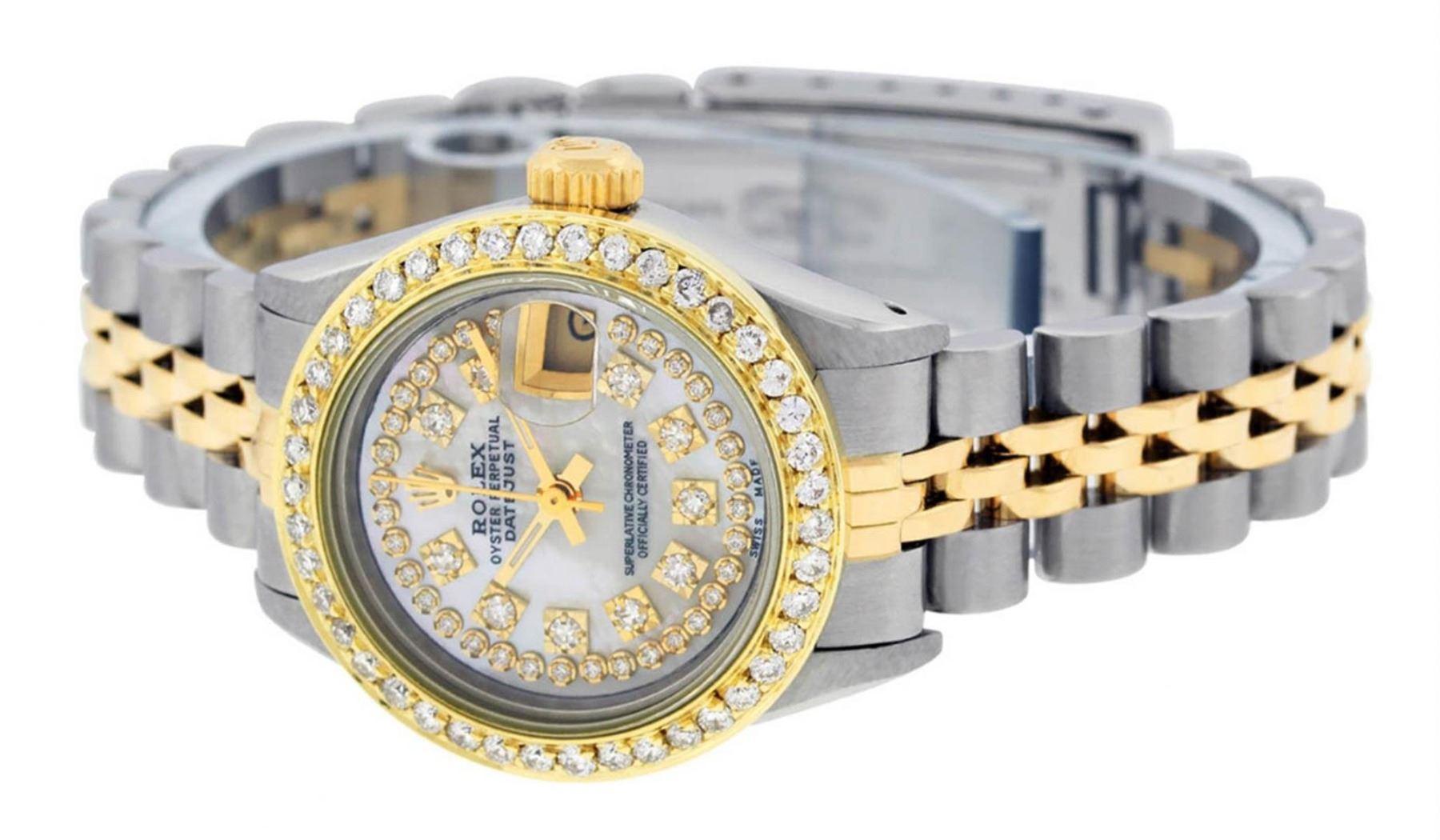 One Ladies 14K Two Tone Rolex Datejust Polished, Serviced & Electronically Tested, 14K Yellow Gold & Stainless Steel Case: 26mm, 14K Yellow Gold Crown, Custom Bezel: New 18K 1ctw Yellow Gold Beadset Diamond Bezel, Diamond Count: 44 Diamonds, Total Weight 1.00 Carat, Clarity: Si-VS, Color: G to H. Custom Crystal: New Synthetic Sapphire Cyclops Lens. Custom Hands: New Luminescent Hands. Movement: Automatic Winding Movement Caliber 2030. Custom Dial: Mother Of Pearl String Diamond Dial, Diamond Count: 43 Single Cut Diamonds in Dial, G To H In Color, VS Clarity. Date Window: 3 O'Clock Position Date Display, Model: Datejust, Condition: G-6 Extra Fine. Bracelet: Two Tone 14K Yellow Gold & Stainless Steel Jubilee. Bright Polish. 6.0 Inch Length, Adjustable. Standard Clasp, With Rolex Logo. This Watch Has Been Serviced Time Tested And Is In Excellent Condition It Is Free Of All Scratches And Dents.