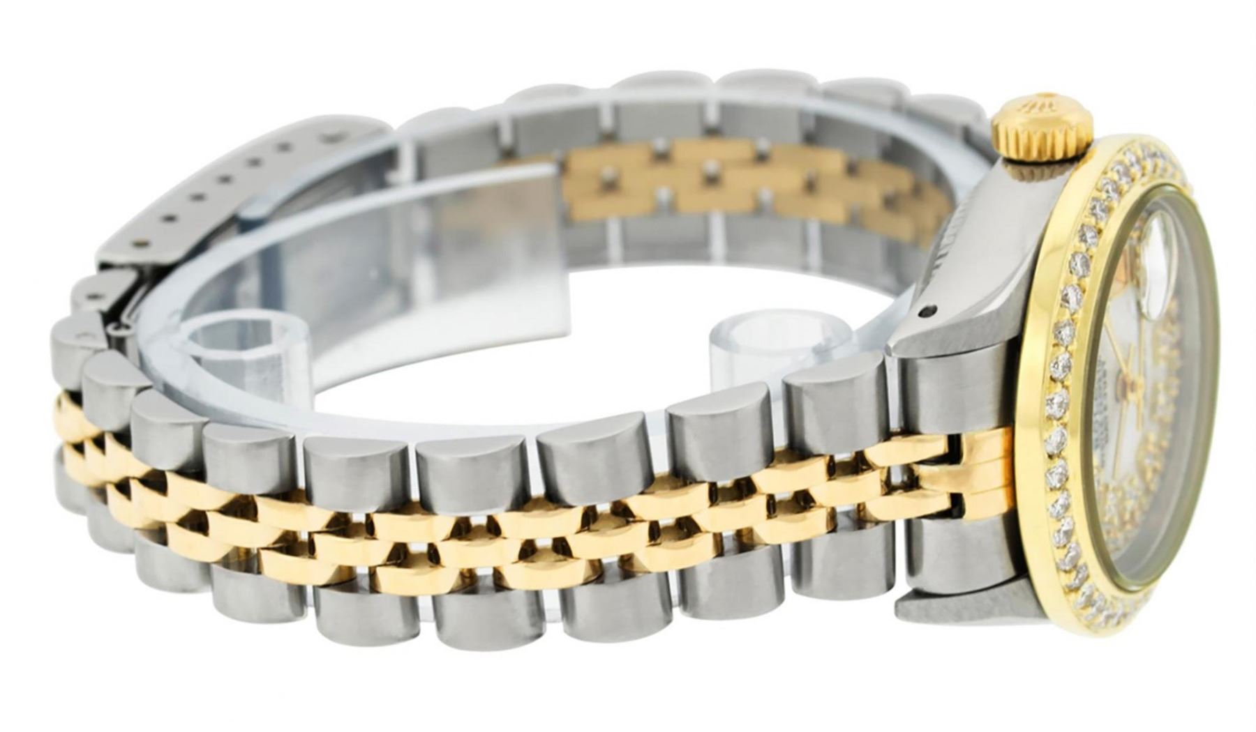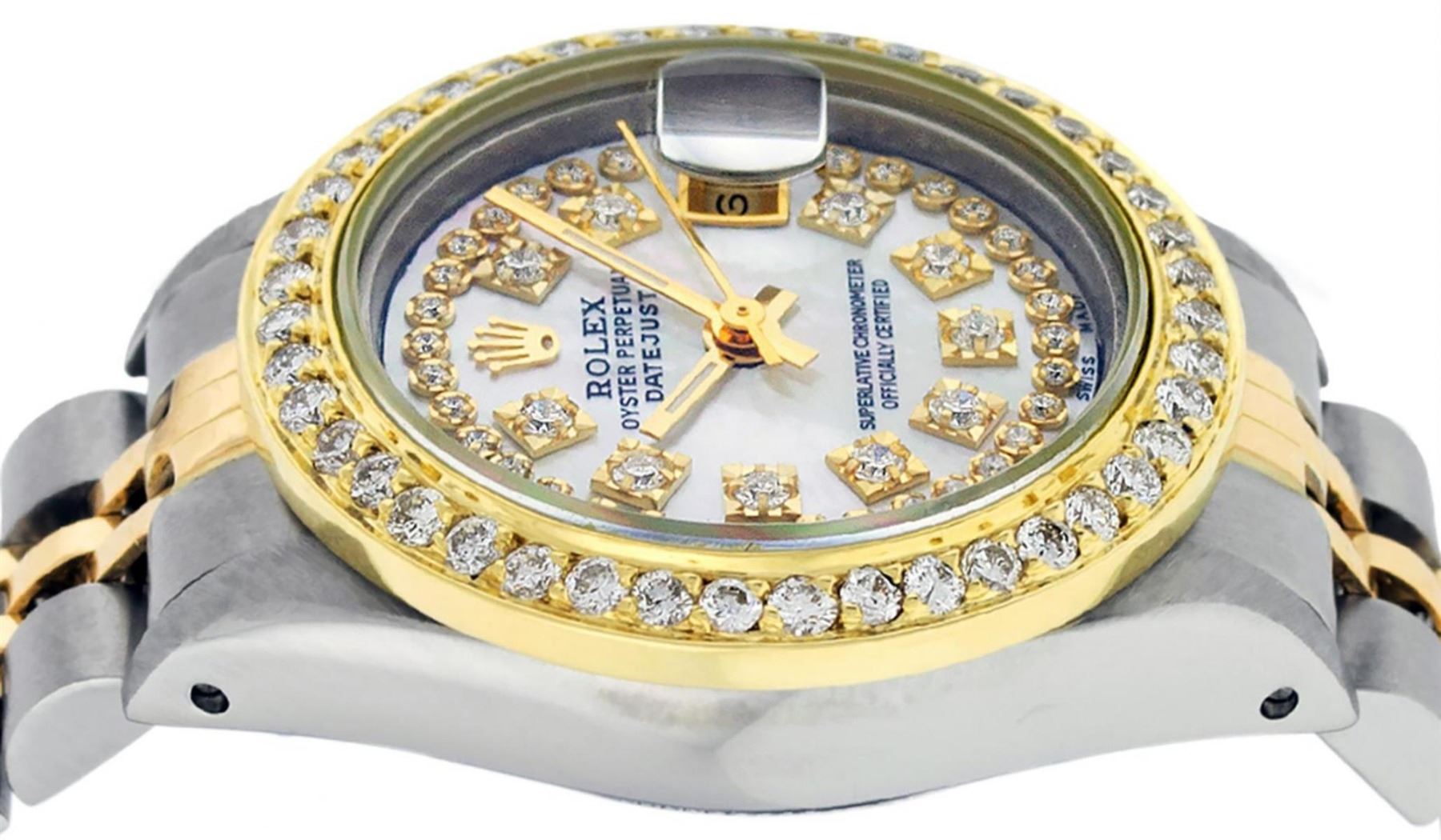 One Ladies Two Tone Rolex Datejust Polished, Serviced & Electronically Tested, Yellow Gold & Stainless Steel Case: 26mm, Yellow Gold Crown, Custom Bezel: New 18K 1ctw Yellow Gold Beadset Diamond Bezel, Diamond Count: 44 Diamonds, Total Weight 1.00 Carat, Clarity: Si-VS, Color: G to H. Custom Crystal: New Synthetic Sapphire Cyclops Lens. Custom Hands: New Luminescent Hands. Movement: Automatic Winding Movement. Custom Dial: Mother Of Pearl String Diamond Dial, Diamond Count: 43 Single Cut Diamonds in Dial, G To H In Color, VS Clarity. Date Window: 3 O'Clock Position Date Display, Model: Datejust, Condition: G-6 Extra Fine. Bracelet: Two Tone Yellow Gold & Stainless Steel Jubilee. Bright Polish. 6.0 Inch Length, Adjustable. Standard Clasp, With Rolex Logo. This Watch Has Been Serviced Time Tested And Is In Excellent Condition It Is Free Of All Scratches And Dents.