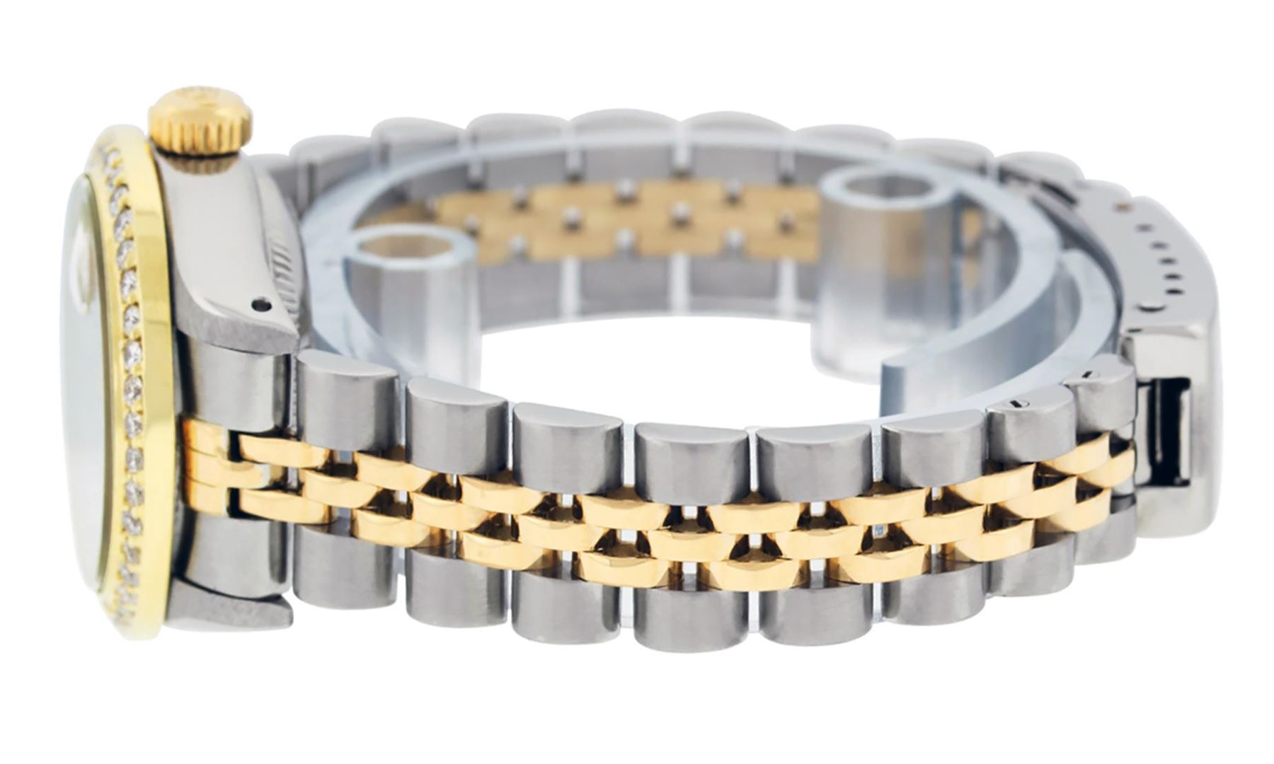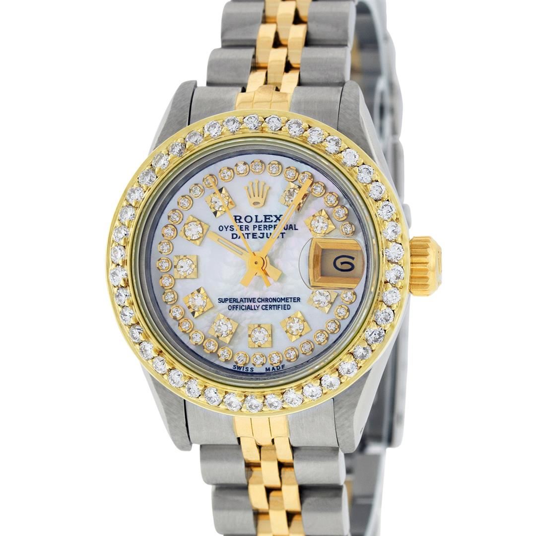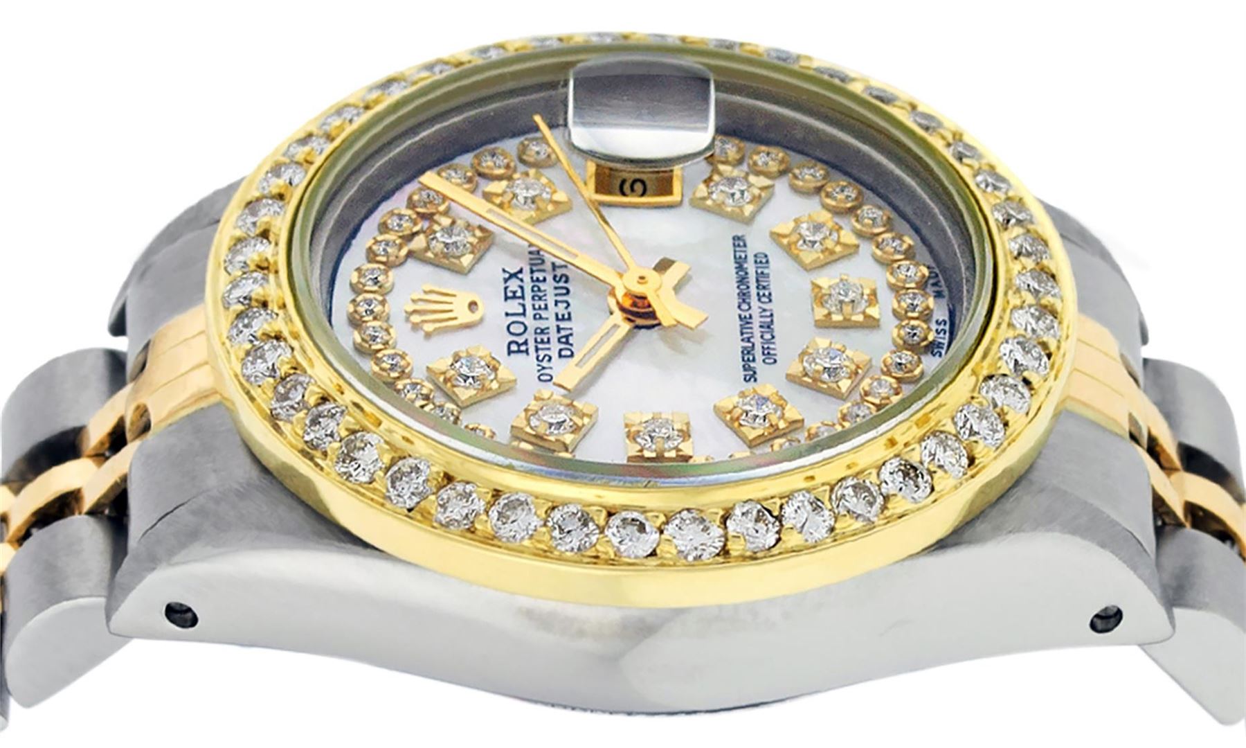 One Ladies Pre Owned Two Tone Rolex Datejust Polished, Serviced & Electronically Tested, Rolex Yellow Gold & Stainless Steel Case: 26mm, Rolex Yellow Gold Crown, Custom Bezel: New 18K 1ctw Yellow Gold Beadset Diamond Bezel, Diamond Count: 44 Diamonds, Total Weight 1.00 Carat, Clarity: SI-VS, Color: G to H. Custom Crystal: New Sapphire Magnified Date. Custom Hands: New Luminescent Hands. Rolex Movement: Automatic Winding Movement. Custom Dial: Mother Of Pearl String Diamond Dial, Diamond Count: 43 Single Cut Diamonds in Dial, G To H In Color, VS Clarity. Date Window: 3 O'Clock Position Date Display, Model: Datejust, Condition: G-6 Extra Fine. Rolex Bracelet: Two Tone Yellow Gold & Stainless Steel Jubilee. Bright Polish. 6.0 Inch Length, Adjustable. Standard Clasp, With Rolex Logo. This Watch Has Been Serviced Time Tested And Is In Excellent Condition It Is Free Of All Scratches And Dents.
