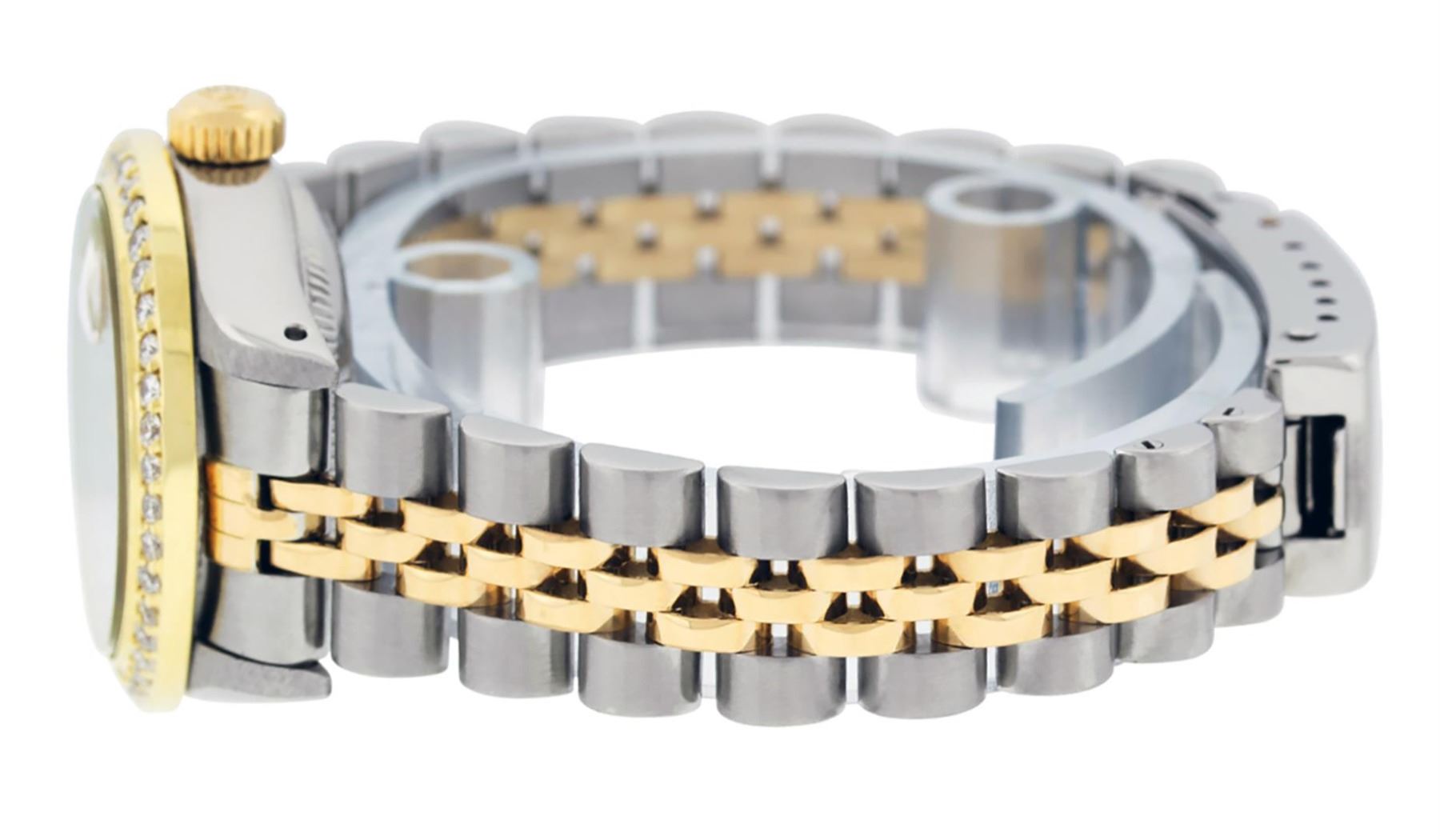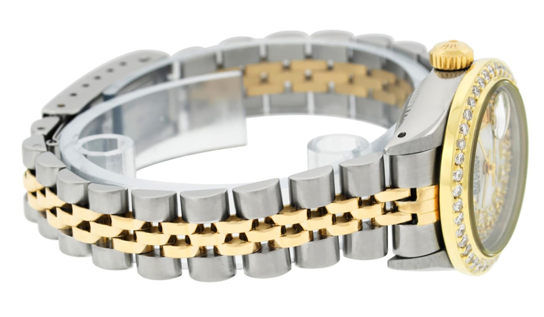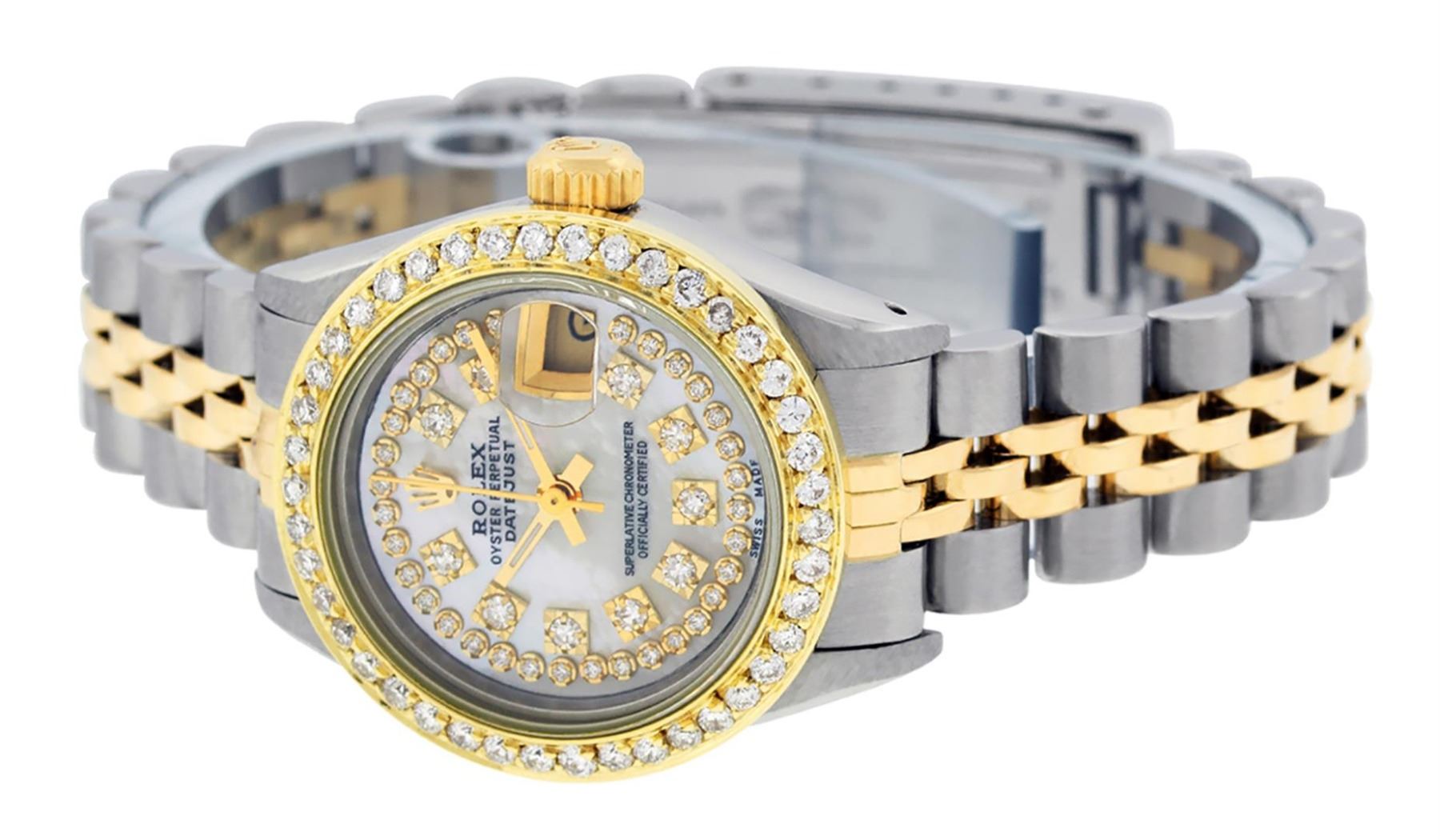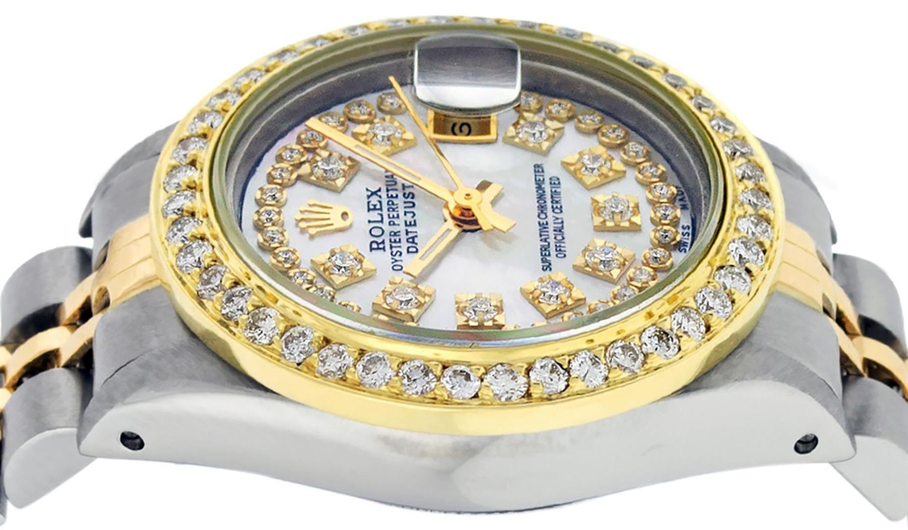 One Ladies Pre Owned Two Tone Rolex Datejust Polished, Serviced & Electronically Tested, Rolex Yellow Gold & Stainless Steel Case: 26mm, Rolex Yellow Gold Crown, Custom Bezel: New 18K 1ctw Yellow Gold Beadset Diamond Bezel, Diamond Count: 44 Diamonds, Total Weight 1.00 Carat, Clarity: SI-VS, Color: G to H. Custom Crystal: New Sapphire Magnified Date. Custom Hands: New Luminescent Hands. Rolex Movement: Automatic Winding Movement. Custom Dial: Mother Of Pearl String Diamond Dial, Diamond Count: 43 Single Cut Diamonds in Dial, G To H In Color, VS Clarity. Date Window: 3 O'Clock Position Date Display, Model: Datejust, Condition: G-6 Extra Fine. Rolex Bracelet: Two Tone Yellow Gold & Stainless Steel Jubilee. Bright Polish. 6.0 Inch Length, Adjustable. Standard Clasp, With Rolex Logo. This Watch Has Been Serviced Time Tested And Is In Excellent Condition It Is Free Of All Scratches And Dents.