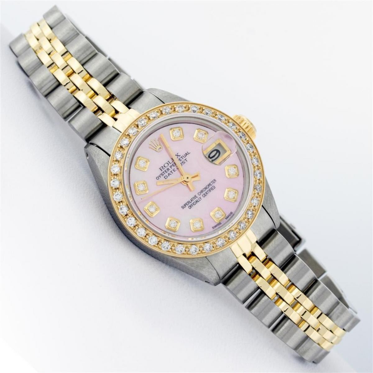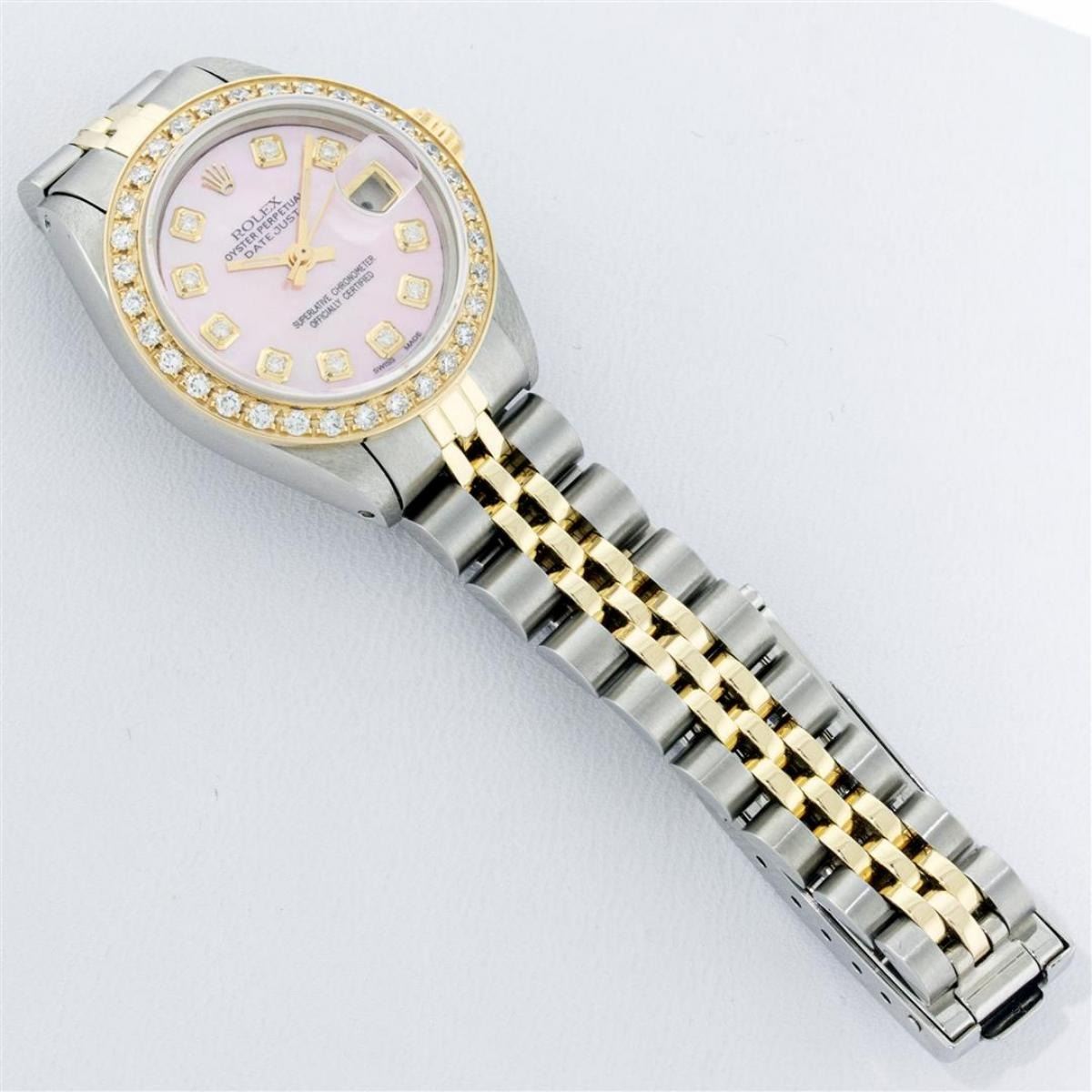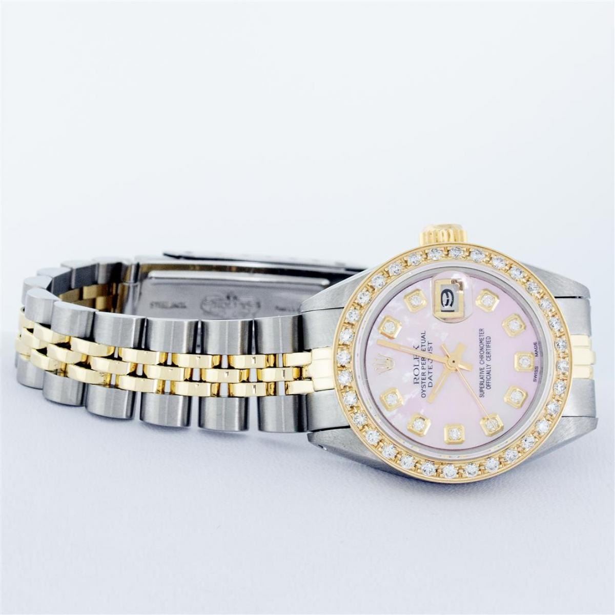 One Ladies Two Tone Rolex Datejust Polished, Serviced & Electronically Tested, Yellow Gold & Stainless Steel Case: 26mm, Yellow Gold Crown, Custom Bezel: New 18K Yellow Gold Beadset Diamond Bezel, Diamond Count: 32 Diamonds, Total Weight .70 Carat, Clarity: SI-VS, Color: G to H. Custom Crystal: New Synthetic Sapphire Cyclops Lens. Custom Hands: New Luminescent Hands. Movement: Automatic Winding Movement. Custom Dial: Pink Mother Of Pearl Diamond Dial, Diamond Count: 10 Diamonds in Dial, G To H In Color, VS Clarity. Date Window: 3 O'Clock Position Date Display, Model: Datejust, Condition: G-6 Extra Fine. Bracelet: Two Tone Yellow Gold & Stainless Steel Jubilee. Bright Polish. 6.0 Inch Length, Adjustable. Standard Clasp, With Rolex Logo. This Watch Has Been Serviced Time Tested And Is In Excellent Condition It Is Free Of All Scratches And Dents.