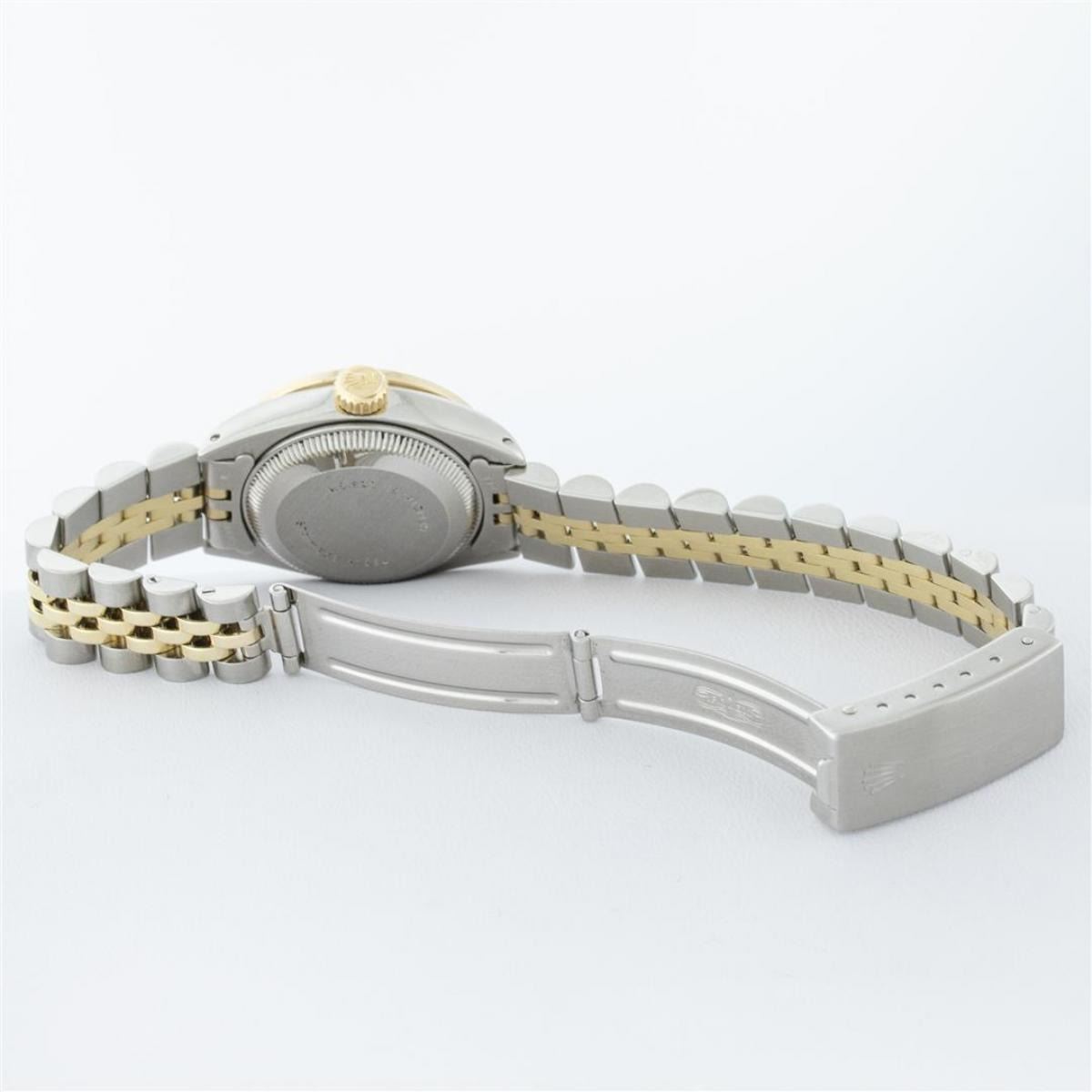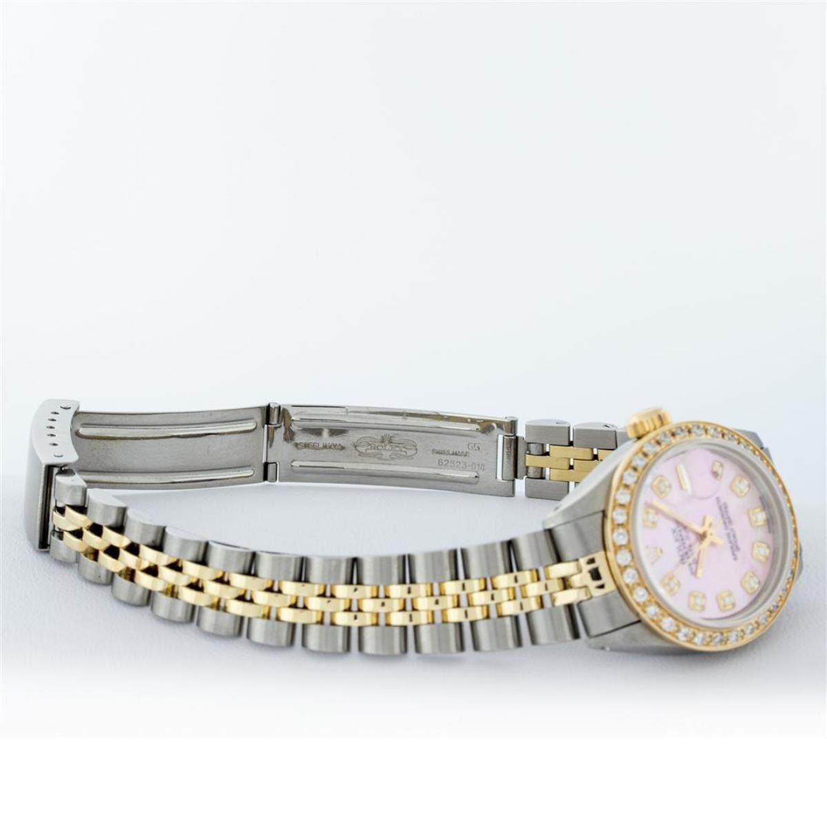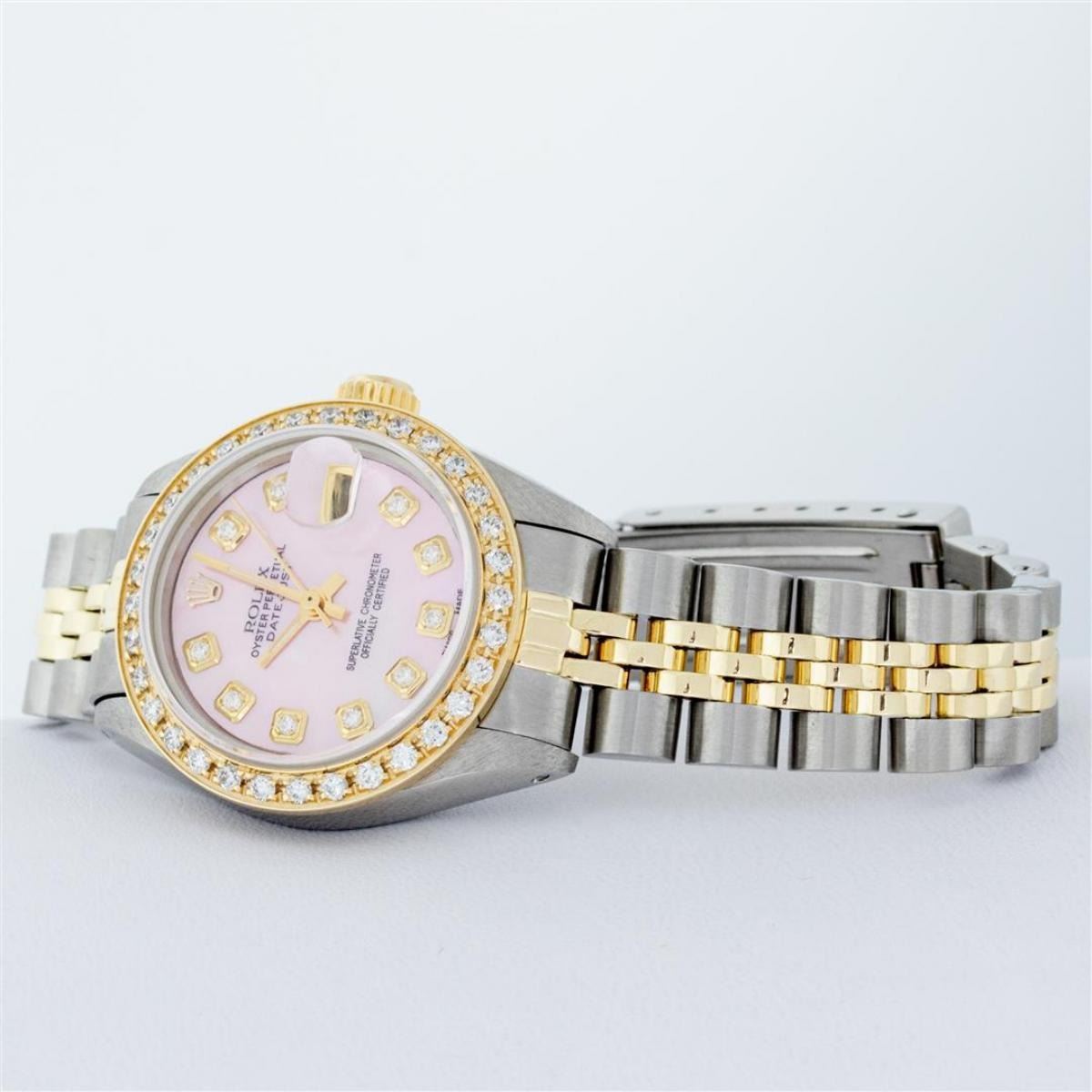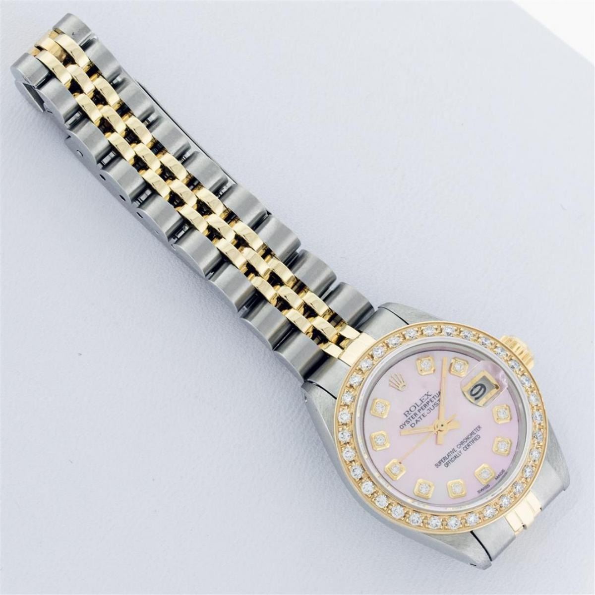 One Ladies Two Tone Rolex Datejust Polished, Serviced & Electronically Tested, Yellow Gold & Stainless Steel Case: 26mm, Yellow Gold Crown, Custom Bezel: New 18K Yellow Gold Beadset Diamond Bezel, Diamond Count: 32 Diamonds, Total Weight .70 Carat, Clarity: SI-VS, Color: G to H. Custom Crystal: New Synthetic Sapphire Cyclops Lens. Custom Hands: New Luminescent Hands. Movement: Automatic Winding Movement. Custom Dial: Pink Mother Of Pearl Diamond Dial, Diamond Count: 10 Diamonds in Dial, G To H In Color, VS Clarity. Date Window: 3 O'Clock Position Date Display, Model: Datejust, Condition: G-6 Extra Fine. Bracelet: Two Tone Yellow Gold & Stainless Steel Jubilee. Bright Polish. 6.0 Inch Length, Adjustable. Standard Clasp, With Rolex Logo. This Watch Has Been Serviced Time Tested And Is In Excellent Condition It Is Free Of All Scratches And Dents.