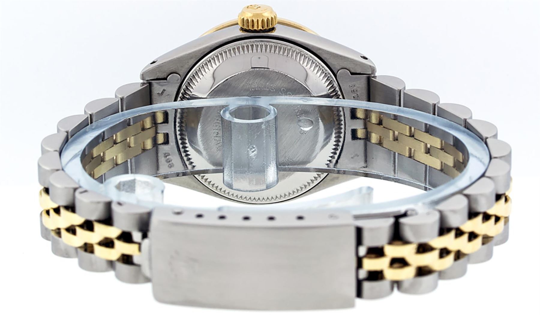 One Ladies Two Tone Rolex Datejust Polished, Serviced & Electronically Tested, Yellow Gold & Stainless Steel Case: 26mm, Yellow Gold Crown, Custom Bezel: New 18K Yellow Gold Ruby Beadset Diamond Bezel, Diamond + Gem Count: 28 Diamonds + 4 Rubies Total Weight .70 Carat, Clarity: SI-VS, Color: G to H. Custom Crystal: New Synthetic Sapphire Cyclops Lens. Custom Hands: New Luminescent Hands. Movement: Automatic Winding Movement. Custom Dial: Pink Mother Of Pearl Roman Dial With Square Track. Date Window: 3 O'Clock Position Date Display, Model: Datejust, Condition: G-6 Extra Fine. Bracelet: Two Tone Yellow Gold & Stainless Steel Jubilee. Bright Polish. 6.0 Inch Length, Adjustable. Standard Clasp, With Rolex Logo. This Watch Has Been Serviced Time Tested And Is In Excellent Condition It Is Free Of All Scratches And Dents.