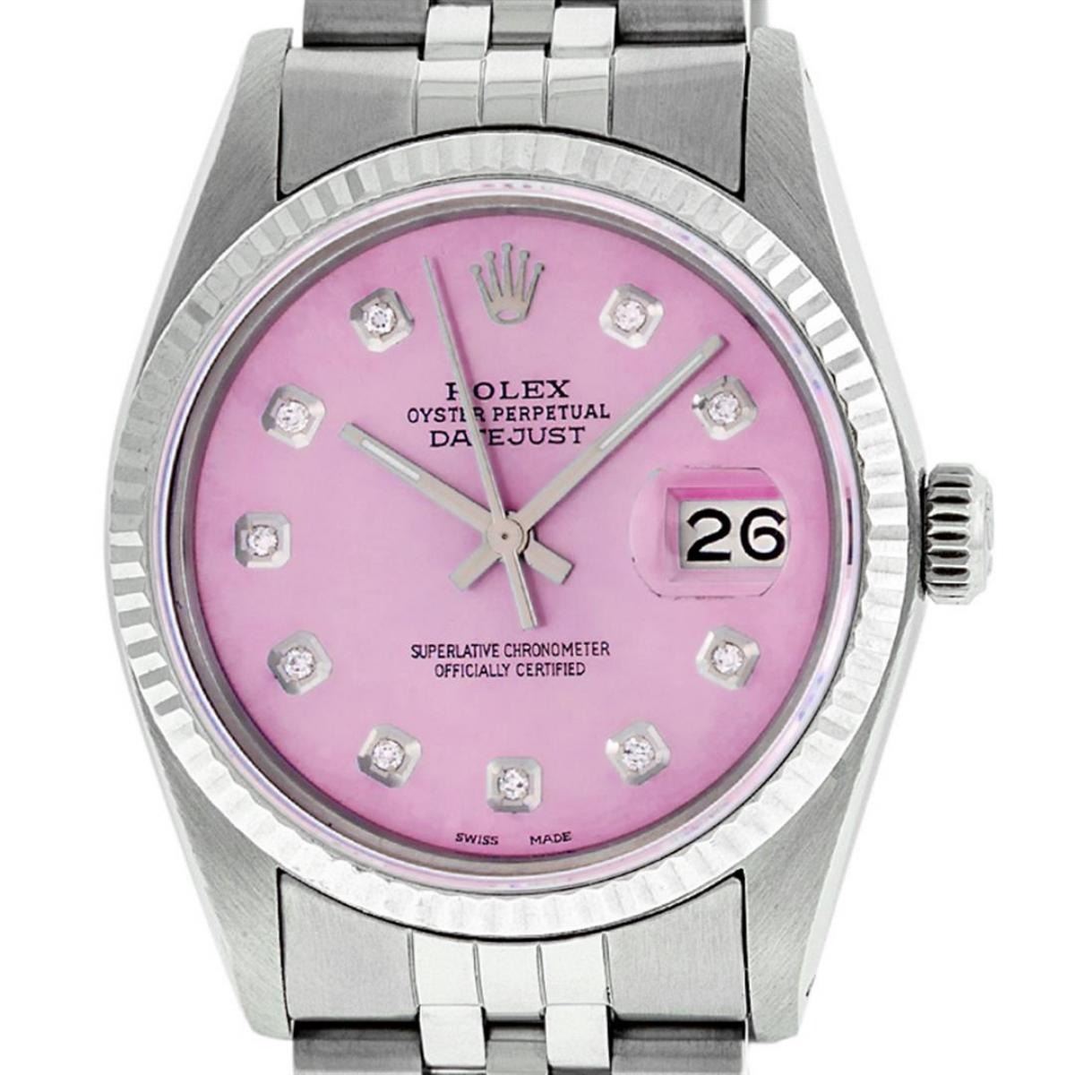 One Ladies Two Tone Rolex Datejust Polished, Serviced & Electronically Tested, Yellow Gold & Stainless Steel Case: 26mm, Yellow Gold Crown, Custom Bezel: New 18K Yellow Gold Sapphire Beadset Diamond Bezel, Diamond Count: 28 Diamonds + 4 Sapphires, Total Weight .70 Carat, Clarity: SI-VS, Color: G to H. Custom Crystal: New Synthetic Sapphire Cyclops Lens. Custom Hands: New Luminescent Hands. Movement: Automatic Winding Movement. Custom Dial: Pink Mother Of Pearl With Sapphire String Diamond Hour Markers. Stone Count: 10 Sapphires + 33 Diamonds In Dial, Clarity: SI-VS, Color: G to H. Date Window: 3 O'Clock Position Date Display, Model: Datejust. Condition: G-6 Extra Fine. Bracelet: Two Tone Yellow Gold & Stainless Steel Jubilee. Bright Polish. 6.0 Inch Length, Adjustable. Standard Clasp, With Rolex Logo. This Watch Has Been Serviced Time Tested And Is In Excellent Condition It Is Free Of All Scratches And Dents.