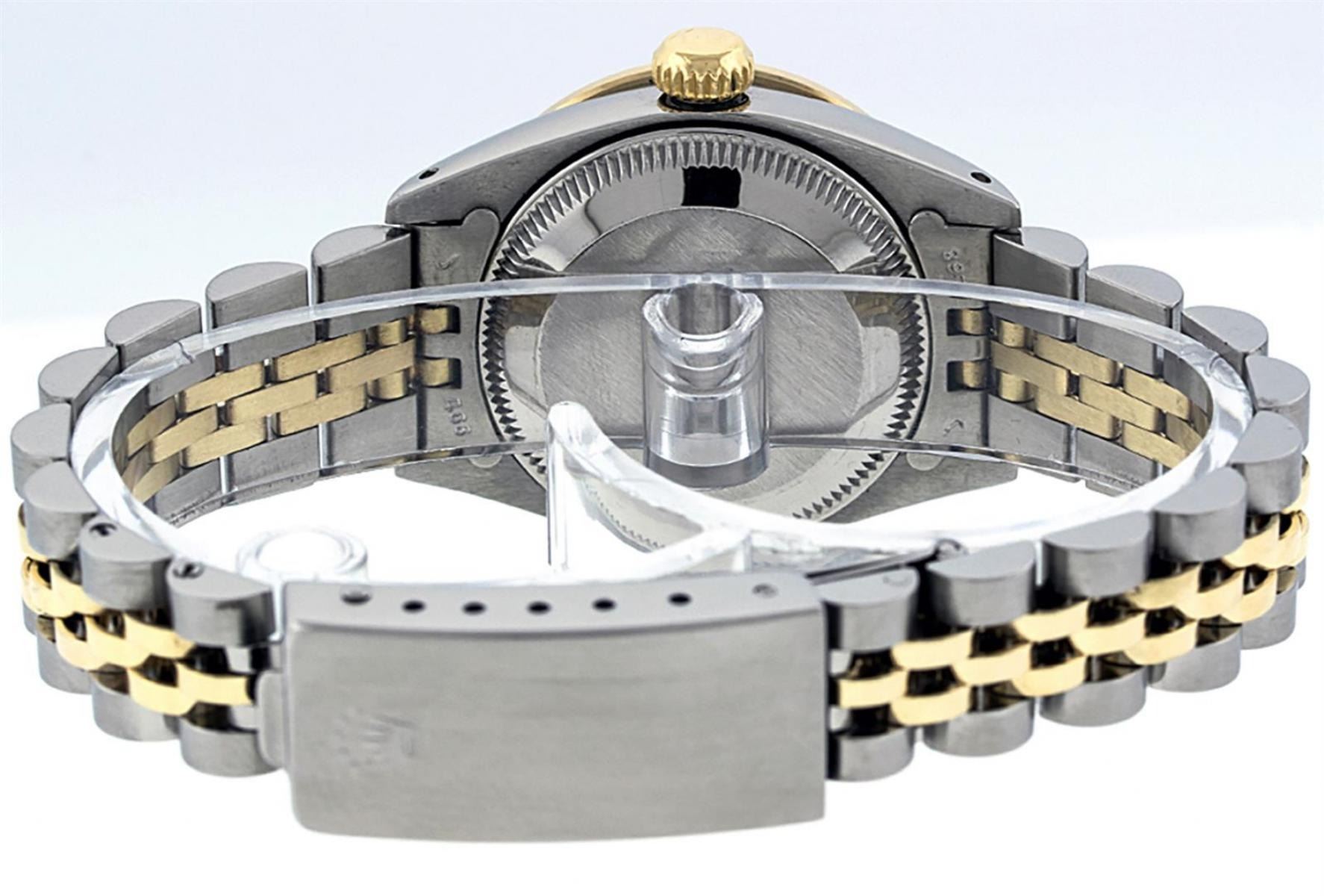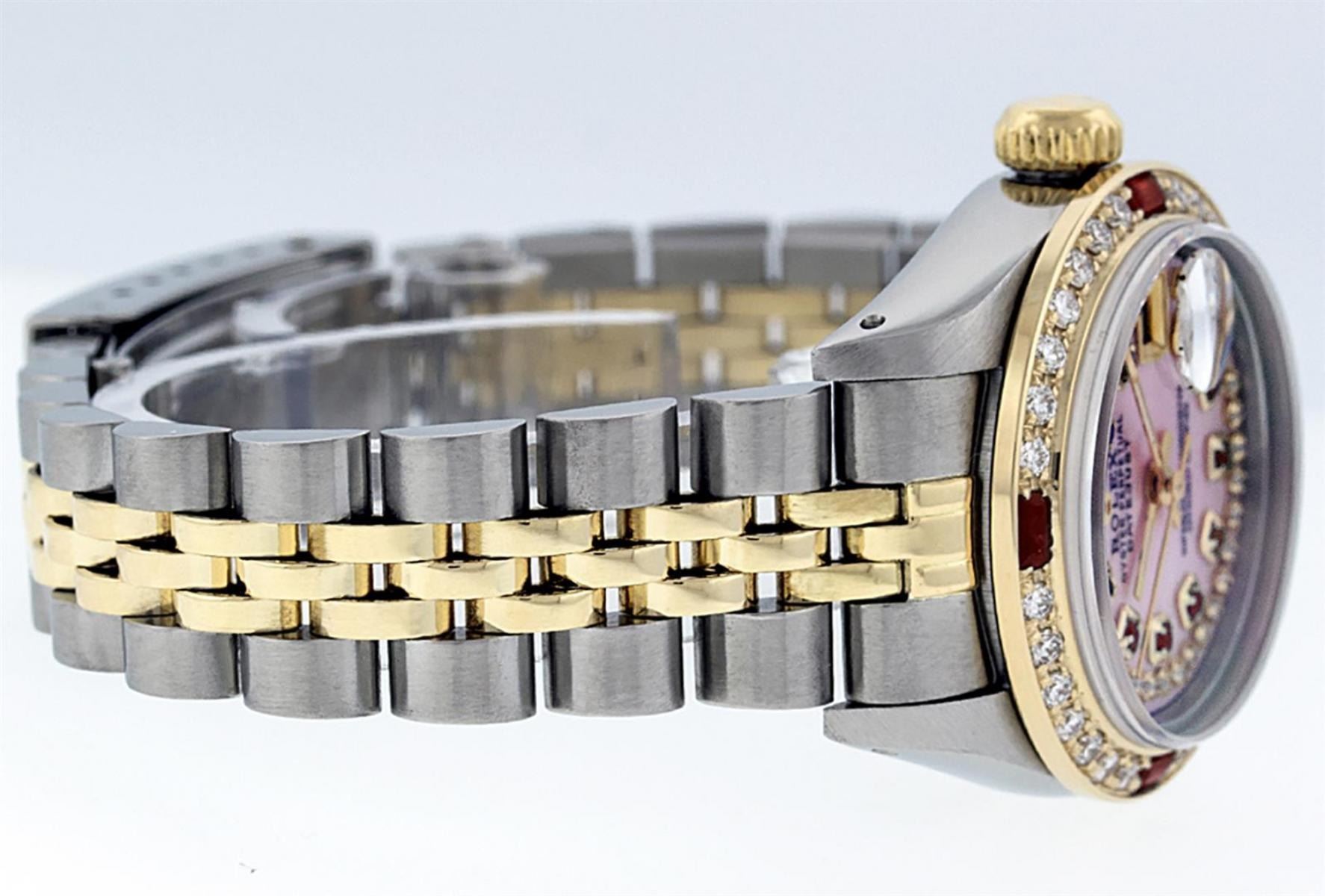 One Ladies Two Tone Rolex Datejust Polished, Serviced & Electronically Tested, Yellow Gold & Stainless Steel Case: 26mm, Yellow Gold Crown, Custom Bezel: New 18K Yellow Gold Ruby Beadset Diamond Bezel, Diamond Count: 28 Diamonds + 4 Rubies, Total Weight .70 Carat, Clarity: SI-VS, Color: G to H. Custom Crystal: New Scratch Resistant Synthetic Sapphire Cyclops Lens. Custom Hands: New Luminescent Hands. Movement: Automatic Winding Movement. Custom Dial: Pink Mother Of Pearl With Ruby String Diamond Hour Markers. Stone Count: 10 Rubies + 33 Diamonds In Dial, Clarity: SI-VS, Color: G to H. Date Window: 3 O'Clock Position Date Display, Model: Datejust. Condition: G-6 Extra Fine. Bracelet: Two Tone Yellow Gold & Stainless Steel Jubilee. Bright Polish. 6.0 Inch Length, Adjustable. Standard Clasp, With Rolex Logo. This Watch Has Been Serviced Time Tested And Is In Excellent Condition It Is Free Of All Scratches And Dents.