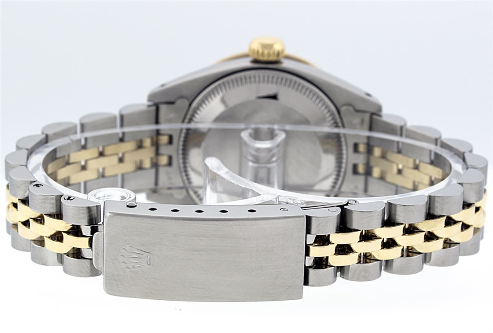 One Ladies Two Tone Rolex Datejust Polished, Serviced & Electronically Tested, Yellow Gold & Stainless Steel Case: 26mm, Yellow Gold Crown, Custom Bezel: New 18K Yellow Gold Ruby Beadset Diamond Bezel, Diamond Count: 28 Diamonds + 4 Rubies, Total Weight .70 Carat, Clarity: SI-VS, Color: G to H. Custom Crystal: New Scratch Resistant Synthetic Sapphire Cyclops Lens. Custom Hands: New Luminescent Hands. Movement: Automatic Winding Movement. Custom Dial: Pink Mother Of Pearl With Ruby String Diamond Hour Markers. Stone Count: 10 Rubies + 33 Diamonds In Dial, Clarity: SI-VS, Color: G to H. Date Window: 3 O'Clock Position Date Display, Model: Datejust. Condition: G-6 Extra Fine. Bracelet: Two Tone Yellow Gold & Stainless Steel Jubilee. Bright Polish. 6.0 Inch Length, Adjustable. Standard Clasp, With Rolex Logo. This Watch Has Been Serviced Time Tested And Is In Excellent Condition It Is Free Of All Scratches And Dents.