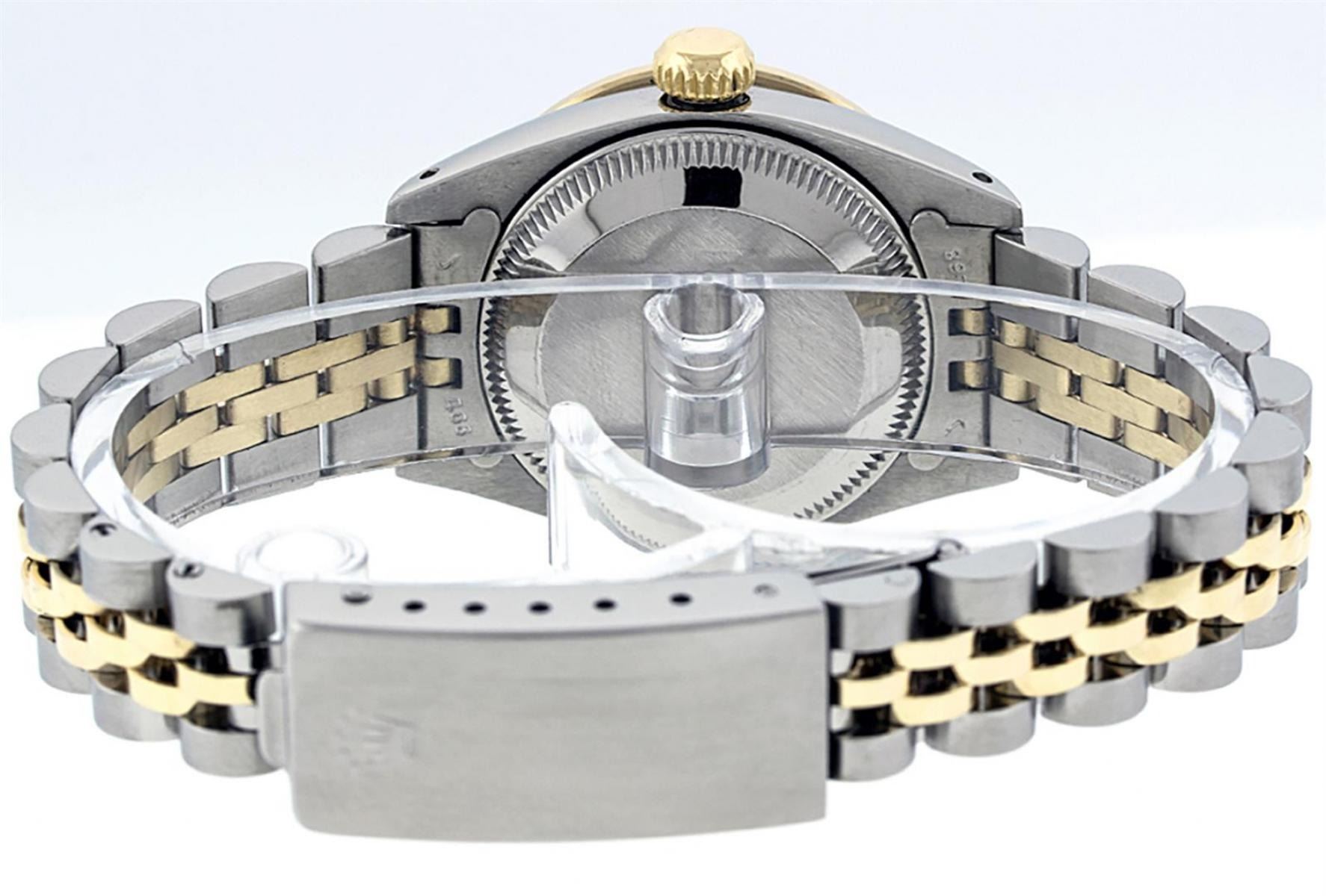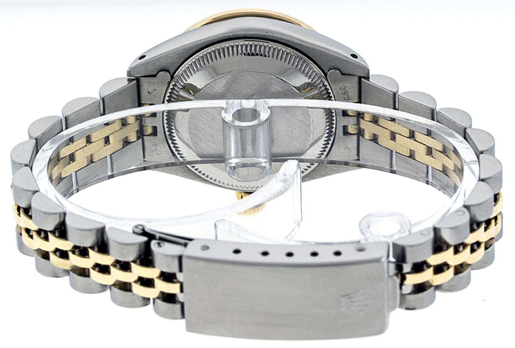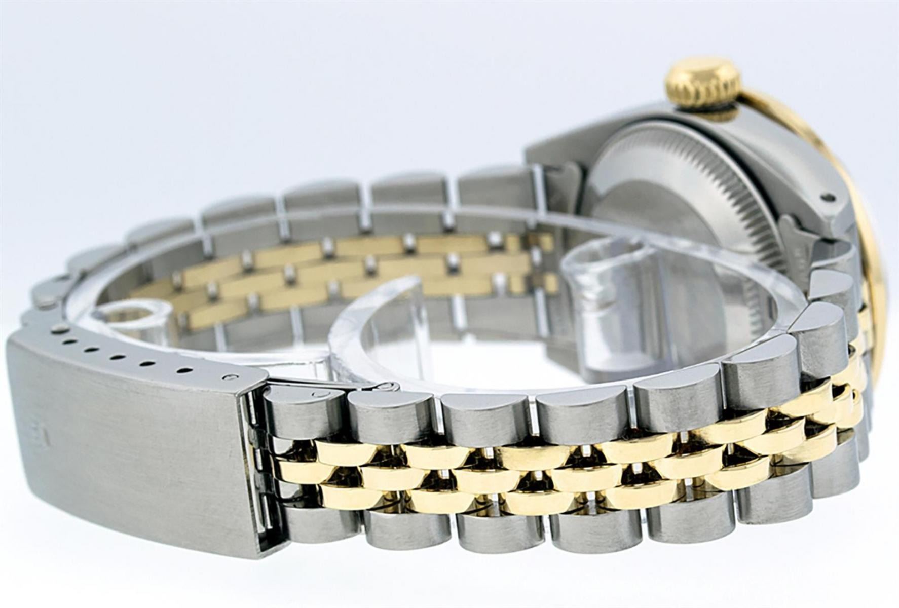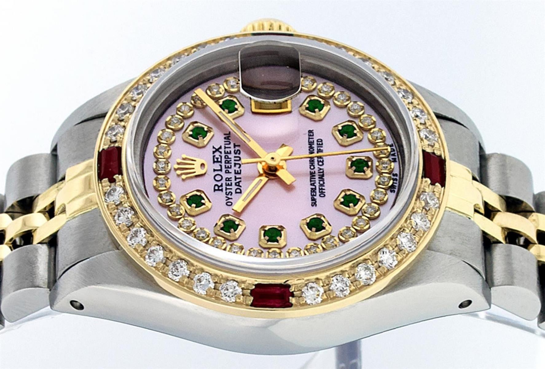 One Ladies Pre Owned Two Tone Rolex Datejust Polished, Serviced & Electronically Tested, Yellow Gold & Stainless Steel Case: 26mm, Yellow Gold Crown, Custom Bezel: New 18K New Yellow Gold Ruby Beadset Diamond Bezel, Stone Count: 28 Diamonds + 4 Rubies In