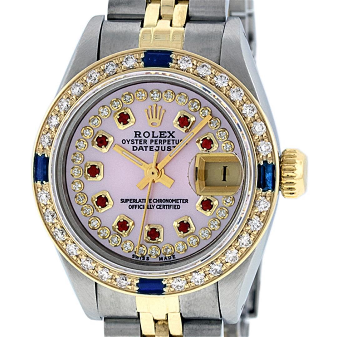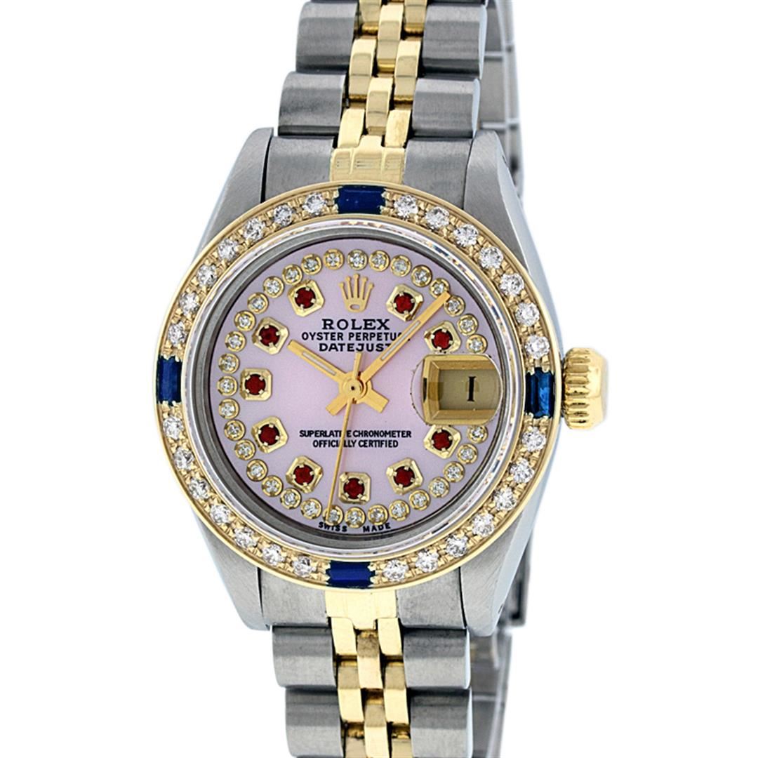 One Ladies Two Tone Rolex Datejust Polished, Serviced & Electronically Tested, Yellow Gold & Stainless Steel Case: 26mm, Yellow Gold Crown, Custom Bezel: New 18K New Yellow Gold Sapphire Beadset Diamond Bezel, Diamond Count: 28 Diamonds + 4 Sapphires In Dial, Total Weight .70 Carat, Clarity: SI-VS, Color: G to H. Custom Crystal: New Scratch Resistant Synthetic Sapphire Cyclops Lens. Custom Hands: New Luminescent Hands. Movement: Automatic Winding Movement. Custom Dial: Pink Mother Of Pearl Ruby String Diamond Dial, Stone Count: 10 Rubies + 33 Diamonds In Dial, Clarity: SI-VS, Color: G to H. Date Window: 3 O'Clock Position Date Display, Model: Datejust. Condition: G-6 Extra Fine. Bracelet: Two Tone Yellow Gold & Stainless Steel Jubilee Band. Bright Polish. 6.0 Inch Length, Adjustable. Standard Clasp, With Rolex Logo. This Watch Has Been Serviced Time Tested And Is In Excellent Condition It Is Free Of All Scratches And Dents.