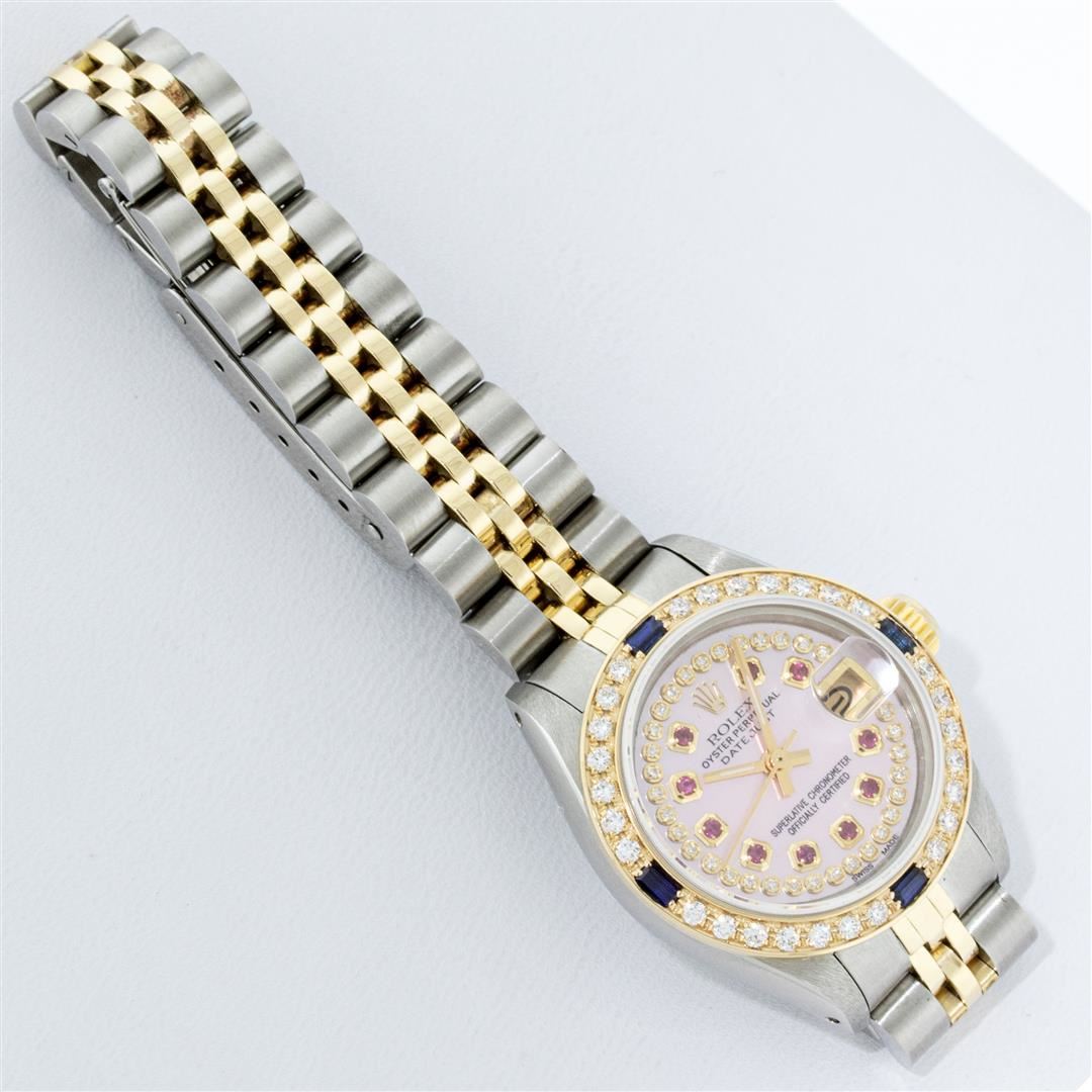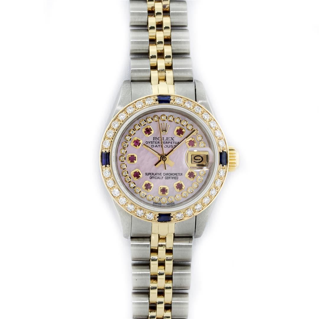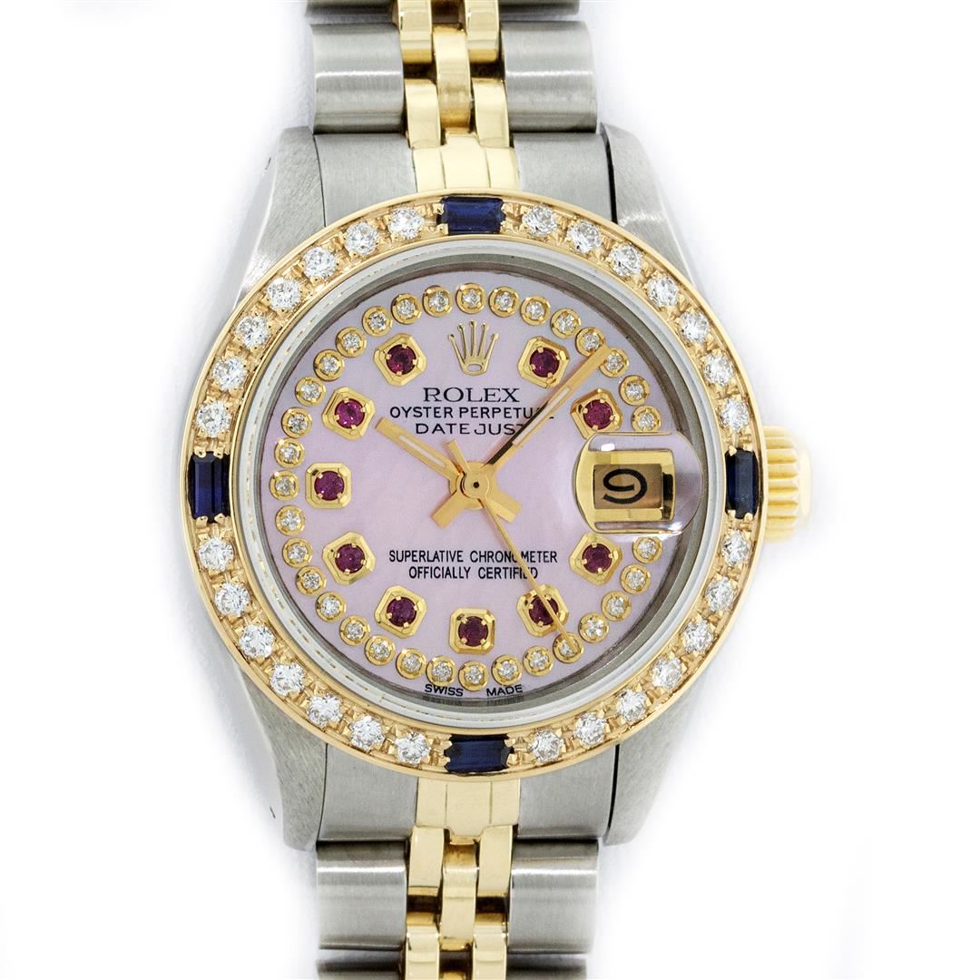 One Ladies Two Tone Rolex Datejust Polished, Serviced & Electronically Tested, Yellow Gold & Stainless Steel Case: 26mm, Yellow Gold Crown, Custom Bezel: New 18K New Yellow Gold Sapphire Beadset Diamond Bezel, Diamond Count: 28 Diamonds + 4 Sapphires In Dial, Total Weight .70 Carat, Clarity: SI-VS, Color: G to H. Custom Crystal: New Sapphire With Date Window. Custom Hands: New Luminescent Hands. Rolex Movement: Automatic Winding Movement. Custom Dial: Pink Mother Of Pearl Ruby String Diamond Dial, Stone Count: 10 Rubies + 33 Diamonds In Dial, Clarity: SI-VS, Color: G to H. Date Window: 3 O'Clock Position Date Display, Model: Datejust. Condition: G-6 Extra Fine. Rolex Bracelet: Two Tone Yellow Gold & Stainless Steel Jubilee Band. Bright Polish. 6.0 Inch Length, Adjustable. Standard Clasp, With Rolex Logo. This Watch Has Been Serviced Time Tested And Is In Excellent Condition It Is Free Of All Scratches And Dents.