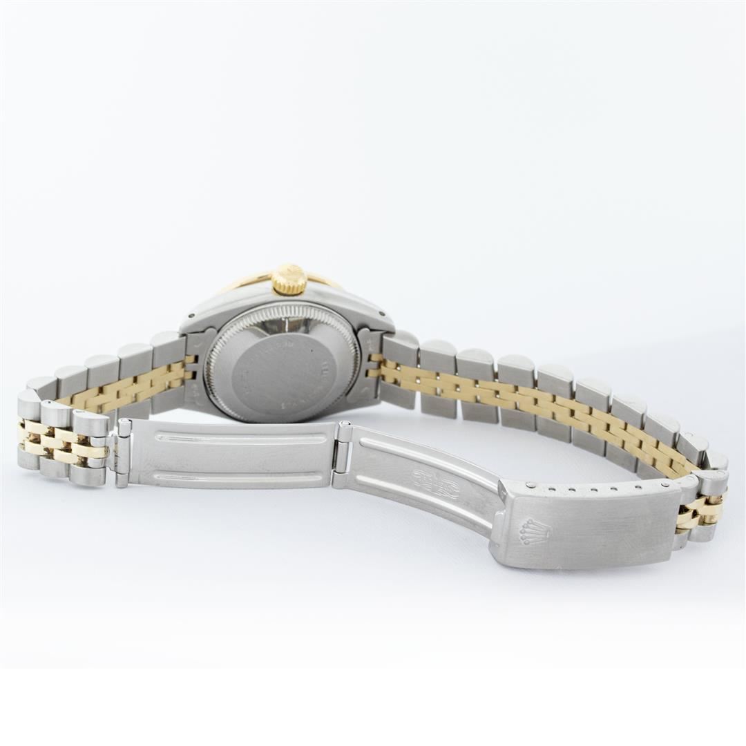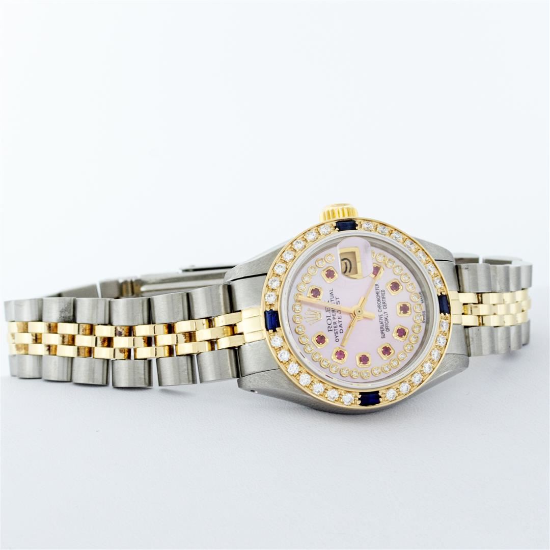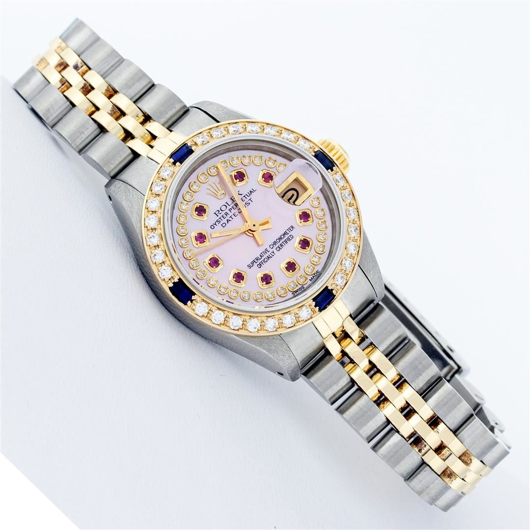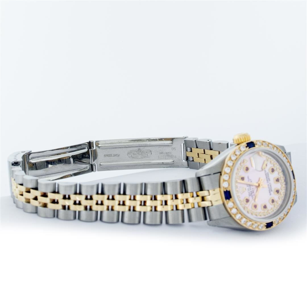 One Ladies Two Tone Rolex Datejust Polished, Serviced & Electronically Tested, Yellow Gold & Stainless Steel Case: 26mm, Yellow Gold Crown, Custom Bezel: New 18K New Yellow Gold Sapphire Beadset Diamond Bezel, Diamond Count: 28 Diamonds + 4 Sapphires In Dial, Total Weight .70 Carat, Clarity: SI-VS, Color: G to H. Custom Crystal: New Sapphire With Date Window. Custom Hands: New Luminescent Hands. Rolex Movement: Automatic Winding Movement. Custom Dial: Pink Mother Of Pearl Ruby String Diamond Dial, Stone Count: 10 Rubies + 33 Diamonds In Dial, Clarity: SI-VS, Color: G to H. Date Window: 3 O'Clock Position Date Display, Model: Datejust. Condition: G-6 Extra Fine. Rolex Bracelet: Two Tone Yellow Gold & Stainless Steel Jubilee Band. Bright Polish. 6.0 Inch Length, Adjustable. Standard Clasp, With Rolex Logo. This Watch Has Been Serviced Time Tested And Is In Excellent Condition It Is Free Of All Scratches And Dents.