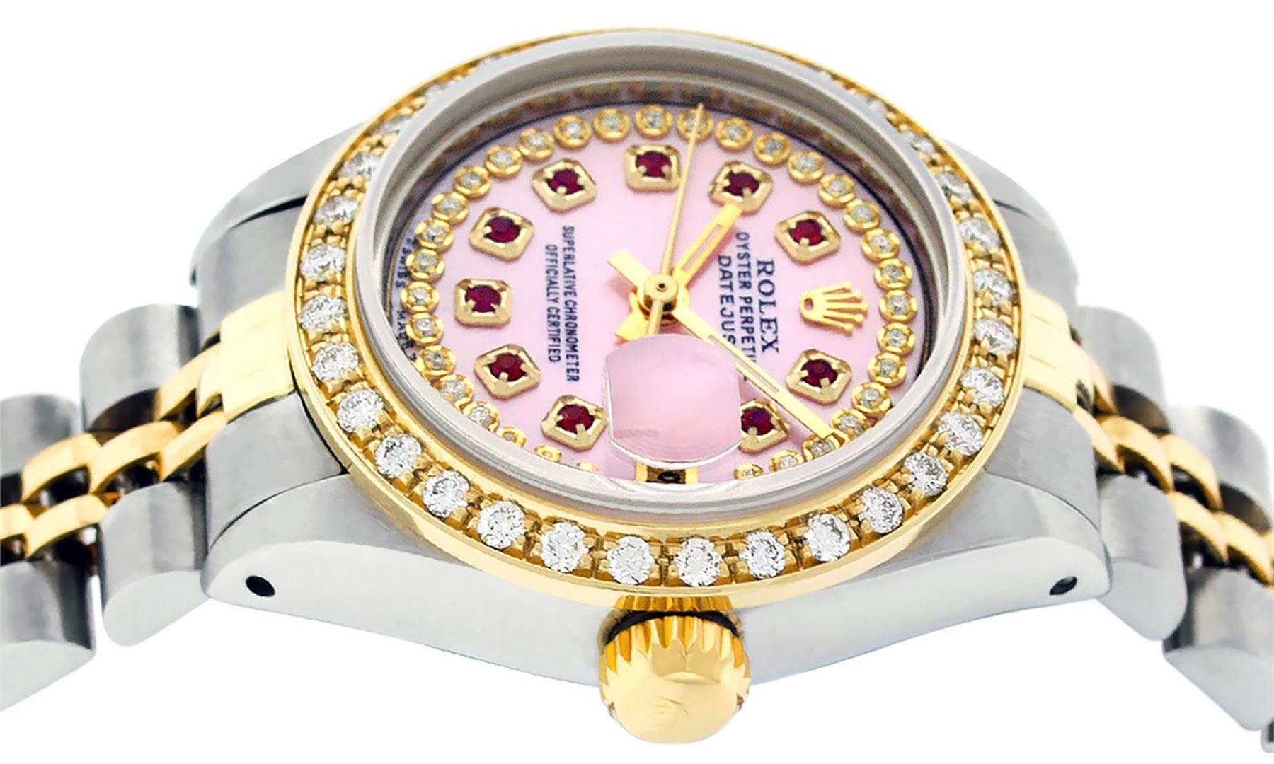 One Ladies Two Tone Rolex Datejust Polished, Serviced & Electronically Tested, Yellow Gold & Stainless Steel Case: 26mm, Yellow Gold Crown, Custom Bezel: New 18K Yellow Gold Beadset Diamond Bezel, Diamond Count: 43 Diamonds in dial, Total Bezel Weight .70 Carat, Clarity: SI-VS, Color: G to H. Custom Crystal: New Synthetic Sapphire Cyclops Lens. Custom Hands: New Luminescent Hands. Movement: Automatic Winding Movement. Custom Dial: Pink Mother Of Pearl String Diamond and Ruby Dial, Stone Count: 33 Diamonds + 10 Ruby, Clarity: SI-VS, Color: G to H. Date Window: 3 O'Clock Position Date Display, Model: Datejust. Condition: G-6 Extra Fine. Bracelet: Two Tone Yellow Gold & Stainless Steel Jubilee Band. Bright Polish. 6.0 Inch Length, Adjustable. Standard Clasp, With Rolex Logo. This Watch Has Been Serviced Time Tested And Is In Excellent Condition It Is Free Of All Scratches And Dents.