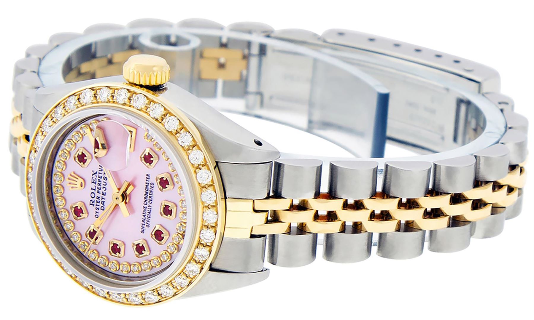 One Ladies Two Tone Rolex Datejust Polished, Serviced & Electronically Tested, Yellow Gold & Stainless Steel Case: 26mm, Yellow Gold Crown, Custom Bezel: New 18K Yellow Gold Beadset Diamond Bezel, Diamond Count: 43 Diamonds in dial, Total Bezel Weight .70 Carat, Clarity: SI-VS, Color: G to H. Custom Crystal: New Synthetic Sapphire Cyclops Lens. Custom Hands: New Luminescent Hands. Movement: Automatic Winding Movement. Custom Dial: Pink Mother Of Pearl String Diamond and Ruby Dial, Stone Count: 33 Diamonds + 10 Ruby, Clarity: SI-VS, Color: G to H. Date Window: 3 O'Clock Position Date Display, Model: Datejust. Condition: G-6 Extra Fine. Bracelet: Two Tone Yellow Gold & Stainless Steel Jubilee Band. Bright Polish. 6.0 Inch Length, Adjustable. Standard Clasp, With Rolex Logo. This Watch Has Been Serviced Time Tested And Is In Excellent Condition It Is Free Of All Scratches And Dents.