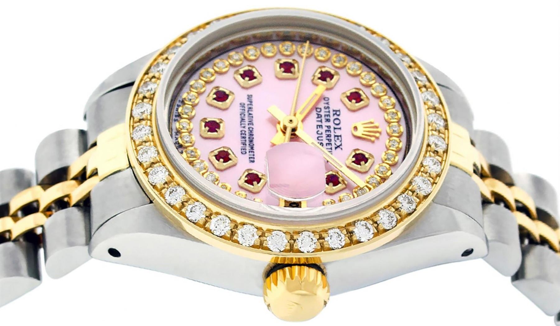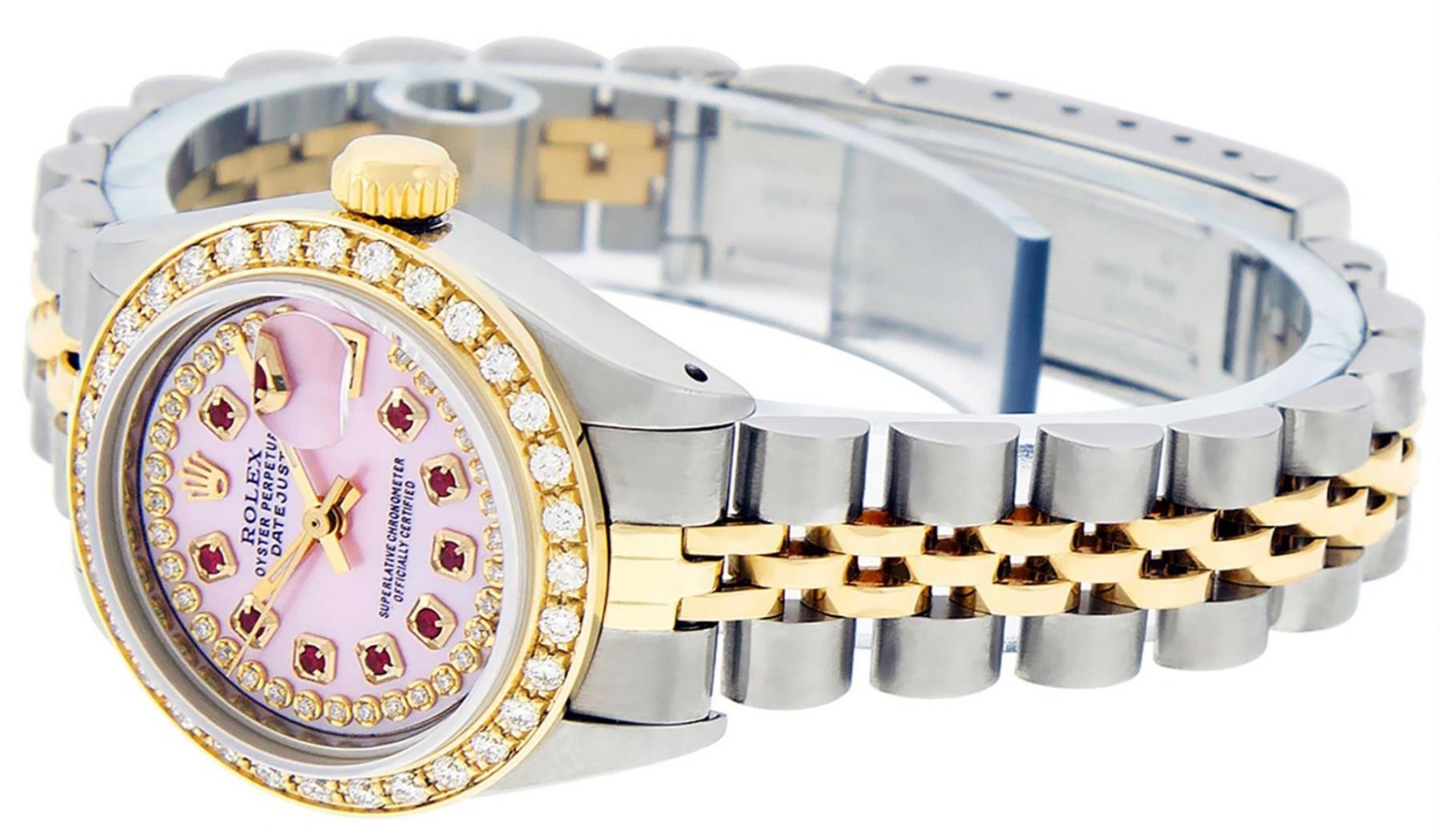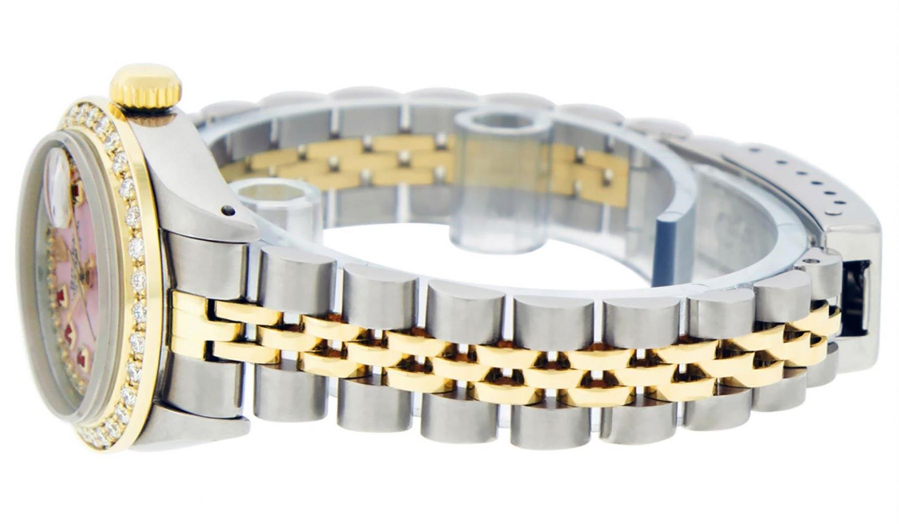 One Ladies Two Tone Rolex Datejust Polished, Serviced & Electronically Tested, Yellow Gold & Stainless Steel Case: 26mm, Yellow Gold Crown, Custom Bezel: New 18K Yellow Gold Beadset Diamond Bezel, Diamond Count: 43 Diamonds in dial, Total Bezel Weight .70 Carat, Clarity: SI-VS, Color: G to H. Custom Crystal: New Synthetic Sapphire Cyclops Lens. Custom Hands: New Luminescent Hands. Movement: Automatic Winding Movement. Custom Dial: Pink Mother Of Pearl String Diamond and Ruby Dial, Stone Count: 33 Diamonds + 10 Ruby, Clarity: SI-VS, Color: G to H. Date Window: 3 O'Clock Position Date Display, Model: Datejust. Condition: G-6 Extra Fine. Bracelet: Two Tone Yellow Gold & Stainless Steel Jubilee Band. Bright Polish. 6.0 Inch Length, Adjustable. Standard Clasp, With Rolex Logo. This Watch Has Been Serviced Time Tested And Is In Excellent Condition It Is Free Of All Scratches And Dents.