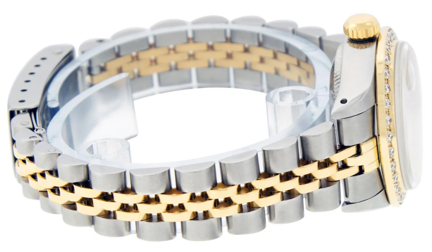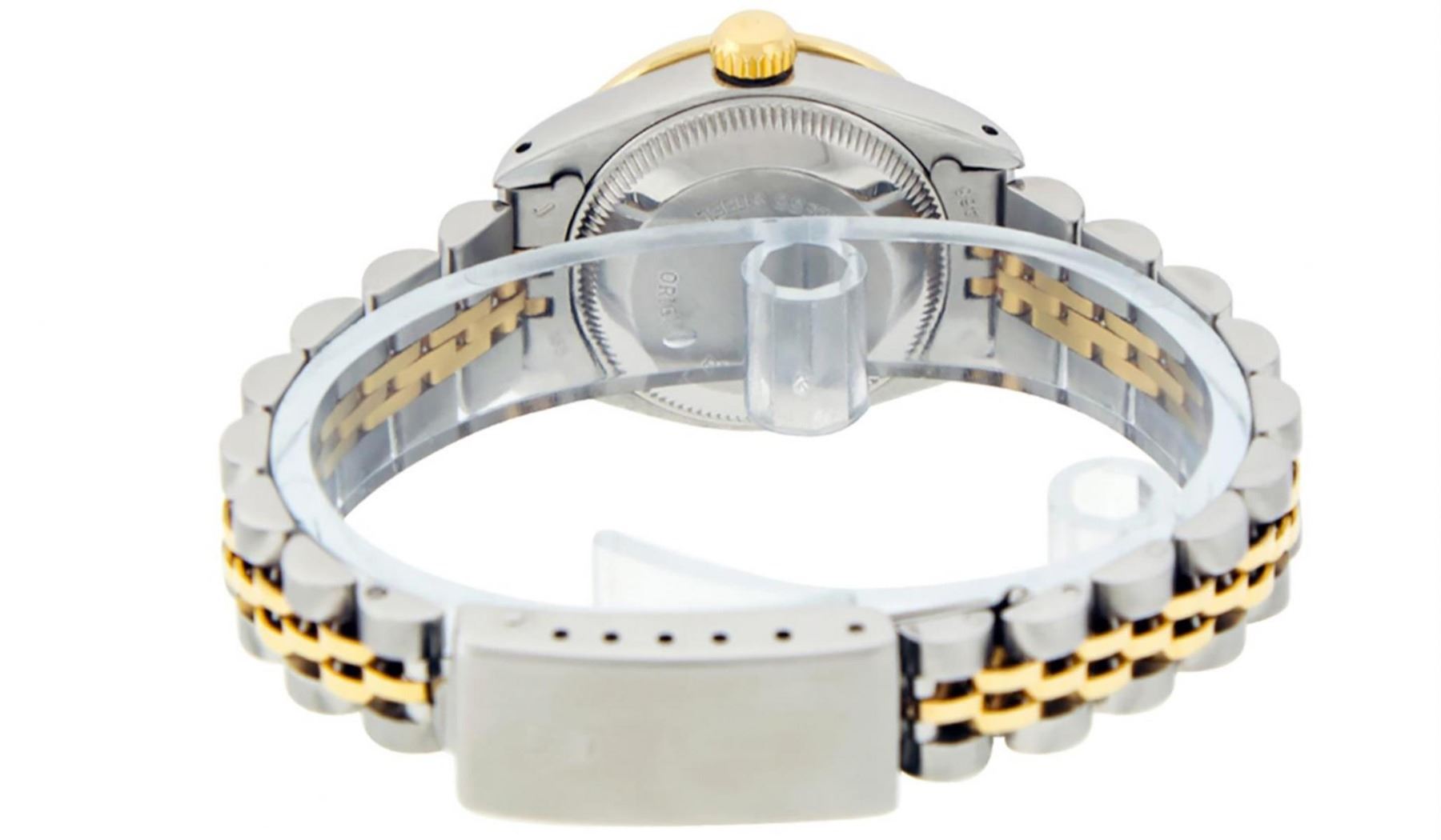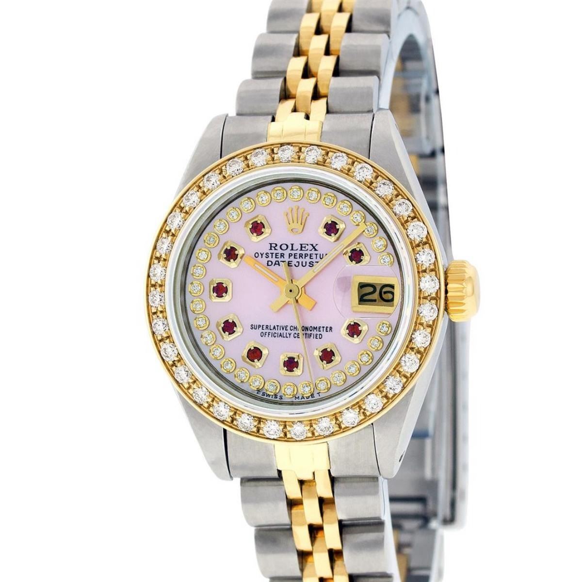 One Ladies Two Tone Rolex Datejust Polished, Serviced & Electronically Tested, Yellow Gold & Stainless Steel Case: 26mm, Yellow Gold Crown, Custom Bezel: New 18K Yellow Gold Beadset Diamond Bezel, Diamond Count: 43 Diamonds in dial, Total Bezel Weight .70 Carat, Clarity: SI-VS, Color: G to H. Custom Crystal: New Synthetic Sapphire Cyclops Lens. Custom Hands: New Luminescent Hands. Movement: Automatic Winding Movement. Custom Dial: Pink Mother Of Pearl String Diamond and Ruby Dial, Stone Count: 33 Diamonds + 10 Ruby, Clarity: SI-VS, Color: G to H. Date Window: 3 O'Clock Position Date Display, Model: Datejust. Condition: G-6 Extra Fine. Bracelet: Two Tone Yellow Gold & Stainless Steel Jubilee Band. Bright Polish. 6.0 Inch Length, Adjustable. Standard Clasp, With Rolex Logo. This Watch Has Been Serviced Time Tested And Is In Excellent Condition It Is Free Of All Scratches And Dents.