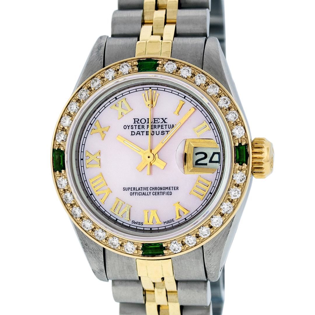 One Ladies 14K Two Tone Rolex Datejust Polished, Serviced & Electronically Tested, 14K Yellow Gold & Stainless Steel Case: 26mm, 14K Yellow Gold Crown, Custom Bezel: New 18K Yellow Gold Emerald Beadset Diamond Bezel, Diamond + Gem Count: 28 Diamonds + 4 Emeralds Total Weight .70 Carat, Clarity: SI-VS, Color: G to H. Custom Crystal: New Scratch Resistant Synthetic Sapphire Cyclops Lens. Custom Hands: New Luminescent Hands. Movement: Automatic Winding Movement Caliber 2030. Custom Dial: Pink Mother Of Pearl With Roman Hour Markers and Square Track. Date Window: 3 O'Clock Position Date Display, Model: Datejust, Condition: G-6 Extra Fine. Bracelet: Two Tone 14K Yellow Gold & Stainless Steel Jubilee Band. Bright Polish. 6.0 Inch Length, Adjustable. Standard Clasp, With Rolex Logo. This Watch Has Been Serviced Time Tested And Is In Excellent Condition It Is Free Of All Scratches And Dents.