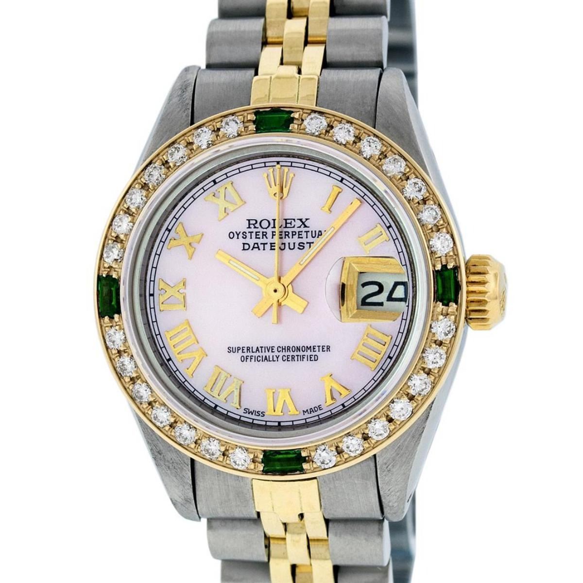 One Ladies Two Tone Rolex Datejust Polished, Serviced & Electronically Tested, Yellow Gold & Stainless Steel Case: 26mm, Yellow Gold Crown, Custom Bezel: New 18K Yellow Gold Emerald Beadset Diamond Bezel, Diamond + Gem Count: 28 Diamonds + 4 Emeralds Total Weight .70 Carat, Clarity: SI-VS, Color: G to H. Custom Crystal: New Scratch Resistant Synthetic Sapphire Cyclops Lens. Custom Hands: New Luminescent Hands. Movement: Automatic Winding Movement. Custom Dial: Pink Mother Of Pearl With Roman Hour Markers and Square Track. Date Window: 3 O'Clock Position Date Display, Model: Datejust, Condition: G-6 Extra Fine. Bracelet: Two Tone Yellow Gold & Stainless Steel Jubilee Band. Bright Polish. 6.0 Inch Length, Adjustable. Standard Clasp, With Rolex Logo. This Watch Has Been Serviced Time Tested And Is In Excellent Condition It Is Free Of All Scratches And Dents.