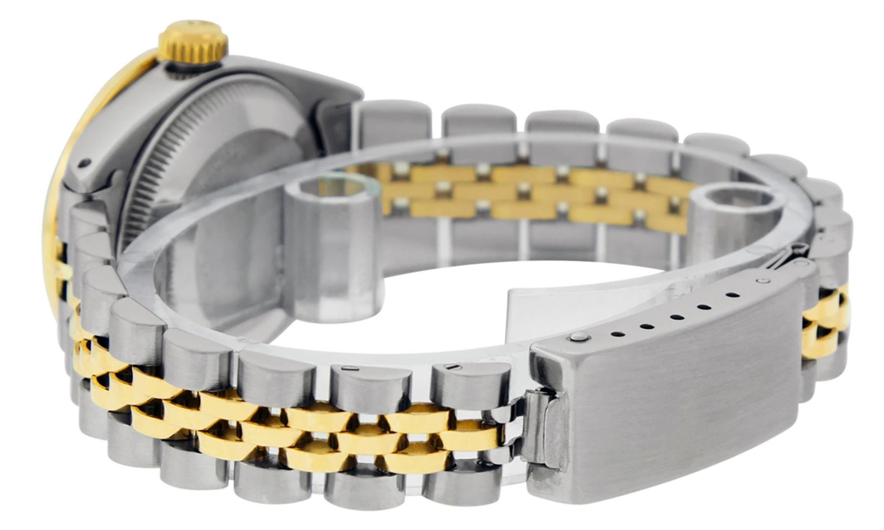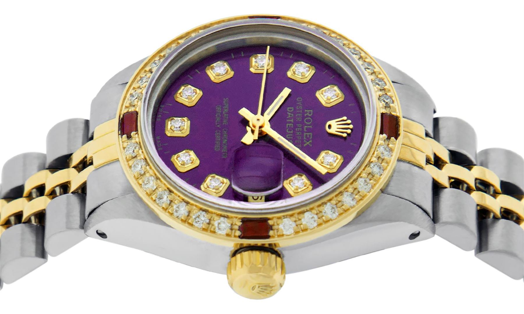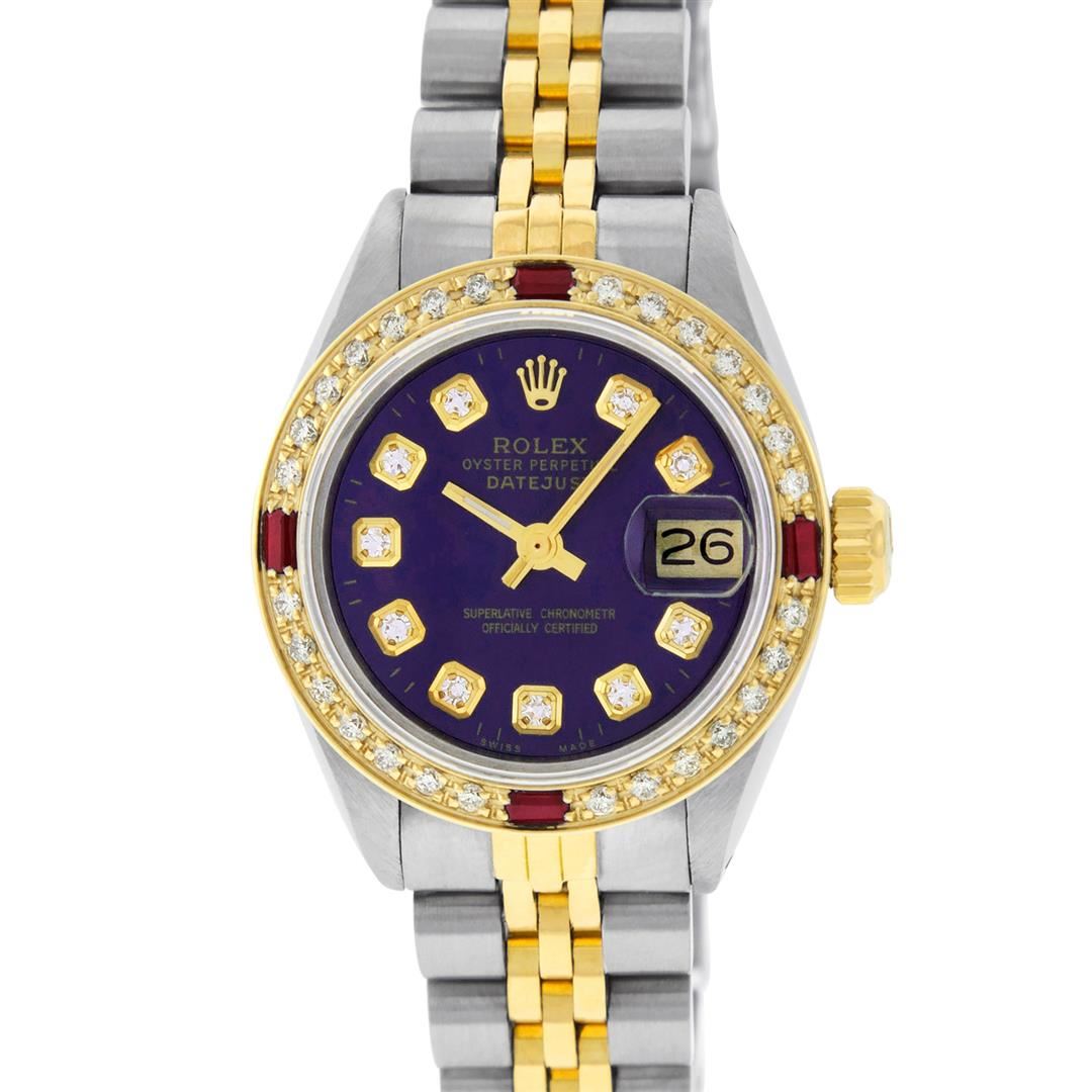 One Ladies 14K Two Tone Rolex Datejust Polished, Serviced & Electronically Tested, 14K Yellow Gold & Stainless Steel Case: 26mm, 14K Yellow Gold Crown, Custom Bezel: New 18K Yellow Gold Ruby Beadset Diamond Bezel, Diamond + Gem Count: 28 Diamonds + 4 Rubies Total Weight .70 Carat, Clarity: SI-VS, Color: G to H. Custom Crystal: New Scratch Resistant Synthetic Sapphire Cyclops Lens. Custom Hands: New Luminescent Hands. Movement: Automatic Winding Movement Caliber 2030. Custom Dial: Purple Dial Set With Single Cut Diamond Hour Markers & Dash Track, Diamond Count: 10 Diamond in Dial, G To H In Color, SI-VS Clarity. Date Window: 3 O'Clock Position Date Display, Model: Datejust, Condition: G-6 Extra Fine. Bracelet: Two Tone 14K Yellow Gold & Stainless Steel Jubilee Band. Bright Polish. 6.0 Inch Length, Adjustable. Standard Clasp, With Rolex Logo. This Watch Has Been Serviced Time Tested And Is In Excellent Condition It Is Free Of All Scratches And Dents.